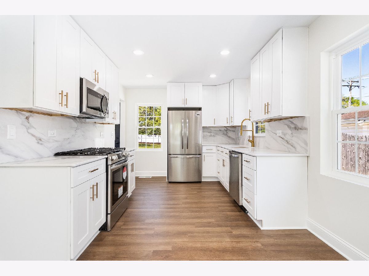 *MULTIPLE OFFERS RECEIVED HIGHEST & BEST DUE BY NOON SUNDAY MAY 5TH* Beautifully remodeled Raynor Park mid century ranch with all relevant work inspected-permitted-approved through City of Joliet stuns with modern efficient finishes inside and out, reimagined open flowing floorplan boasts LVP flooring throughout the main level with front living room featuring abundant LED recessed lighting and picture window overlooking the front yard, the new kitchen features features quartz counters and matching slab backsplash with copper veining-mission style soft close cabinetry with 42" uppers-champagne bronze hardware-stainless steel Frigidaire appliances-open pantry area-abundant LED recessed lighting, new first floor powder room includes furniture style vanity with champagne bronze hardware, new hallways include designer lighting with night light feature, new master bedroom features lighted ceiling fan and walk-in closet, new main bath boasts designer furniture style vanity-cast iron tub-subway tile surround with accent & cubby-champagne bronze hardware including rain shower, new interior paint and hardware throughout the home, new Pella windows throughout the home, new pluming throughout the home, new front art glass entry door, new 5&1/4" baseboard and 2 panel arched interior doors throughout the home, new closets throughout the home, new rear entry door in from the 14x16 concrete patio, new exterior covered GFCI outlets, new dutch lap premium siding with additional pink board insulation added beneath, new gutters-facia-soffit, architectural grade shingle roof and vinyl fence approximately 3 years old, new exterior sump pump, new full driveway, full basement features new carbon kevlar strap stabilization with lifetime warranty and drylock/painted walls with dryfall ceiling, new 360 degree landscaping, new central air & recent furnace, recent 21&1/2' x 20&1/2' Danley built garage with dedicated service panel and service door, spacious deep rear yard. all this just 2 blocks from St. Joes and Garnsey Parks, make memories here!!