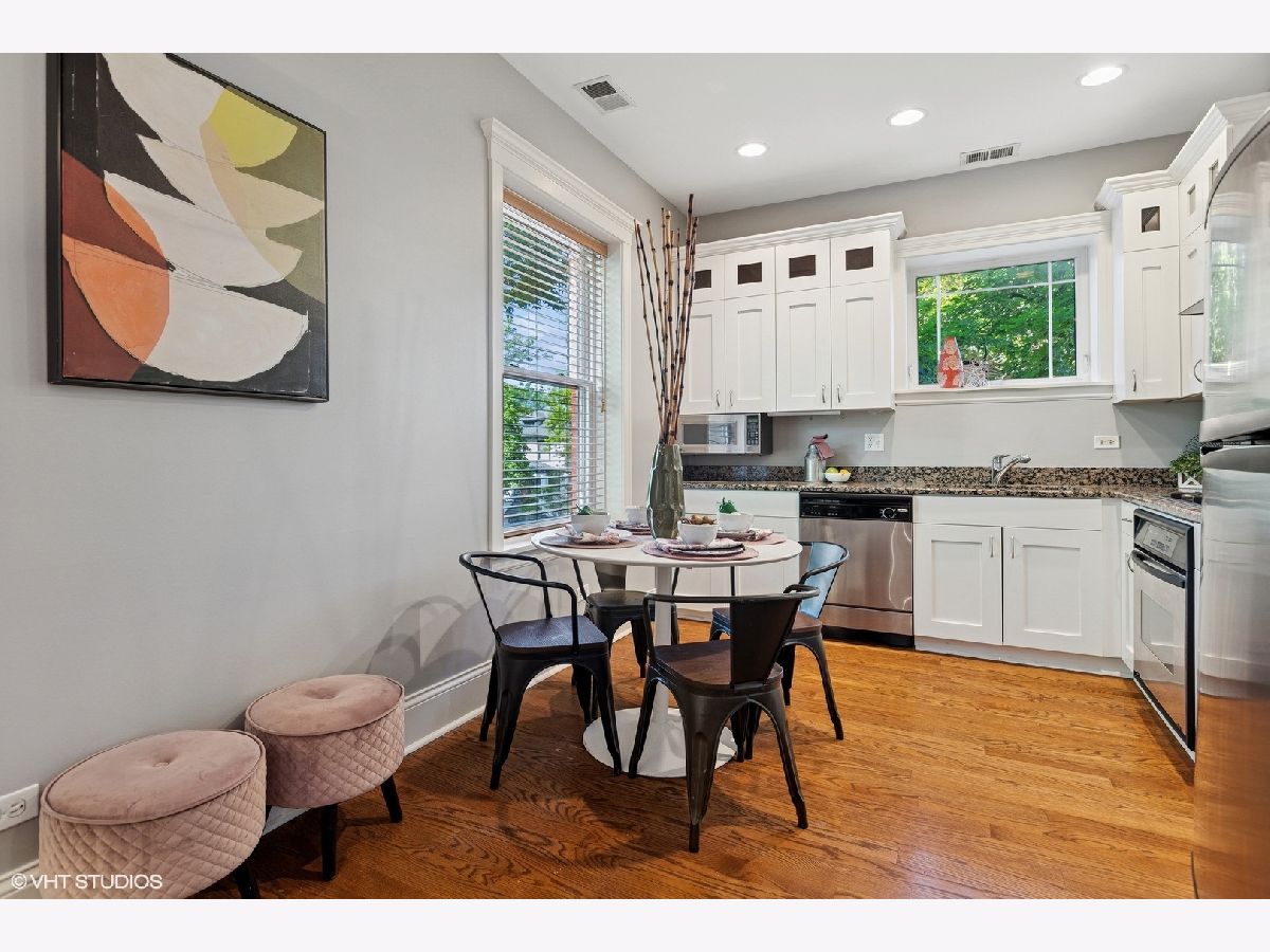 Lovely and bright corner 2bed/2bath in charming Andersonville/Edgewater! Modern updates in a solid brick vintage building. With south and west exposures, the natural light is amazing! The open floorplan allows the light all the way in, with kitchen, dining and living spaces all on the south wall. Featuring a large kitchen, stainless steel appliances, lots of granite counter space and recently painted white cabinets. The split floorplan promotes privacy between bedrooms. Primary bedroom has a nice en suite bathroom. Good-sized bedrooms both, with organized closets. Both bathrooms are well-appointed with marble tile. Hardwood floors throughout in excellent condition, and freshly painted walls. The back deck provides a nice space to grill or relax and get your reading in. Gas forced heat and central AC, as well as in-unit laundry. Large private basement storage room included. Open bike storage as well. Great location close to Clark Street and all that Andersonville provides, as well as a short walk to Broadway. Bryn Mawr red line also nearby for quick trips both south to the city or north to Evanston. The lakefront is also walkable. Professionally managed building.