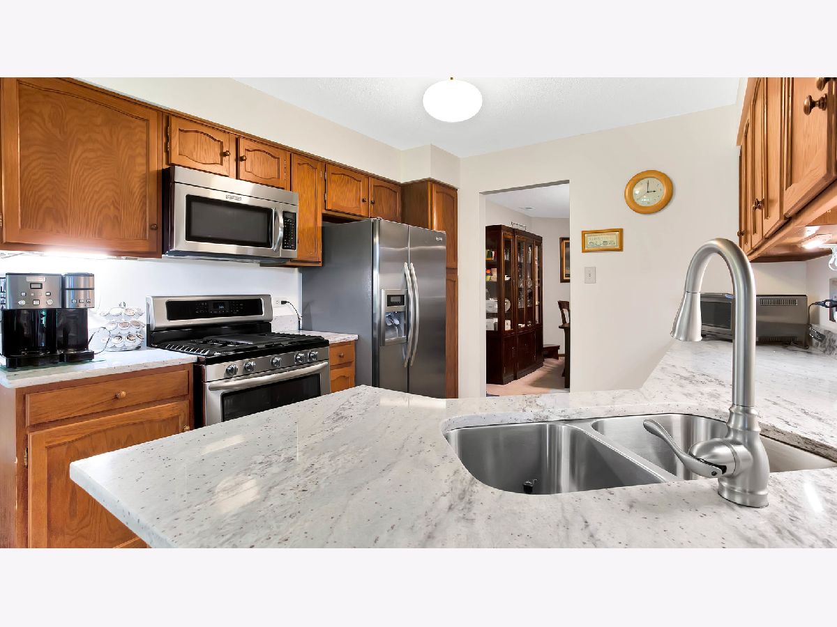 Desirable golf course view makes this 2nd floor condo a refuge. Updated, spacious eat-in kitchen has newer stainless steel appliances, new (2020) granite counter-tops and a bay window in the dinette. This 3 bedroom, 2 full bath unit includes spacious master bedroom with an attached full bath, and a large walk-in closet with new (2019) Closets by Design organizer. Newer gray carpeting and neutral colors throughout. Open floor plan living room with fireplace has attached dining room. Other features include sizable 2nd and 3rd bedrooms and an extra-large tub in the second bath. Solid oak doors and Flexicore construction promote peace and serenity. Additional space in this home includes an office nook and storage room, each with a gable window for natural light and a cross breeze. New (2019) Maytag washer and dryer included in-suite. New water heater (2019). Second fridge in storage area. Large, private balcony accessed through the living room and kitchen looks out on a well-manicured golf course. Attached one-car garage with extra storage space. Take advantage of the low property taxes. Enjoy the lifestyle of Oak Hills that includes a swimming pool, clubhouse and more.
