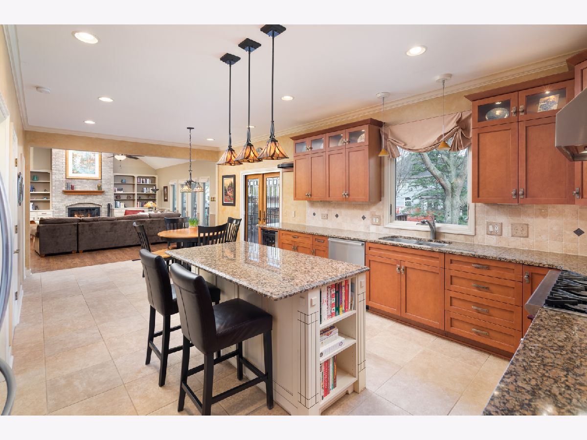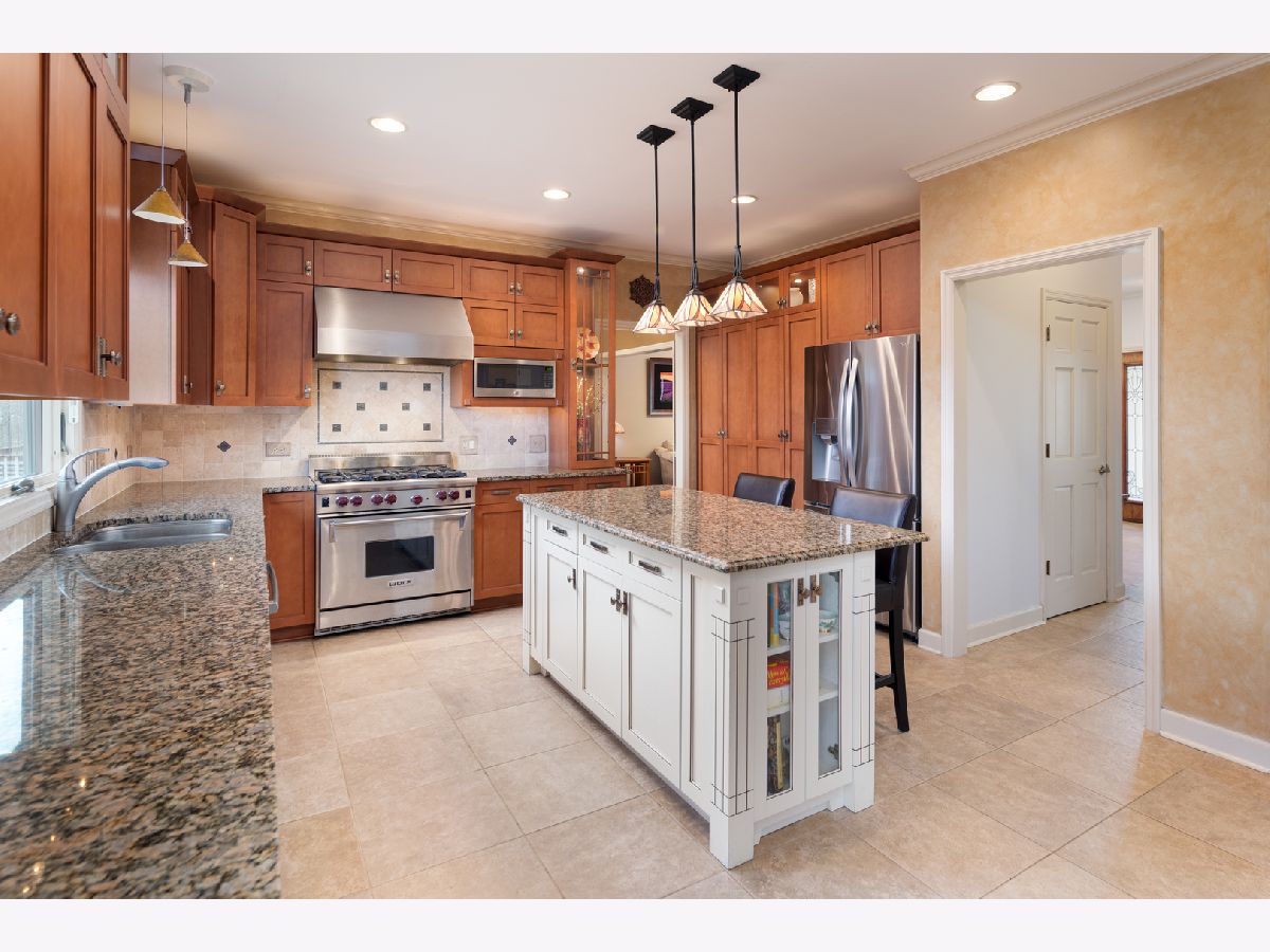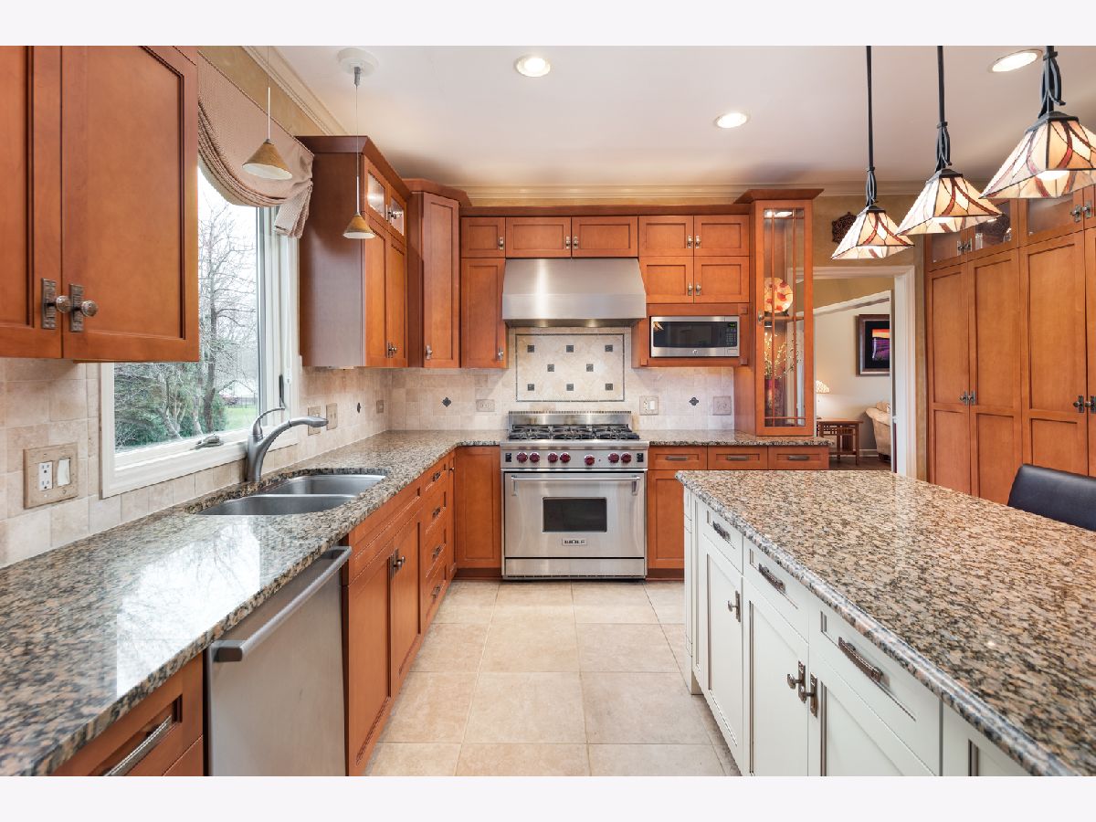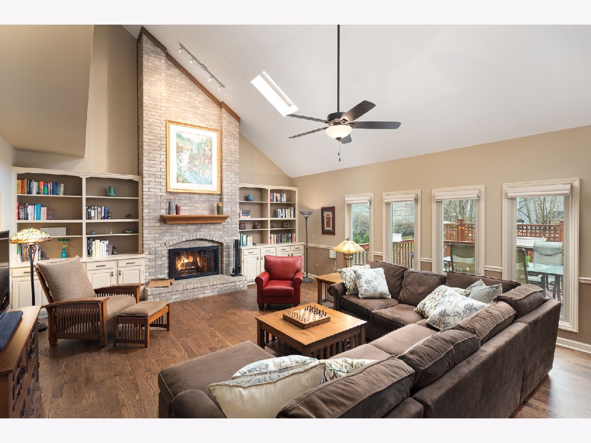 Beautifully situated in the sought after north Naperville West Wind subdivision, this five bedroom home will capture your heart from the moment you enter the two-story foyer. The bright and open prairie-style kitchen is perfect for entertaining with its granite countertops, under-counter beverage center and 6-burner Wolf stove and oven. High-end custom wood cabinets also feature a floor to ceiling pantry with plenty of storage, and the large island offers seating. Leaded glass doors open off the kitchen dining area onto the two-level large deck perfect for grilling and outdoor living. The fenced-in yard showcases professional landscaping and mature plants. For more formal seating, the spacious dining room has a tray ceiling and oak flooring and the living room has crown molding. The vaulted ceilings with skylights and large windows in the family room invite sunlight, and the wood burning fireplace features a floor to ceiling brick surround and wood built-ins. The family room also has a wet bar tucked in the corner and a second floor overlook and wood floors. The first-floor office with crown molding and a closet could double as a bedroom. A half-bath with granite counters and a laundry/mud room finishes the first floor. Upstairs, the master suite offers a private loft sitting area with morning light overlooking the foyer, cathedral ceilings, and a large walk-in closet with custom organizer. The master bath impresses with a dual travertine shower, jacuzzi tub with travertine surround, and granite counters. Four good-sized bedrooms, a hall bath with dual sinks and granite counters, and a laundry chute complete the second floor. The carpeted finished basement has a bar and is wired for music. A finished storage area provides additional space. A solar-thermal water heater working in tandem with a secondary water tank increases the efficiency of the home, and the three-car garage has epoxy flooring. Exterior illumination and a covered porch welcome you home.