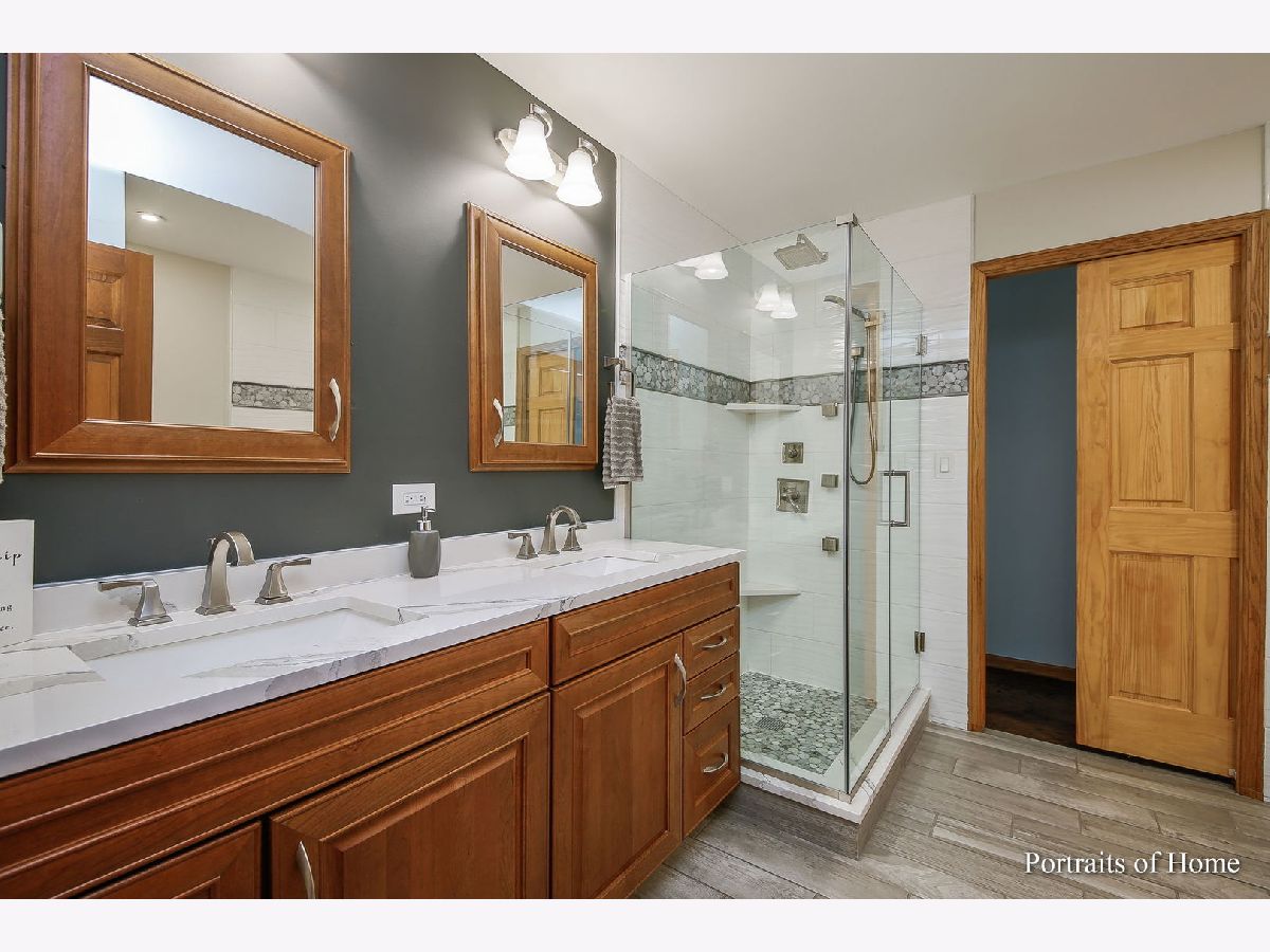Gorgeous custom brick two-story home located on over .75 acres corner lot in Fox Pointe Estates. This 5 bedroom, 3.5 bath home with two possible master suits will exceed your expectations. Beautiful hardwood flooring throughout the main level, vaulted ceilings, skylights, 6-panel doors, & built-ins are some of the great features this home offers. Custom gourmet eat-in kitchen boasts rich cherry wood cabinetry, large island for extra seating and serving, built-in buffet with extra storage, quartz countertops, all stainless steel appliances, travertine backsplash, can lighting and up lighting above cabinets. Adjacent dining room perfect for entertaining. Spacious family room has a brick wood-burning fireplace, dry bar with granite, skylights, & wall to wall custom built-in bookcases. First-floor master bedroom has french doors, a large walk -in closet, & a spacious fully updated spa-like bath with double sinks, custom tiled shower and separate tub. Main level updated powder room. First floor level laundry/mud room with LG washer and dryer, built-ins, & utility sink. Take the gorgeous wood staircase with custom metal spindles to the second floor. Second master bedroom suite with two walk-in closets, hardwood floors, brand new luxurious master bathroom (2021). Relax in the freestanding oversized soaker tub, custom tile separate walk-in shower with rain head & full body sprayers, gorgeous mirrors, lighting & linen closet. Spacious second floor also includes 3 additional bedrooms with new carpet (2021) and a full bath. Great closet space throughout. Full unfinished English basement ready for your finishing touches. 2.5 car side load garage. Brand new patio (July 2021), firepit (2018)with gas starter for entertaining, 12 zone sprinkler system, Lake Michigan water. New furnace & A/C (2020), 3 sump pumps, 75-gallon hot water heater (2011). Low taxes!!! Great location near shopping, restaurants, and parks. Award wInning Blue Ribbon schools.