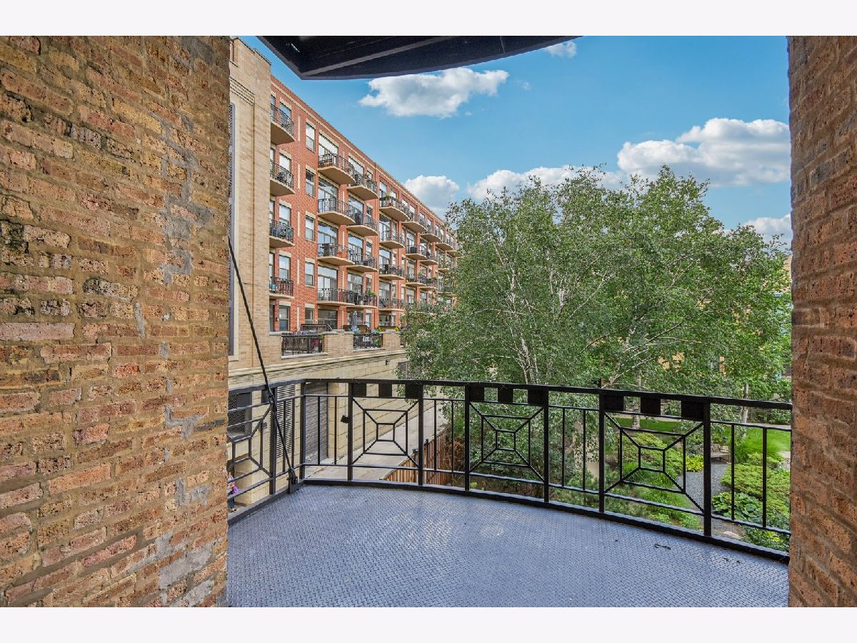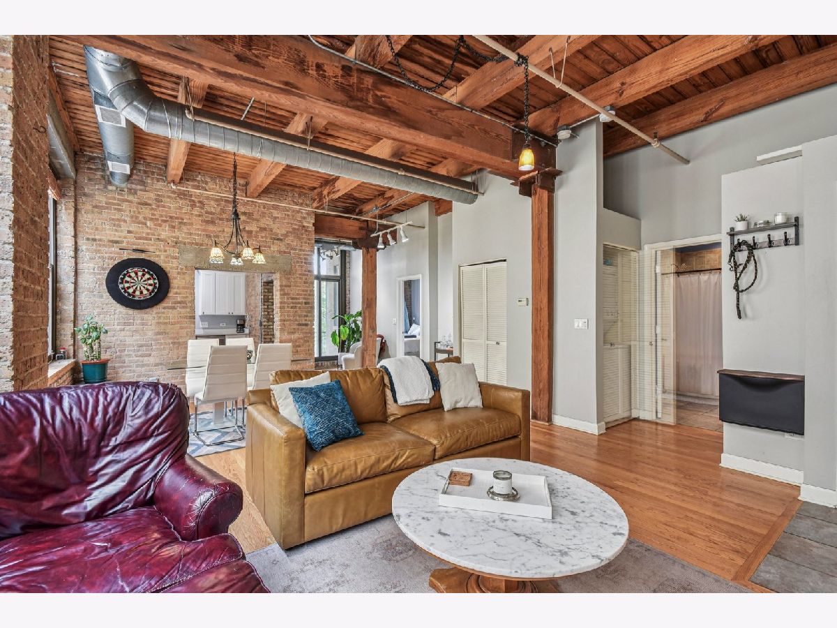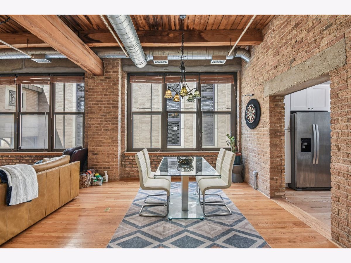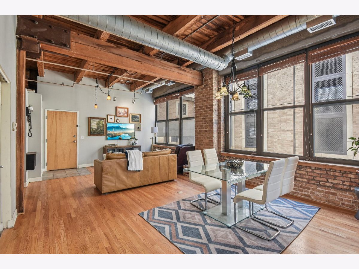 Experience loft living at its finest in this stunning 2 bed + den, 1 bath brick and timber corner unit. A dramatic north-facing wall of floor-to-ceiling windows floods the living and dining space with natural light, while east-facing windows in the kitchen and bedrooms offer peaceful views of the beautifully landscaped courtyard and koi pond. The beautifully updated kitchen features stainless steel appliances, granite countertops, and a pantry cabinet. Hardwood floors run throughout, and the flexible den with balcony access makes the perfect home office or additional living space. The spacious primary bedroom offers a walk-in closet and direct access to the large bathroom, which includes a dual vanity, soaking tub, and separate walk-in shower. The oversized, recessed private balcony provides a serene spot to relax or entertain. Additional highlights include in-unit laundry, customizable lighting fixtures in the living room, an attached garage parking space, and a large storage cage, all accessed via a secure walkway. Perfectly situated in a well-managed elevator building across from Skinner Park in the heart of the West Loop. Enjoy a prime location, close to world-class shopping, dining, and parks, with easy access to public transit and 90/94. This home blends industrial charm, modern comfort, and unbeatable convenience - truly a rare find!