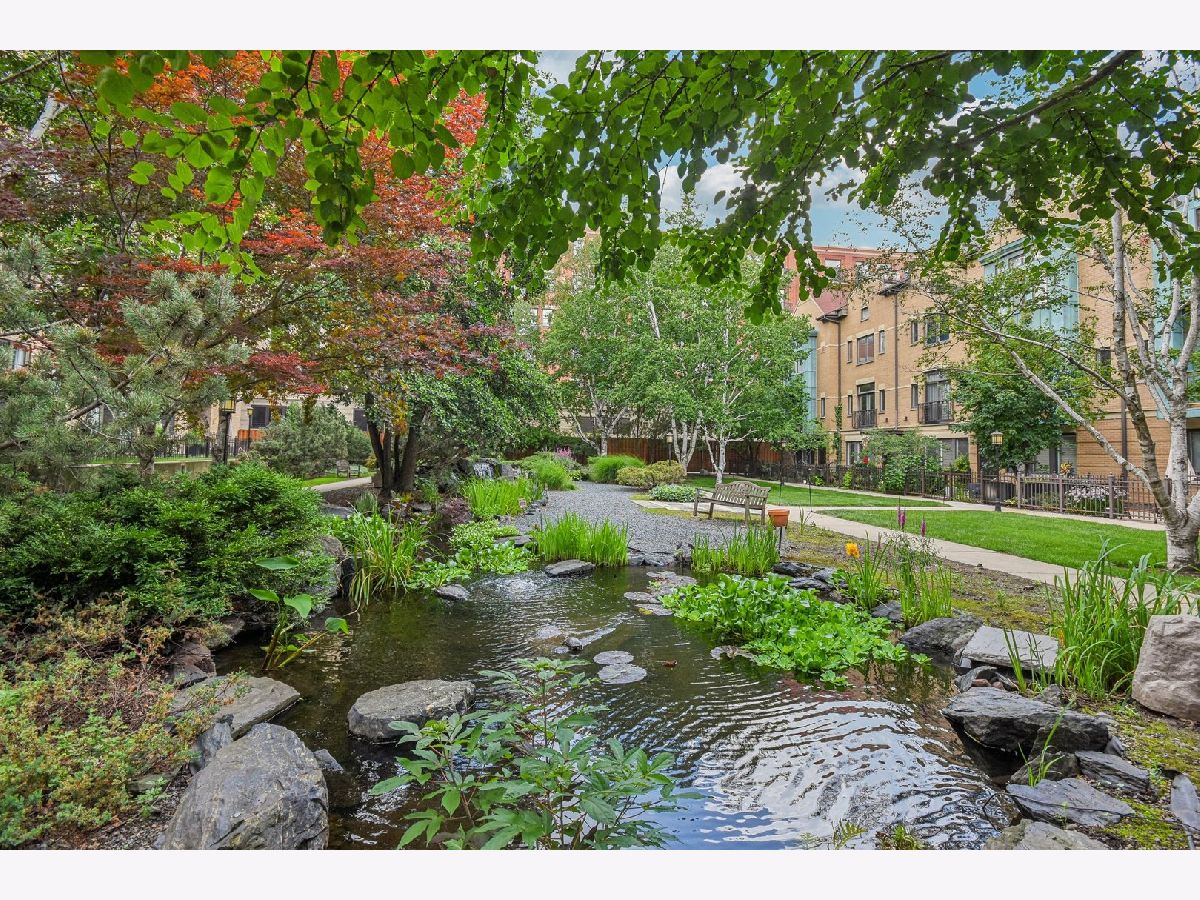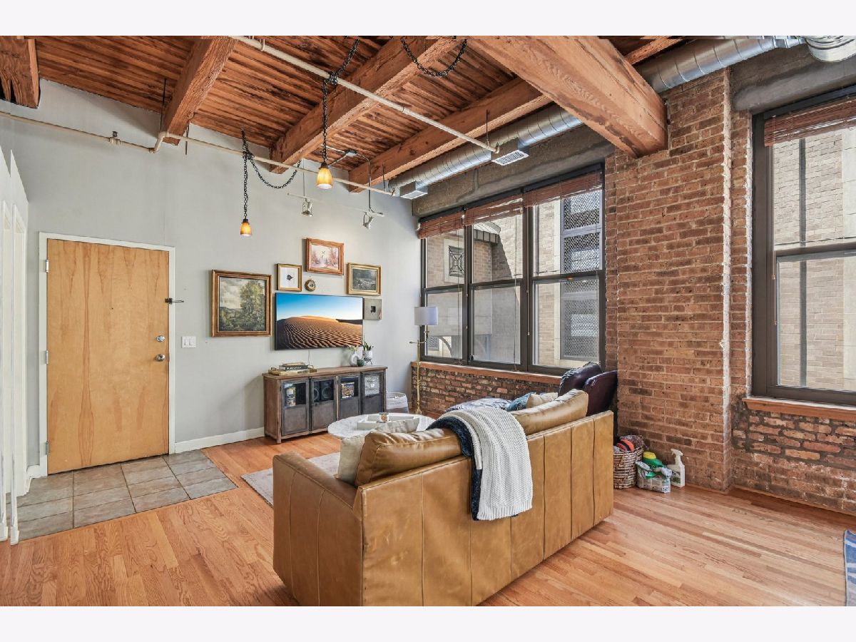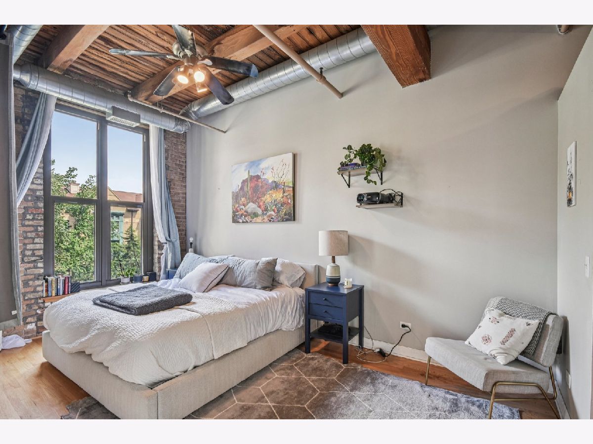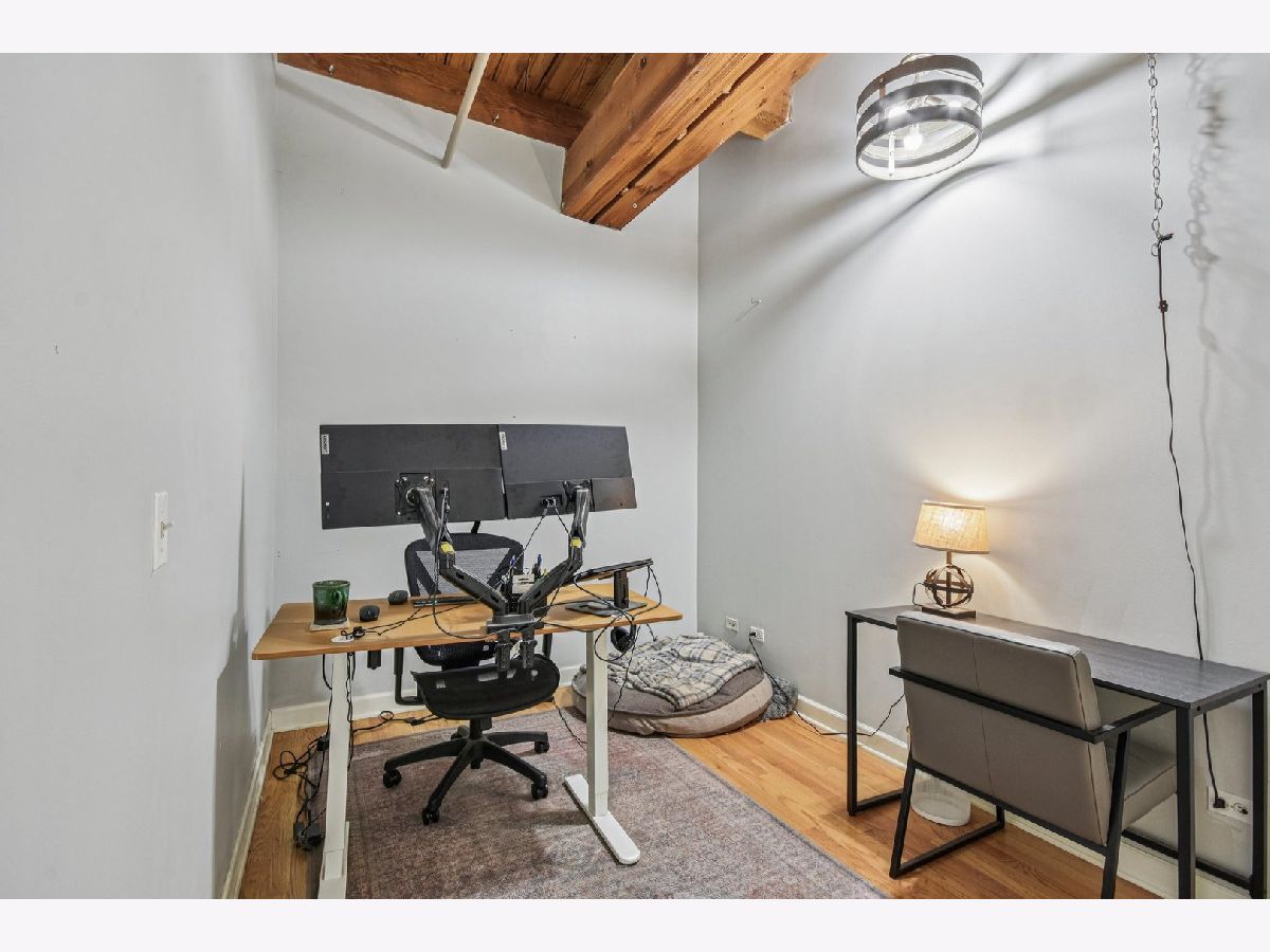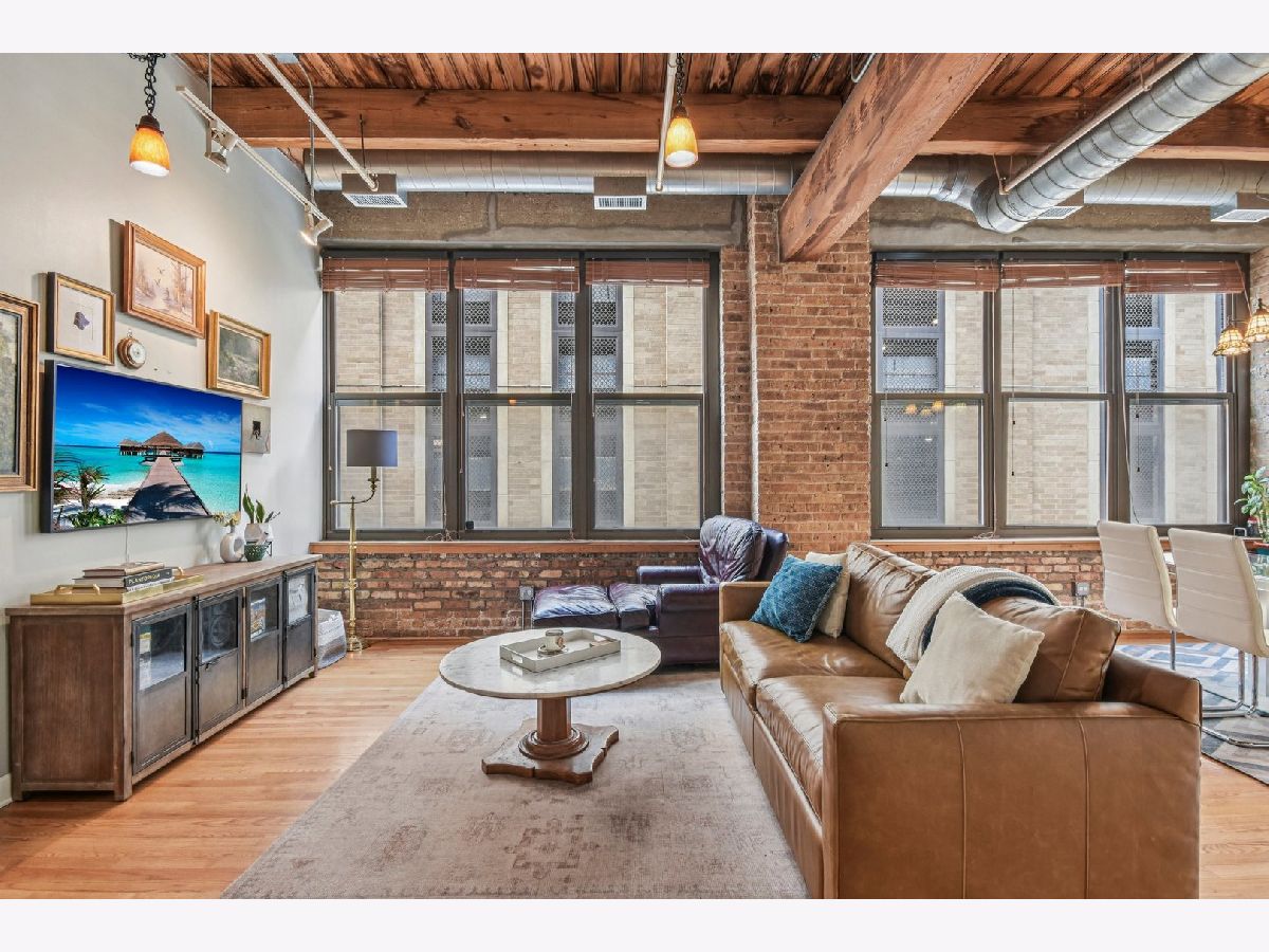 Experience loft living at its finest in this stunning 2 bed + den, 1 bath brick and timber corner unit. A dramatic north-facing wall of floor-to-ceiling windows floods the living and dining space with natural light, while east-facing windows in the kitchen and bedrooms offer peaceful views of the beautifully landscaped courtyard and koi pond. The beautifully updated kitchen features stainless steel appliances, granite countertops, and a pantry cabinet. Hardwood floors run throughout, and the flexible den with balcony access makes the perfect home office or additional living space. The spacious primary bedroom offers a walk-in closet and direct access to the large bathroom, which includes a dual vanity, soaking tub, and separate walk-in shower. The oversized, recessed private balcony provides a serene spot to relax or entertain. Additional highlights include in-unit laundry, customizable lighting fixtures in the living room, an attached garage parking space, and a large storage cage, all accessed via a secure walkway. Perfectly situated in a well-managed elevator building across from Skinner Park in the heart of the West Loop. Enjoy a prime location, close to world-class shopping, dining, and parks, with easy access to public transit and 90/94. This home blends industrial charm, modern comfort, and unbeatable convenience - truly a rare find!