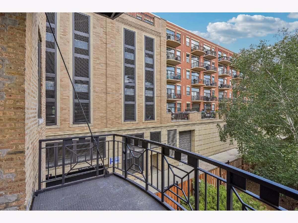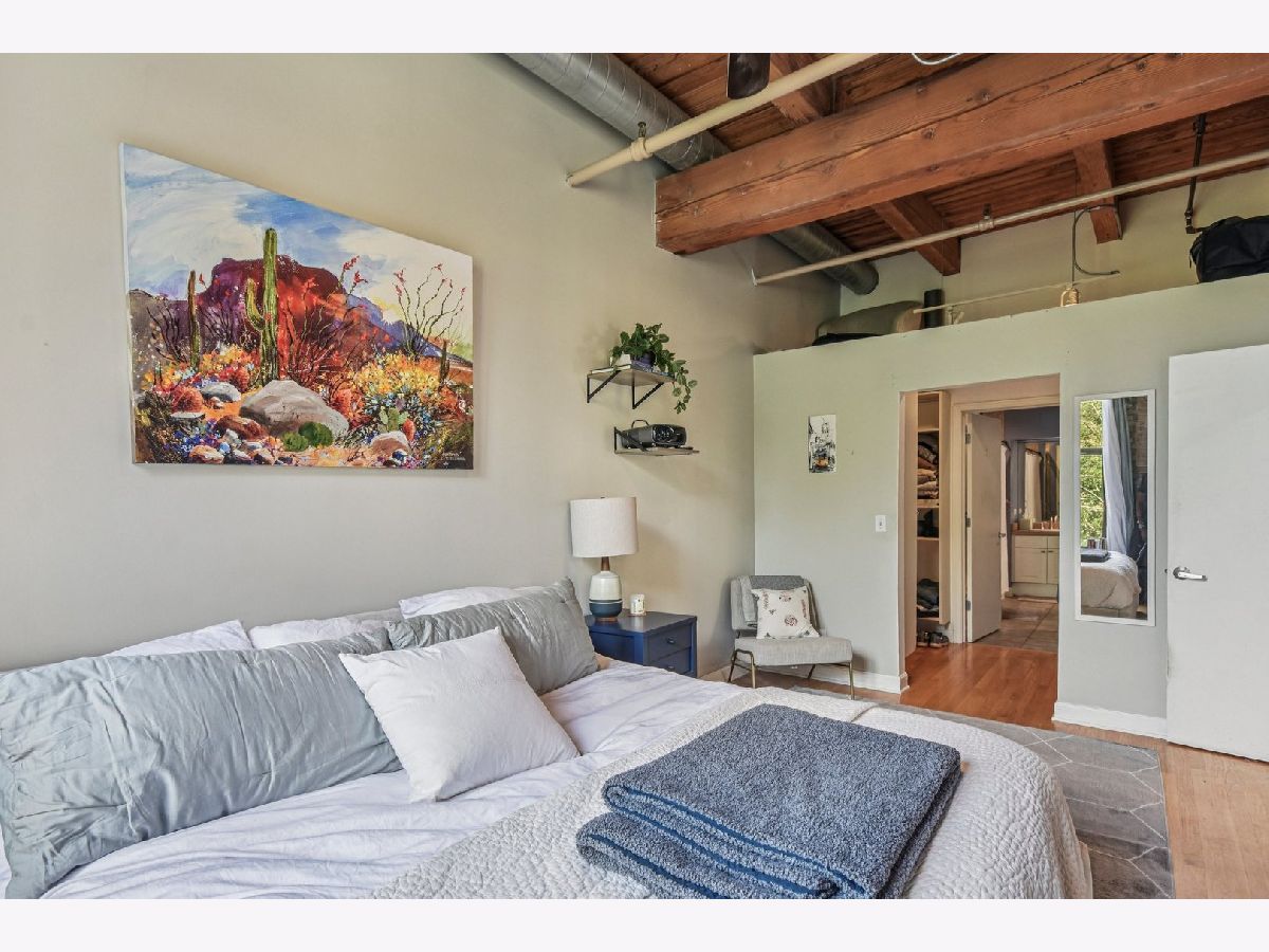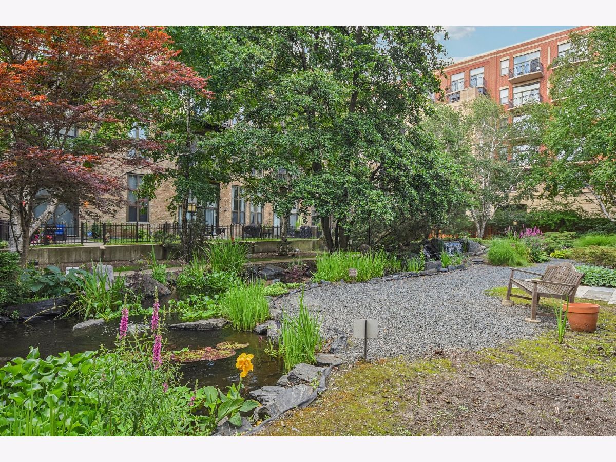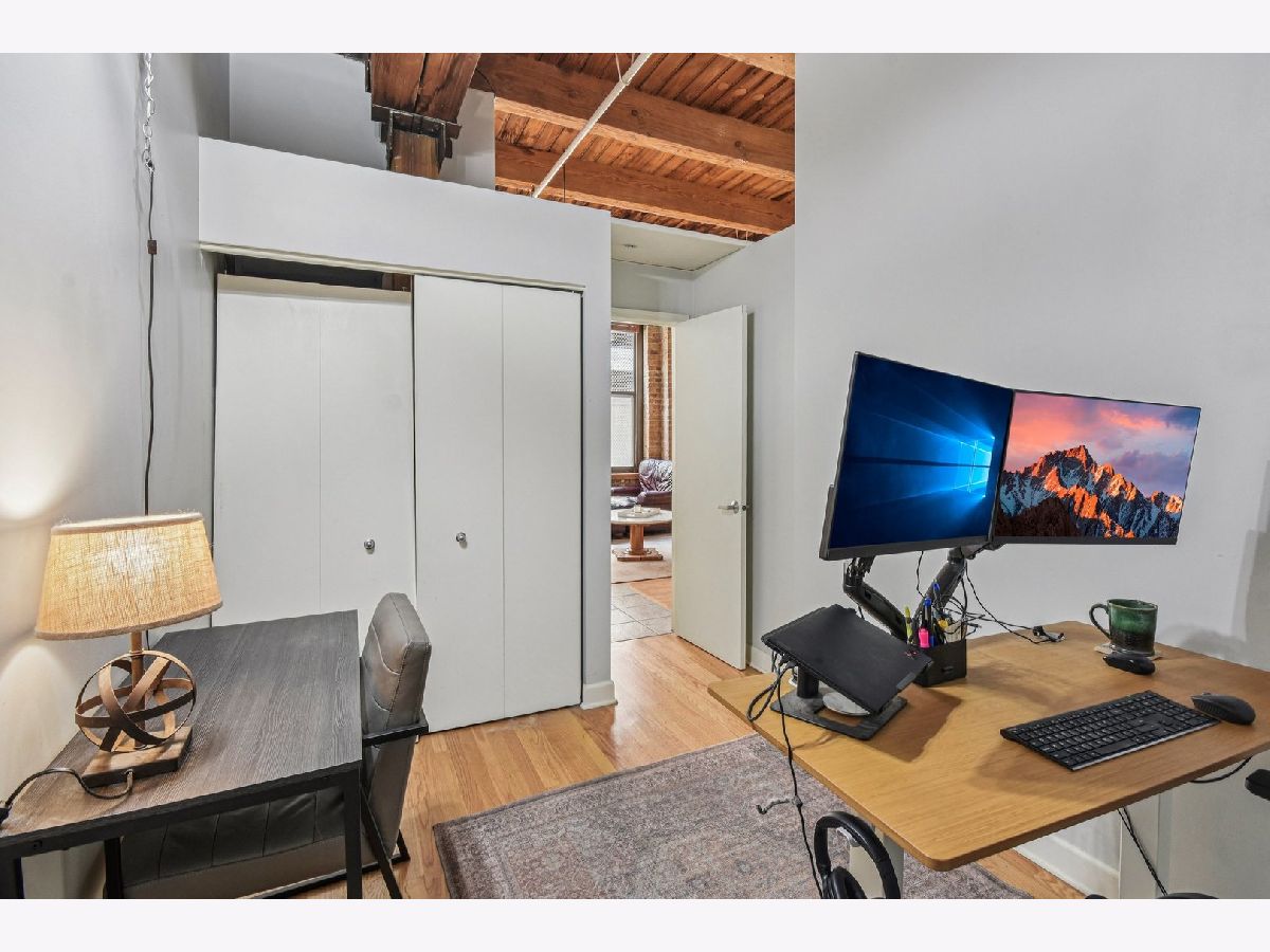 Experience loft living at its finest in this stunning 2 bed + den, 1 bath brick and timber corner unit. A dramatic north-facing wall of floor-to-ceiling windows floods the living and dining space with natural light, while east-facing windows in the kitchen and bedrooms offer peaceful views of the beautifully landscaped courtyard and koi pond. The beautifully updated kitchen features stainless steel appliances, granite countertops, and a pantry cabinet. Hardwood floors run throughout, and the flexible den with balcony access makes the perfect home office or additional living space. The spacious primary bedroom offers a walk-in closet and direct access to the large bathroom, which includes a dual vanity, soaking tub, and separate walk-in shower. The oversized, recessed private balcony provides a serene spot to relax or entertain. Additional highlights include in-unit laundry, customizable lighting fixtures in the living room, an attached garage parking space, and a large storage cage, all accessed via a secure walkway. Perfectly situated in a well-managed elevator building across from Skinner Park in the heart of the West Loop. Enjoy a prime location, close to world-class shopping, dining, and parks, with easy access to public transit and 90/94. This home blends industrial charm, modern comfort, and unbeatable convenience - truly a rare find!