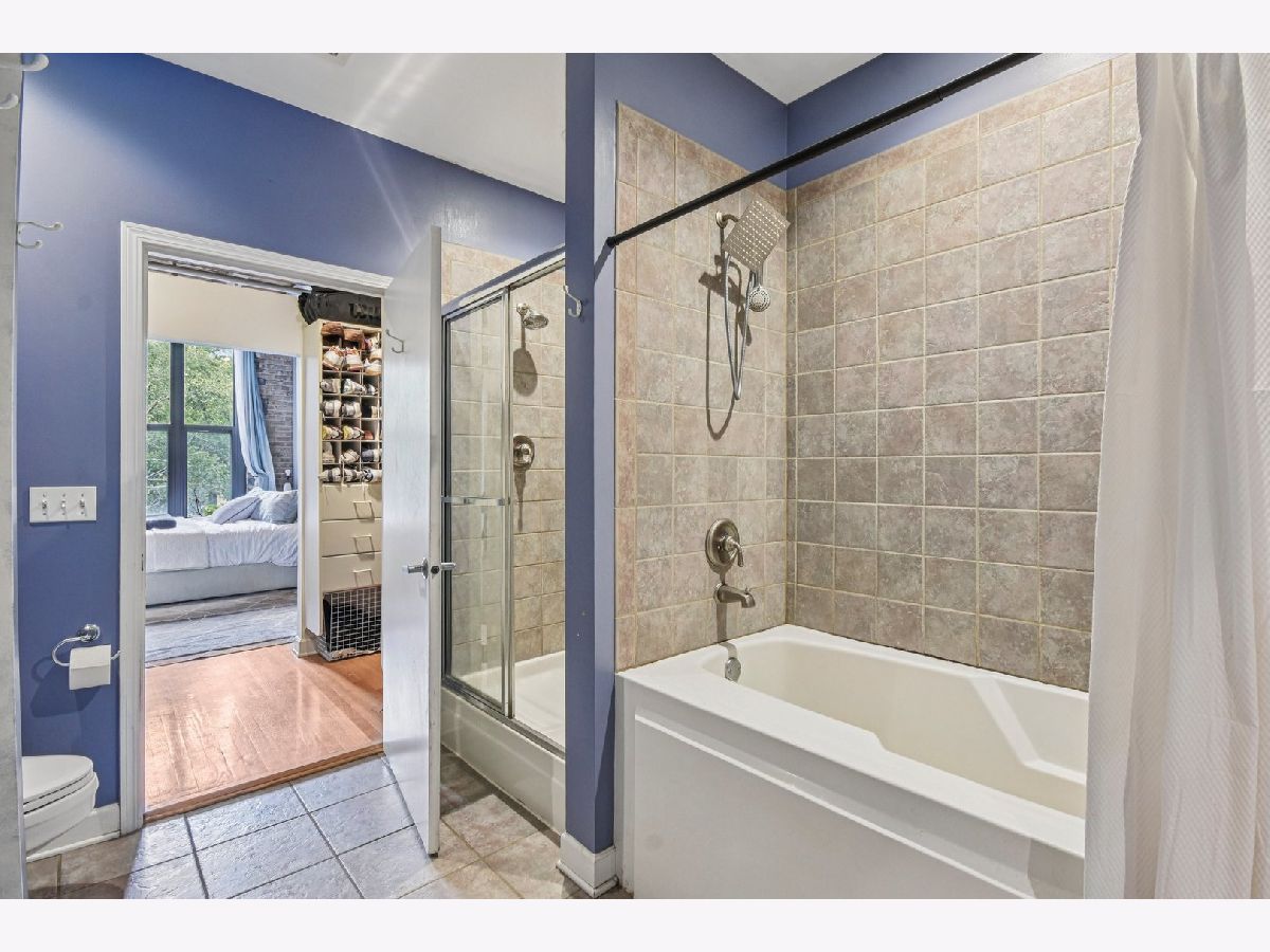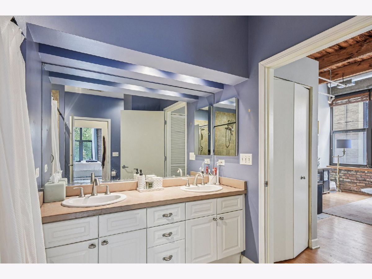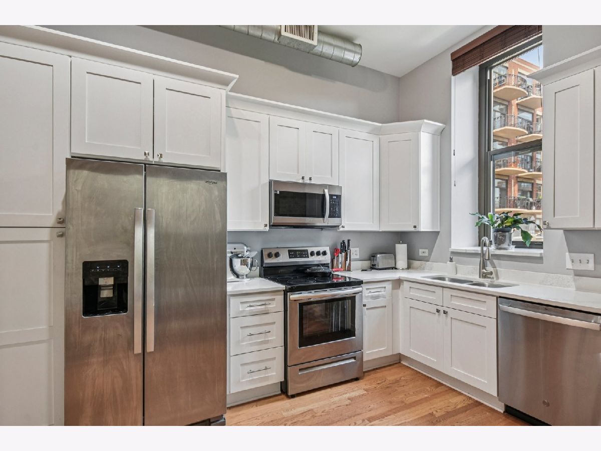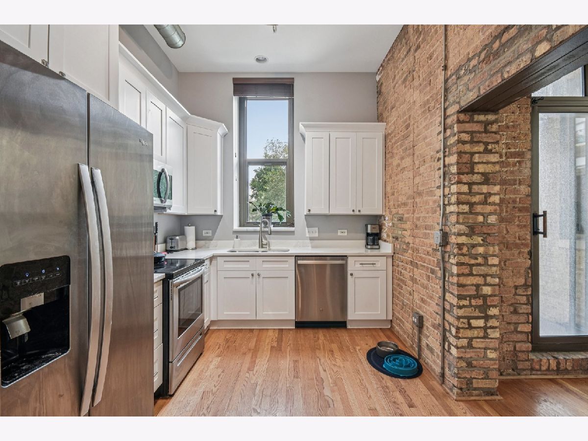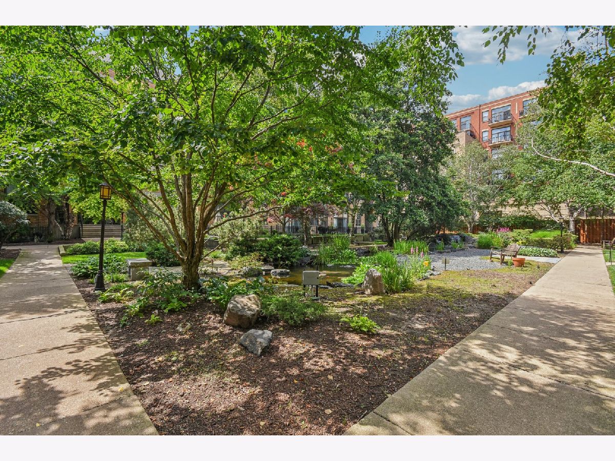 Experience loft living at its finest in this stunning 2 bed + den, 1 bath brick and timber corner unit. A dramatic north-facing wall of floor-to-ceiling windows floods the living and dining space with natural light, while east-facing windows in the kitchen and bedrooms offer peaceful views of the beautifully landscaped courtyard and koi pond. The beautifully updated kitchen features stainless steel appliances, granite countertops, and a pantry cabinet. Hardwood floors run throughout, and the flexible den with balcony access makes the perfect home office or additional living space. The spacious primary bedroom offers a walk-in closet and direct access to the large bathroom, which includes a dual vanity, soaking tub, and separate walk-in shower. The oversized, recessed private balcony provides a serene spot to relax or entertain. Additional highlights include in-unit laundry, customizable lighting fixtures in the living room, an attached garage parking space, and a large storage cage, all accessed via a secure walkway. Perfectly situated in a well-managed elevator building across from Skinner Park in the heart of the West Loop. Enjoy a prime location, close to world-class shopping, dining, and parks, with easy access to public transit and 90/94. This home blends industrial charm, modern comfort, and unbeatable convenience - truly a rare find!