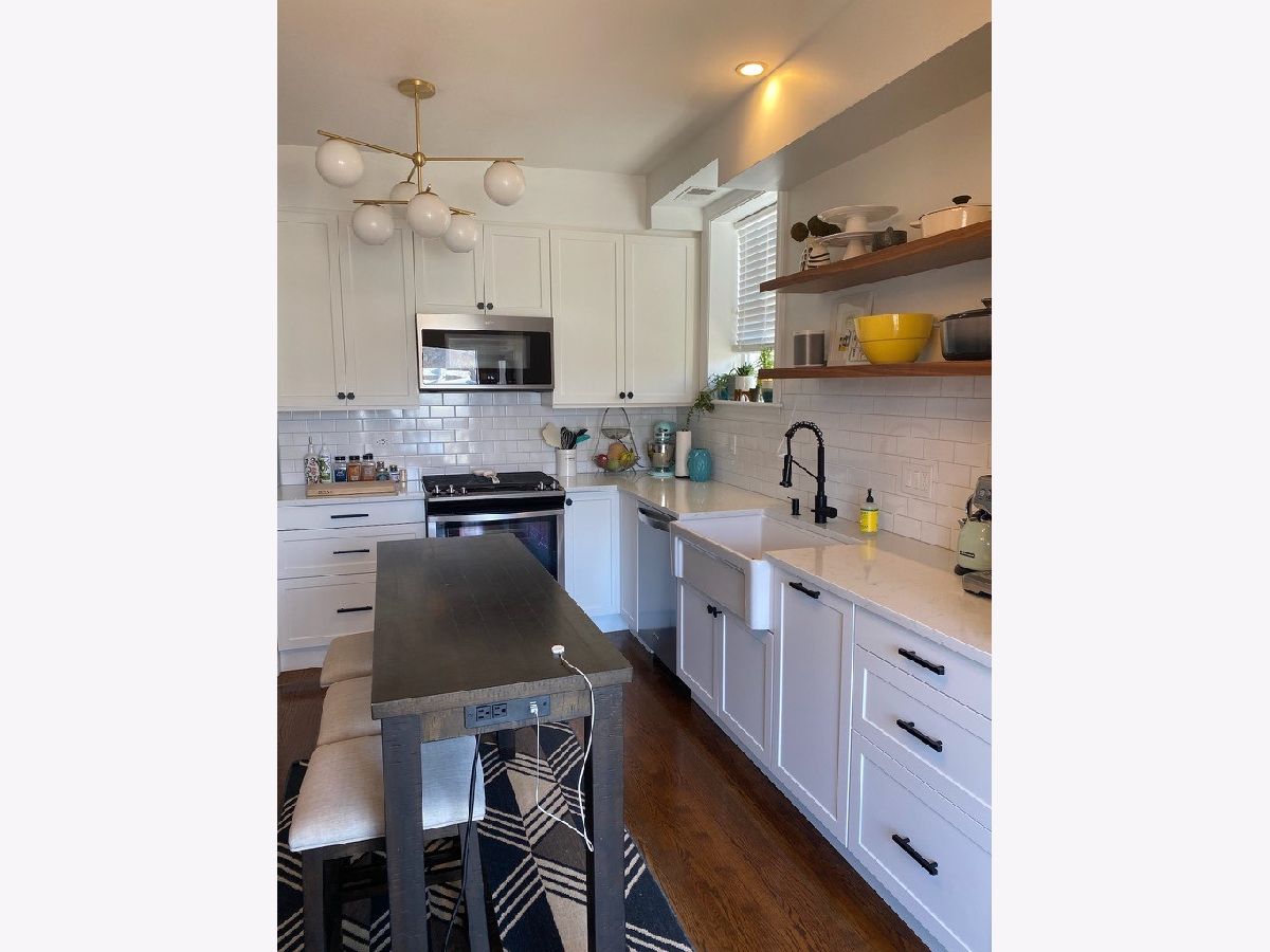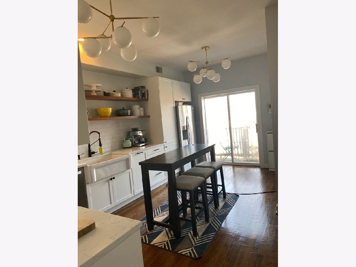Gorgeous two bedroom + sunroom in intimate 3 unit building in Edgewater Glen. Light flows into every room, with tree top views to quiet, tree lined Elmdale Ave. Thoughtful renovation which kept intact the vintage charm, trim, molding, original built-ins, and stained-glass windows flanking gas fireplace. Sprawling layout perfect for two people working at home, with large Living Room and spacious Sunroom, currently used as two-desk office. Gracious formal Dining room has space for an 8-person table and a new modern designer light fixture and large island Kitchen, with French doors leading to private deck. Recently renovated (2019) Chef's kitchen features crisp white cabinets, pantry cabinets with pull-out shelves, farm sink, stainless steel appliances, backsplash, floating shelves, tons of quartz counterspace, center island/table and gorgeous light fixtures. recently renovated bathroom with timeless tilework. Condo has hardwood floors, new in unit Washer/Dryer (2018) and tons of light. Parking spot and storage unit included. Minutes to Whole Foods, Walgreens, In Fine Spirits, Indie, Mas Alla Del Sol, Mango Pickle, Little Corner, Moody's and Broadway Cellars, Lakefront...and more!!! Short two blocks to Red Line train, close to restaurants and shopping in Andersonville.