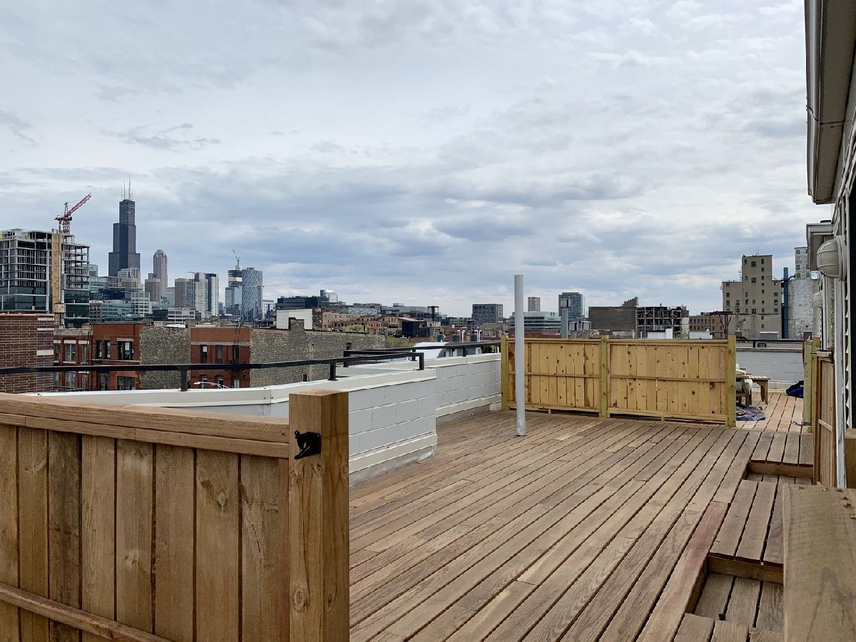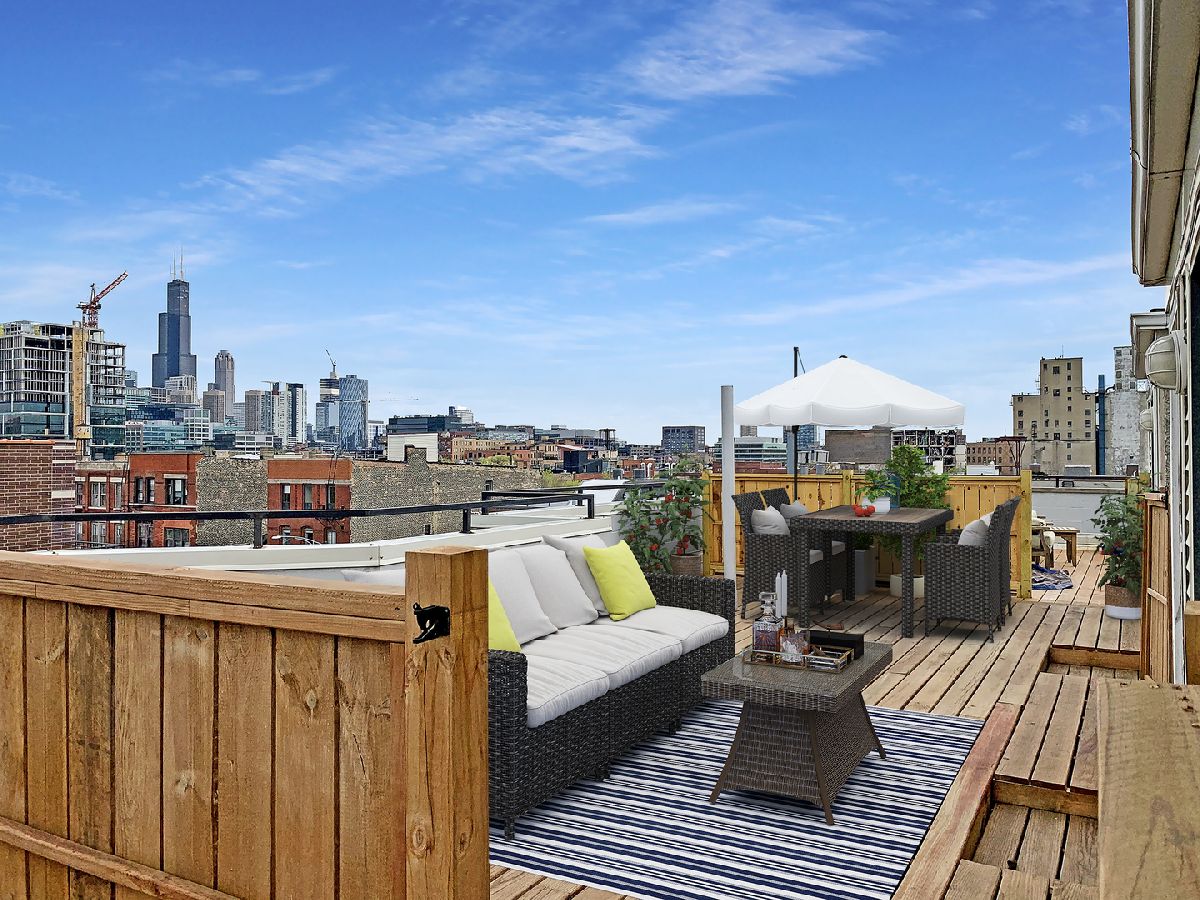 Incredible opportunity to own this 2 bedroom/ 2 bath plus den unit which meets the needs of today's buyers: tons of sunlight, high ceilings, hardwood floors, functional floor plan with a lot of flexible spaces, balconies, and a private roof deck with amazing skyline views! Oversized dining/living area with fireplace is bright and sunny, and perfect for entertaining. The large kitchen features ample storage and huge granite counter space which easily can accommodate informal dining. The refrigerator, microwave and dishwasher were recently replaced. The primary ensuite bedroom has both a walk-in and wall to wall closets that have been organized with Elfie shelving to maximize utility. The gracious primary marble bath has both a separate shower and soaking tub plus deep, double bowl sinks. Kohler fixtures throughout. The balcony of the ensuite is a great place for a morning coffee. The second bedroom can serve many functions with the potential uses as work from home 2nd office/den or a guest room. The home has extra high (12F) ceilings with crown moldings, wood flooring throughout, a separate laundry room, and it was professionally painted and cleaned. Assigned, gated 1 parking space is included in the price. Vibrant West Town neighborhood with dining, shopping, nightlife a few steps away, right between 290 and 90. Added value: brand new 50-gallon boiler, SS high-end fridge, newer maintenance free roof deck.