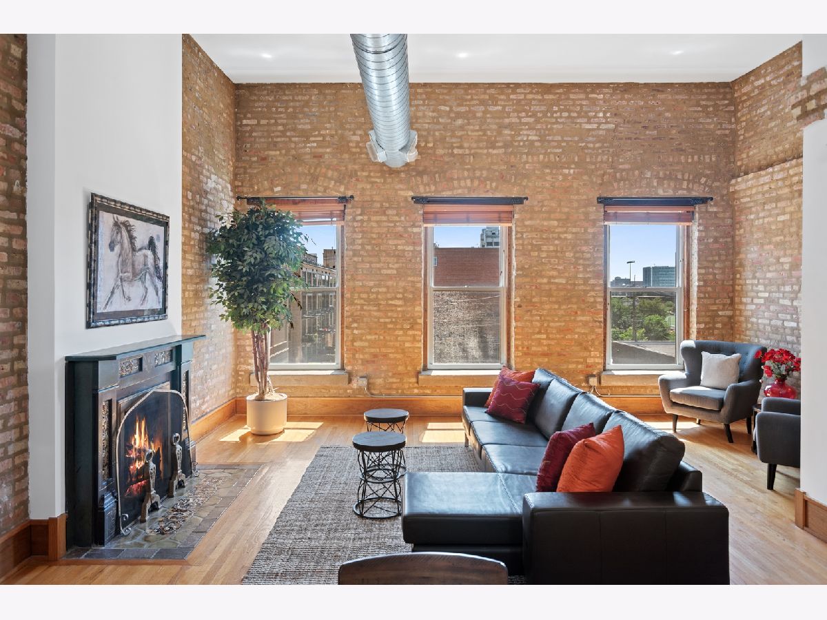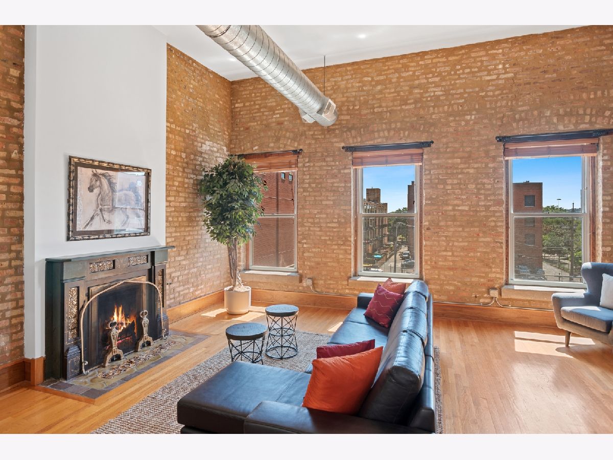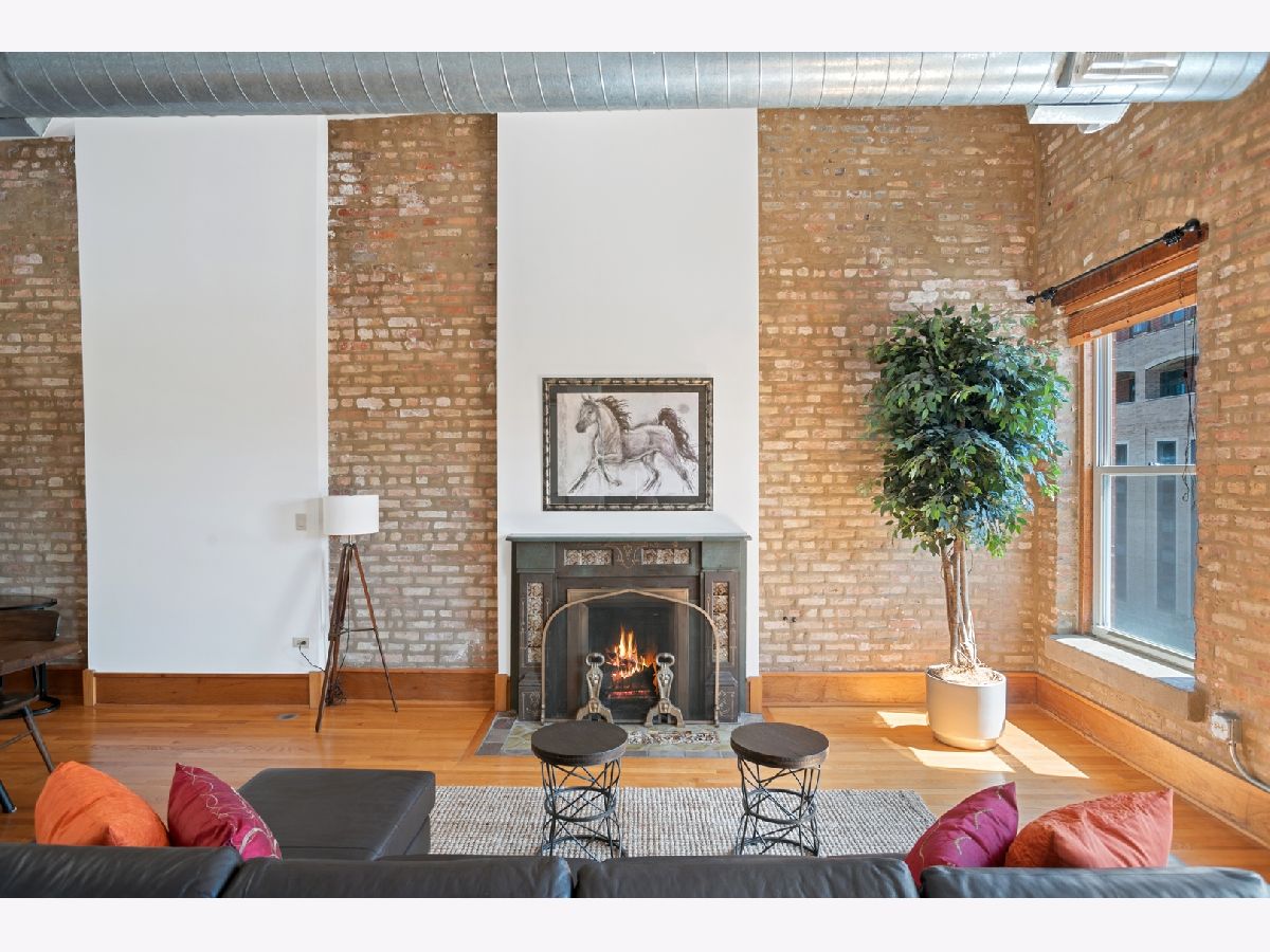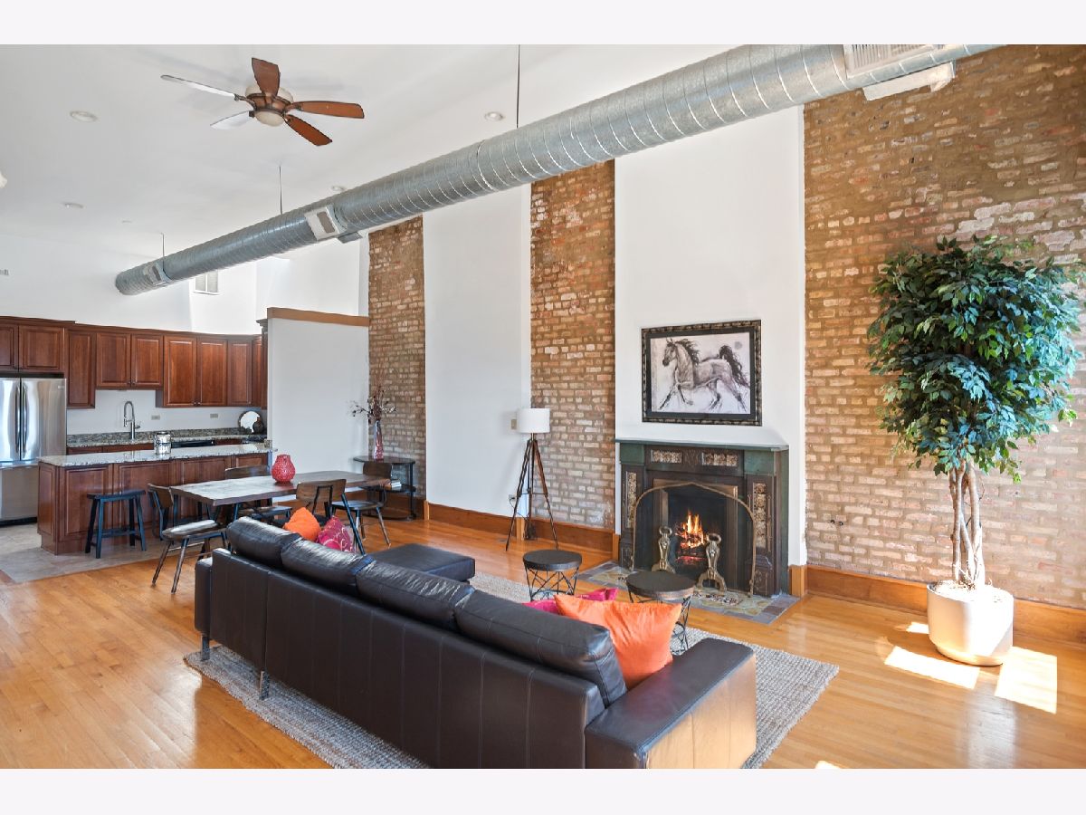 PENTHOUSE LOFT! ELEVATOR! Southern exposure and skylights flood this beautiful 2 bed/2bath loft home with sunlight. 14' Ceilings, exposed brick, vintage details and hardwood floors throughout make for an incredibly special home with tons of character! Super spacious kitchen with breakfast bar and stainless appliances. Oversized living room with statement wood burning fireplace and very generous dining space for 8 person dining table. Laundry room with side by side Washer/Dryer. Both bedrooms have fully enclosed walls. Great storage and large deck. Garage parking 25K. Low assessments and this prime West Loop location make this an absolute find!