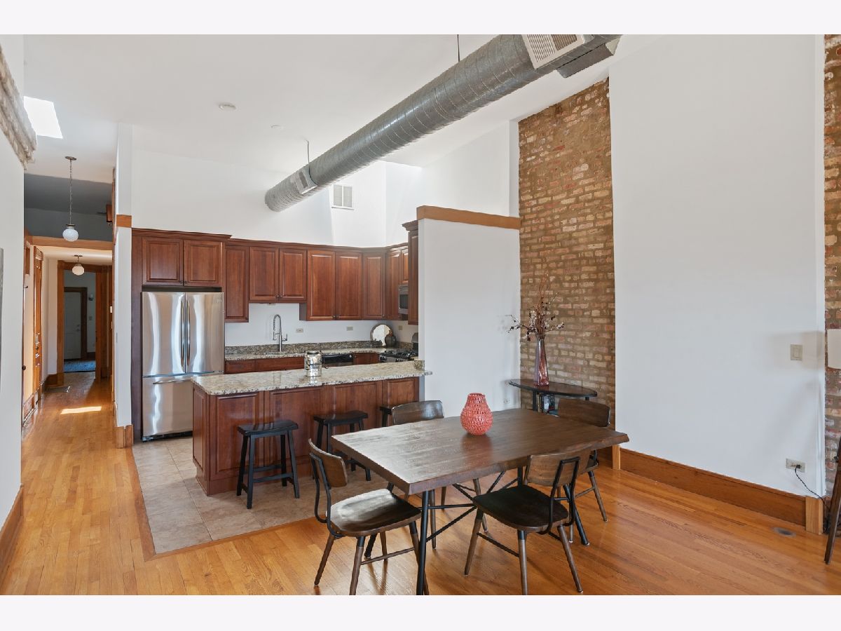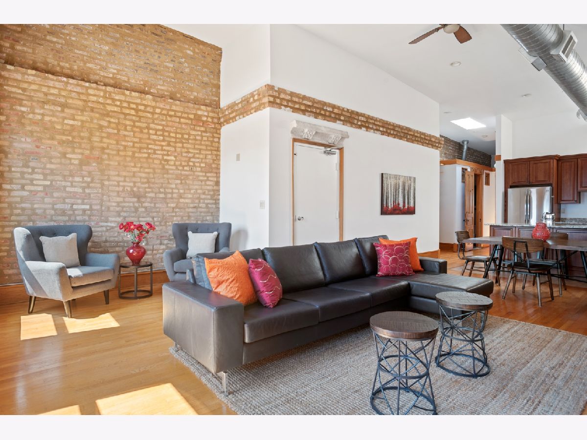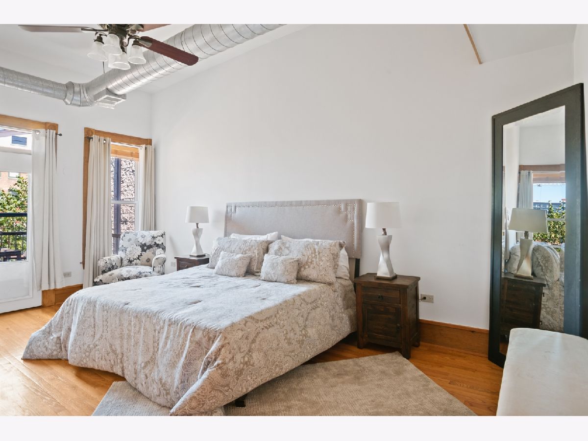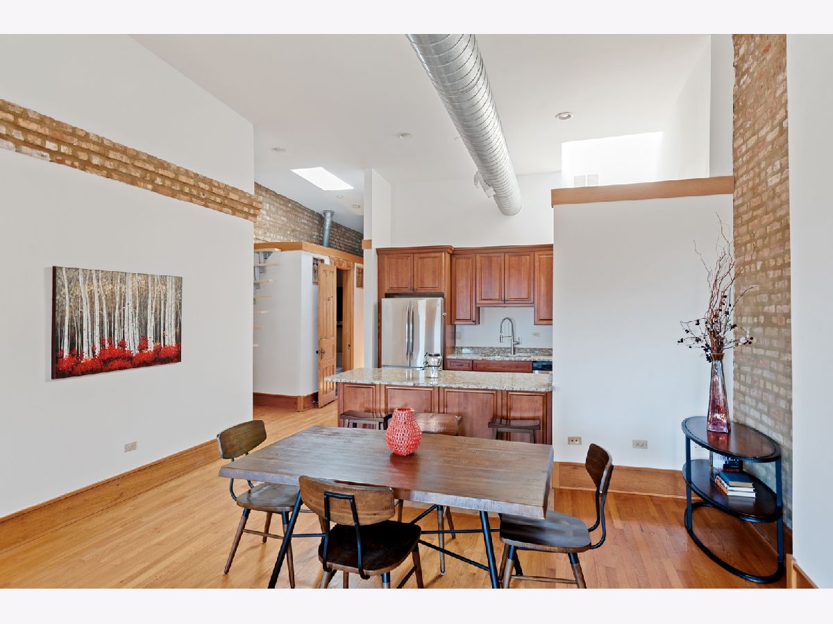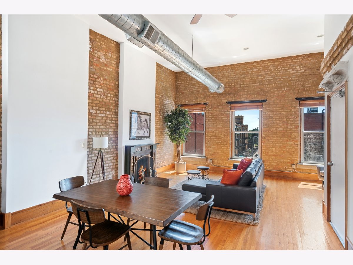 PENTHOUSE LOFT! ELEVATOR! Southern exposure and skylights flood this beautiful 2 bed/2bath loft home with sunlight. 14' Ceilings, exposed brick, vintage details and hardwood floors throughout make for an incredibly special home with tons of character! Super spacious kitchen with breakfast bar and stainless appliances. Oversized living room with statement wood burning fireplace and very generous dining space for 8 person dining table. Laundry room with side by side Washer/Dryer. Both bedrooms have fully enclosed walls. Great storage and large deck. Garage parking 25K. Low assessments and this prime West Loop location make this an absolute find!