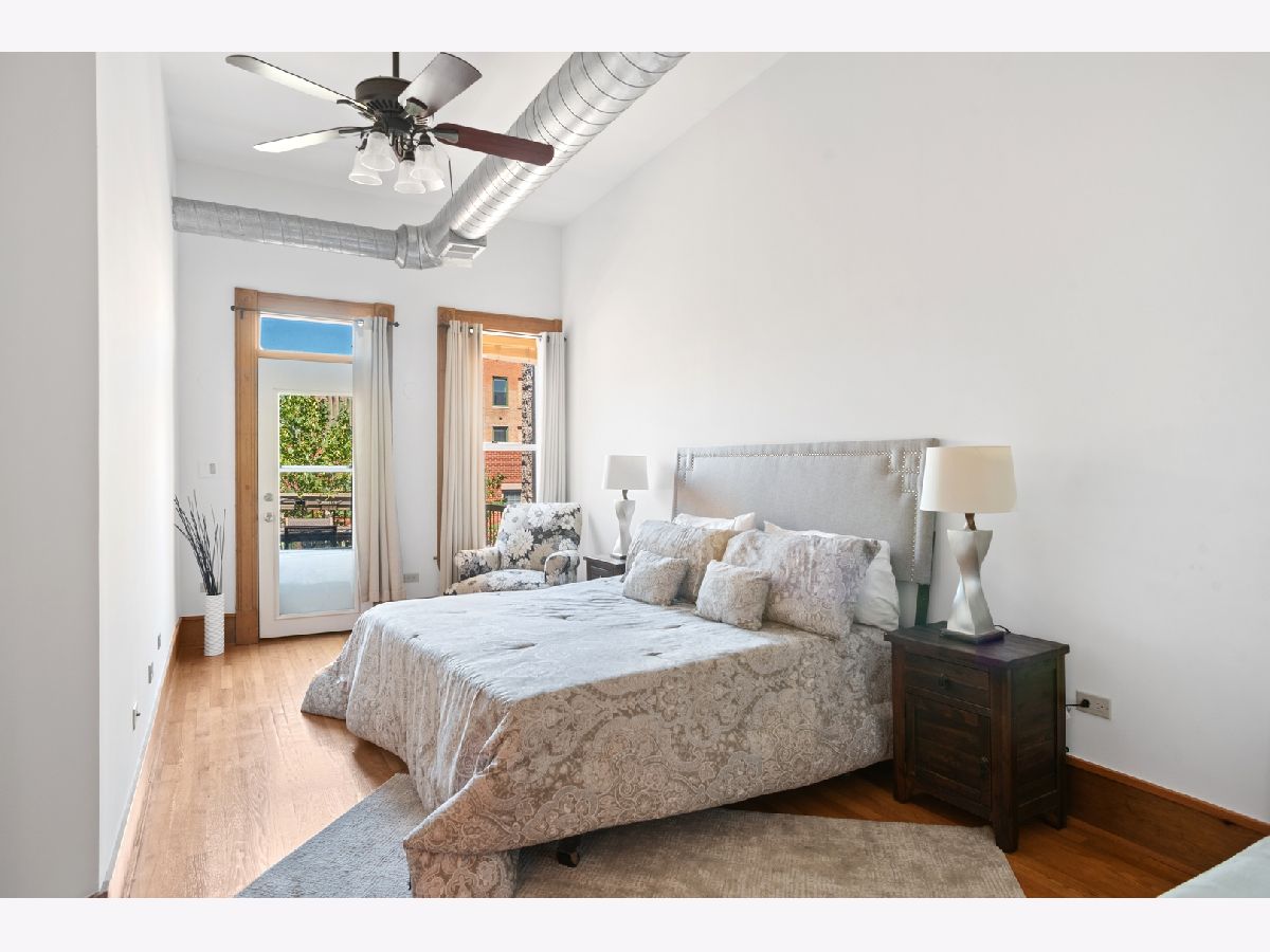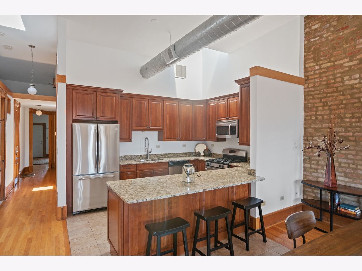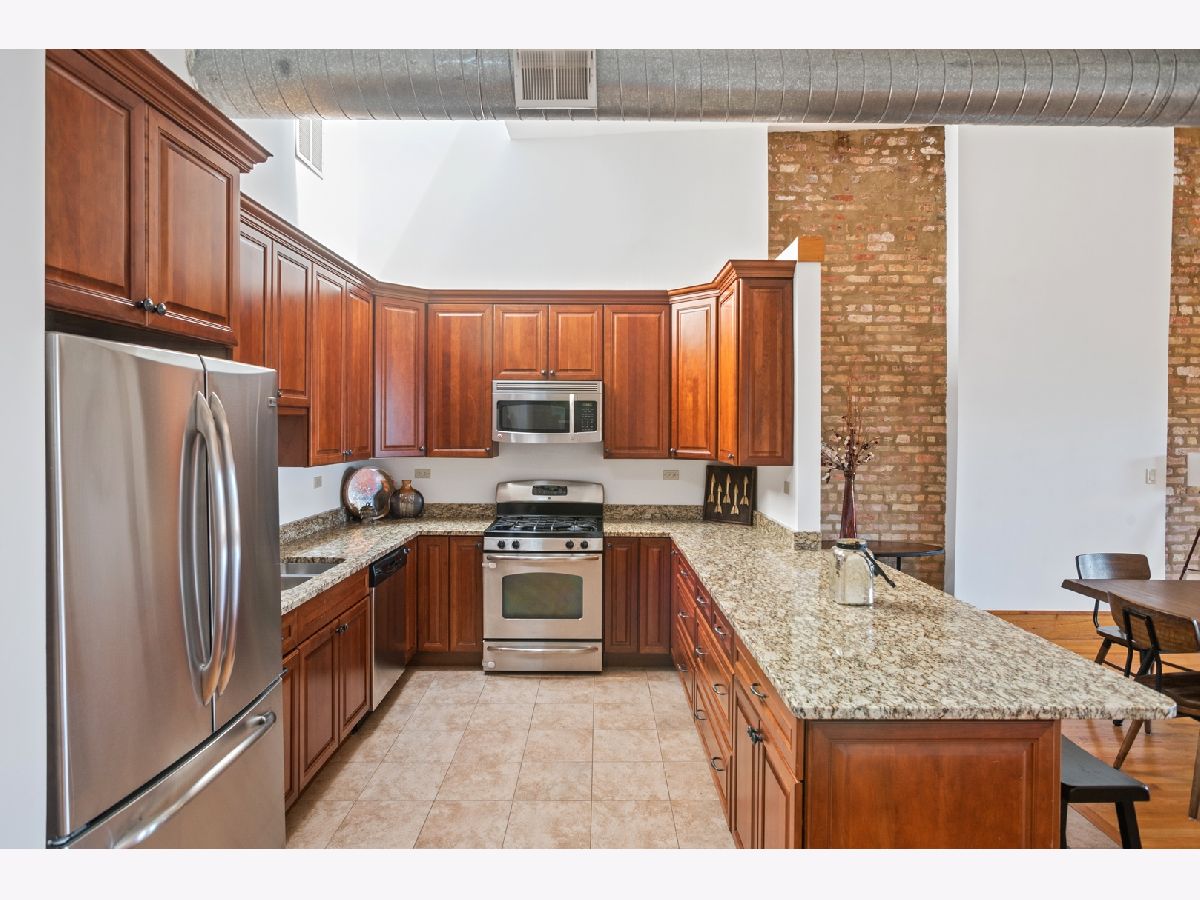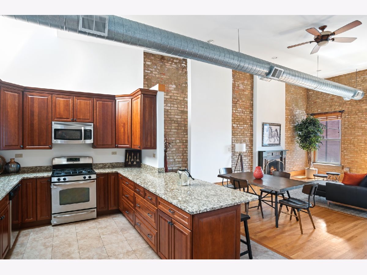 PENTHOUSE LOFT! ELEVATOR! Southern exposure and skylights flood this beautiful 2 bed/2bath loft home with sunlight. 14' Ceilings, exposed brick, vintage details and hardwood floors throughout make for an incredibly special home with tons of character! Super spacious kitchen with breakfast bar and stainless appliances. Oversized living room with statement wood burning fireplace and very generous dining space for 8 person dining table. Laundry room with side by side Washer/Dryer. Both bedrooms have fully enclosed walls. Great storage and large deck. Garage parking 25K. Low assessments and this prime West Loop location make this an absolute find!