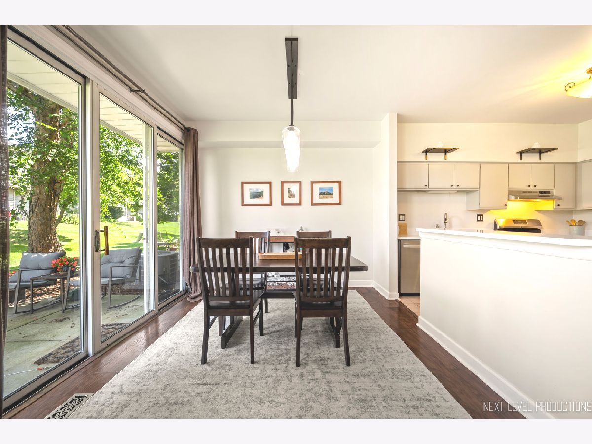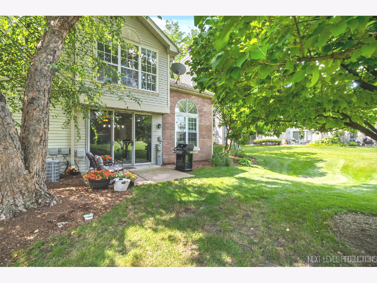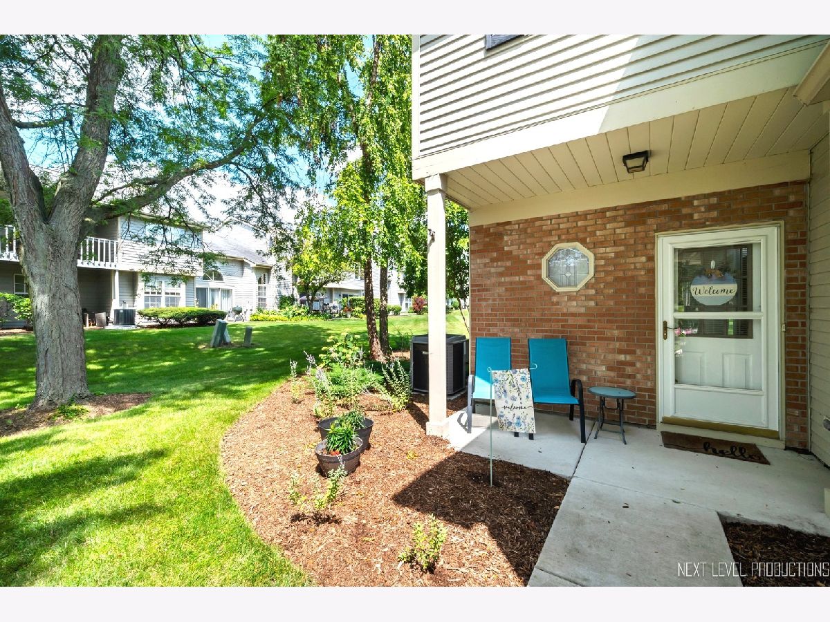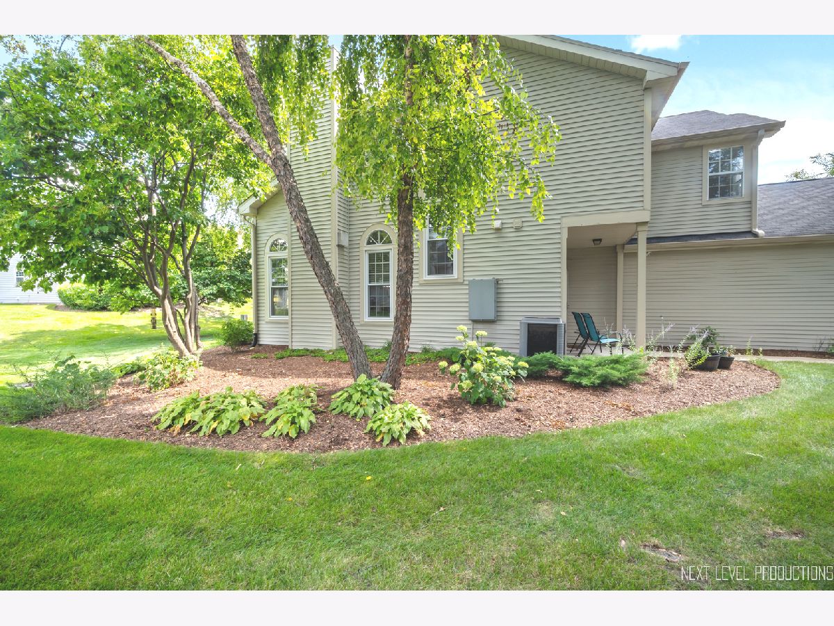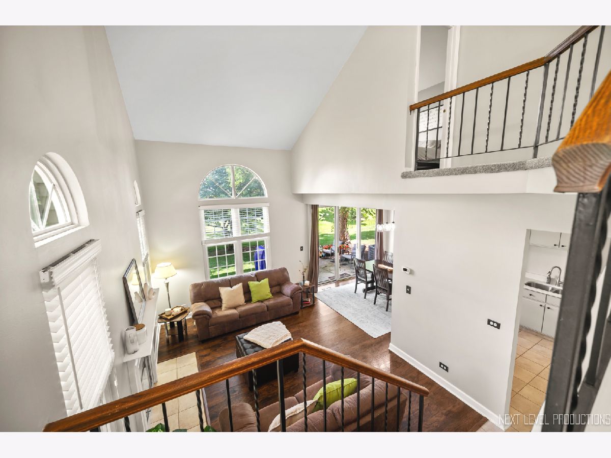 Beautifully updated, private end-unit available in desirable Glendale Lakes golf community! Newly painted family room with cathedral ceilings, walnut engineered hardwood flooring, cozy gas fireplace and arched windows allows for an abundance of natural light throughout! Adorable kitchen with ceramic tile flooring, quartz countertops, lighter cabinets, stainless-steel appliances and pantry. Separate dining room space with contemporary pendant lighting ideal for entertaining! Sliding glass door overlooks peaceful patio space and common grass area. Wrought iron staircase leads to tranquil loft area, ideal office or lounging space. Spacious vaulted primary room with 2 separate closets and ensuite bath with ceramic tile flooring, contemporary sink and glass shower door. Decently sized 2nd bedroom and full bath with ceramic tile surround and updated sink and mirror. 1st floor laundry and 1/2 bath plus attached 1-car garage. No rentals allowed. Additional amenities include pool and clubhouse. Conveniently located near shops, dining and access to expressways! Don't miss out on making this sweet home yours today!