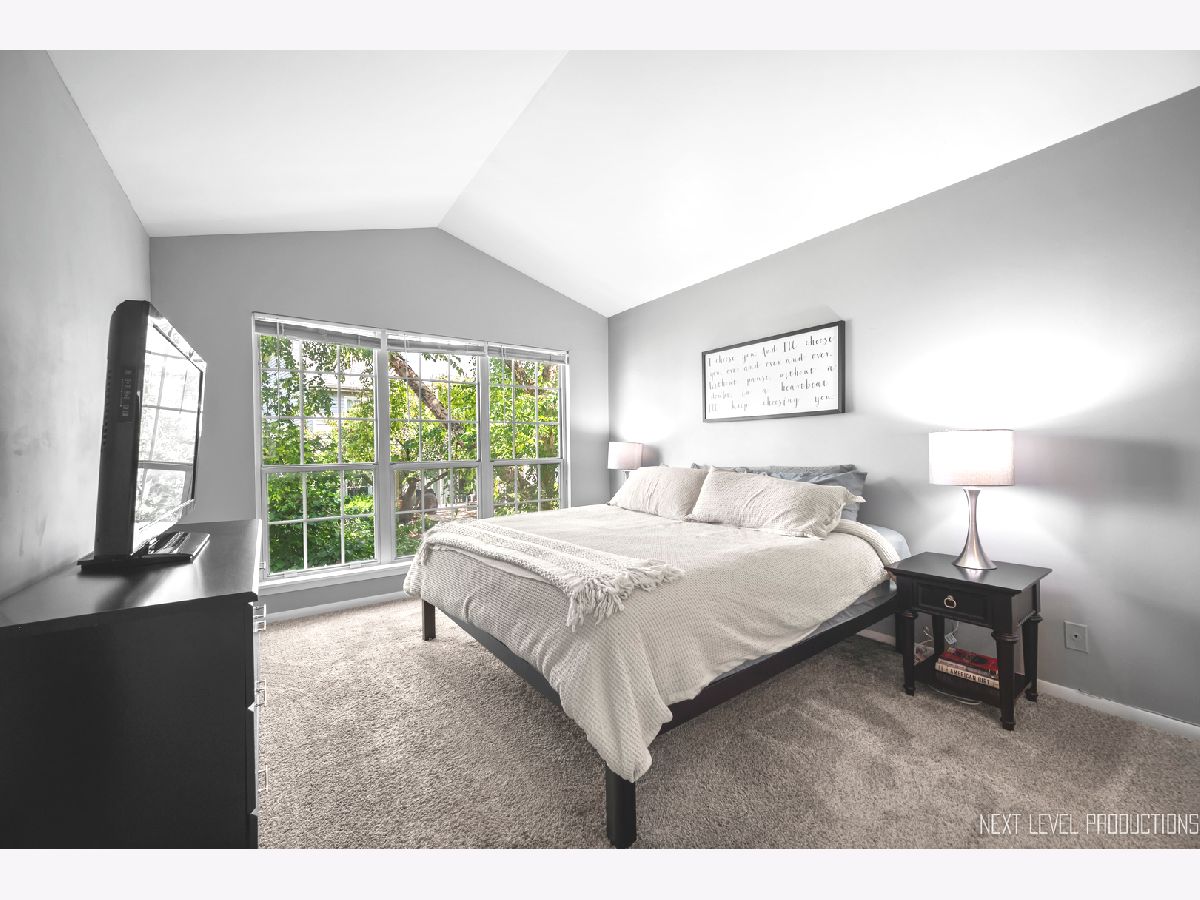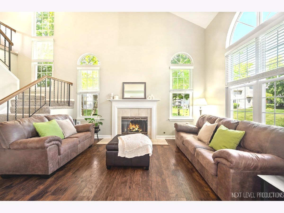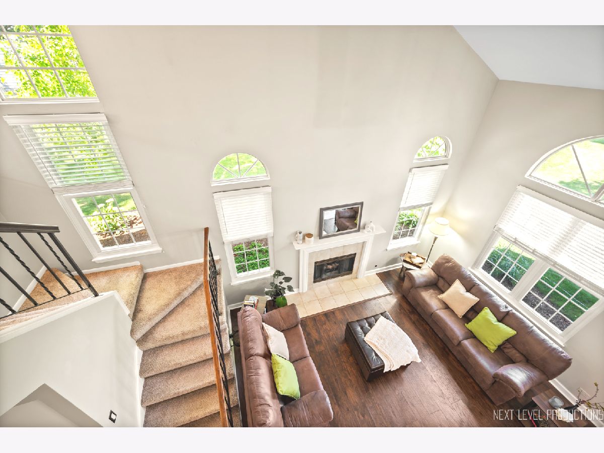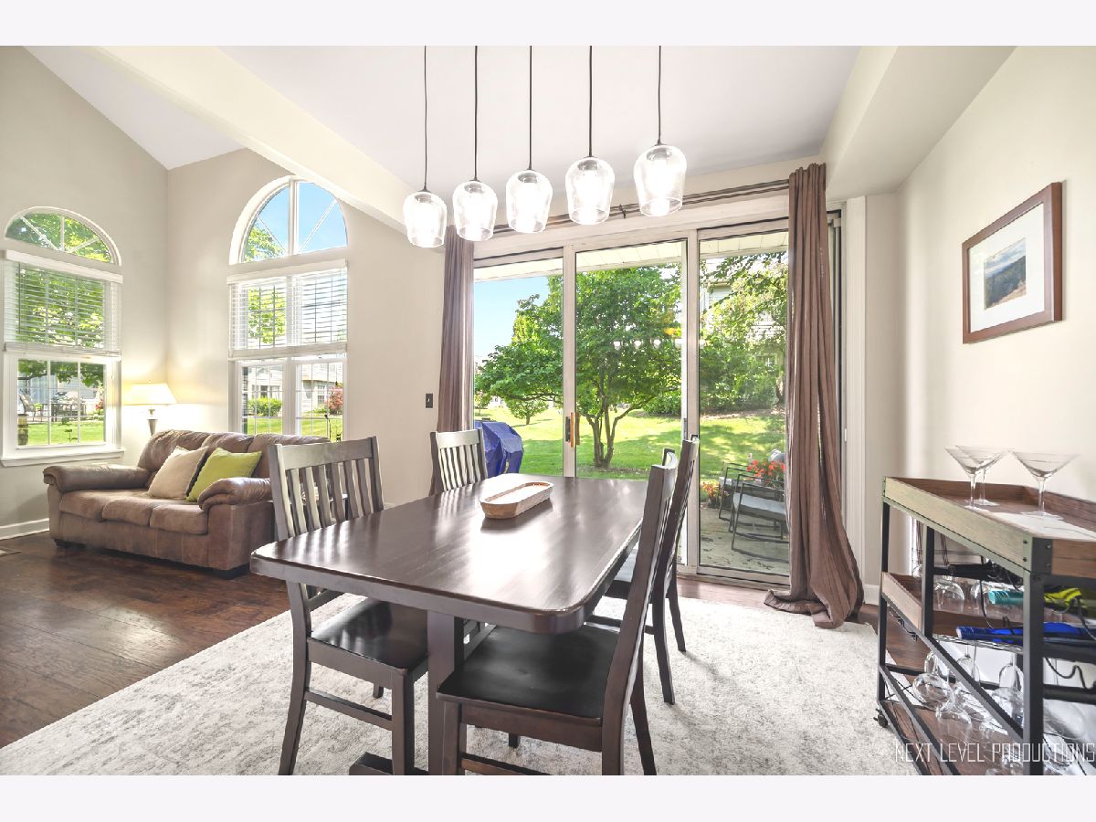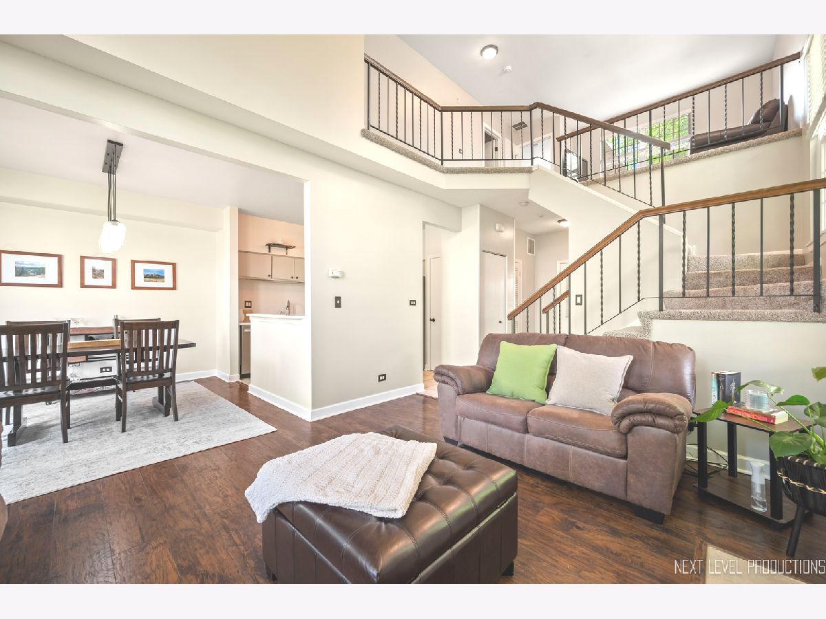 Beautifully updated, private end-unit available in desirable Glendale Lakes golf community! Newly painted family room with cathedral ceilings, walnut engineered hardwood flooring, cozy gas fireplace and arched windows allows for an abundance of natural light throughout! Adorable kitchen with ceramic tile flooring, quartz countertops, lighter cabinets, stainless-steel appliances and pantry. Separate dining room space with contemporary pendant lighting ideal for entertaining! Sliding glass door overlooks peaceful patio space and common grass area. Wrought iron staircase leads to tranquil loft area, ideal office or lounging space. Spacious vaulted primary room with 2 separate closets and ensuite bath with ceramic tile flooring, contemporary sink and glass shower door. Decently sized 2nd bedroom and full bath with ceramic tile surround and updated sink and mirror. 1st floor laundry and 1/2 bath plus attached 1-car garage. No rentals allowed. Additional amenities include pool and clubhouse. Conveniently located near shops, dining and access to expressways! Don't miss out on making this sweet home yours today!