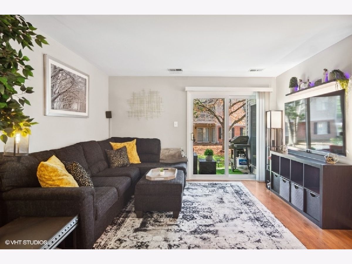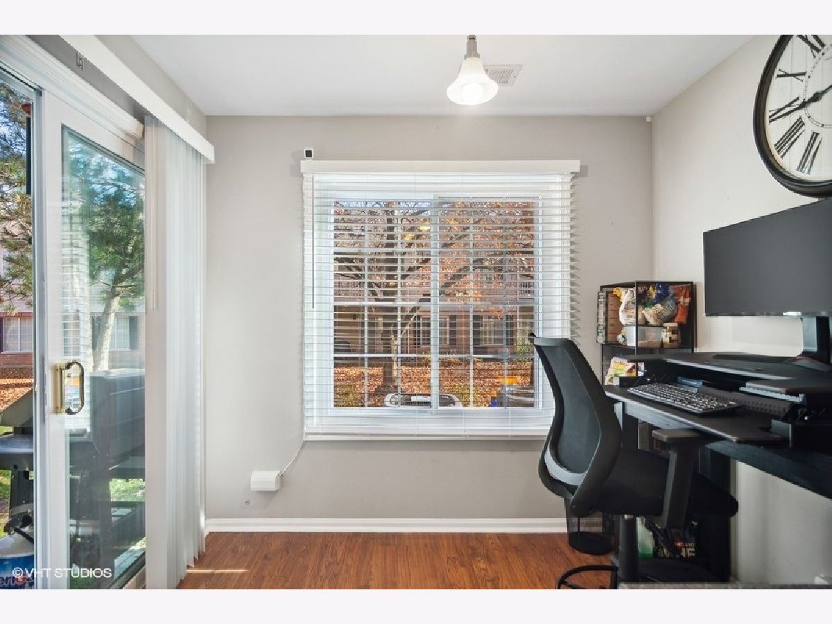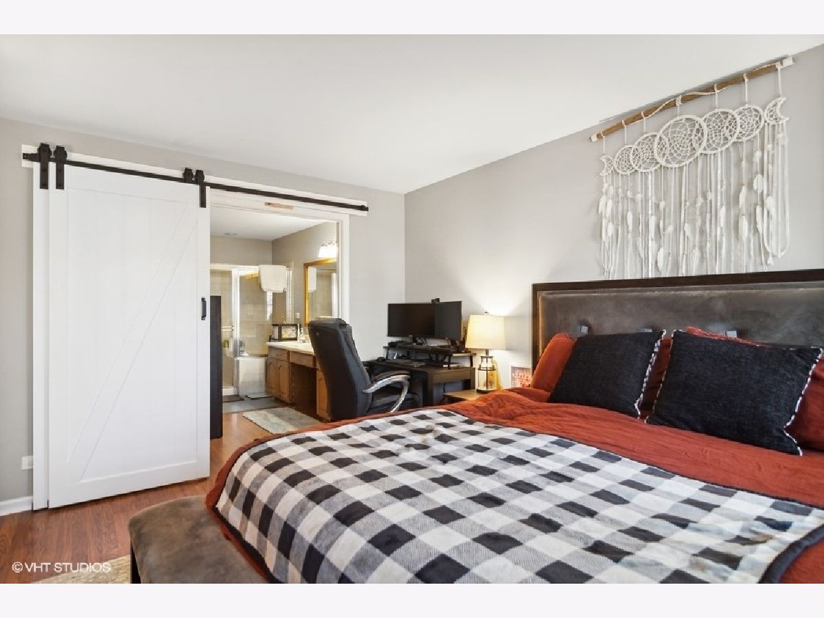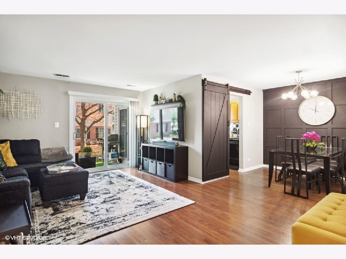 Nestled in the heart of Harvest Run, this beautifully renovated 2 bed, 2 bath condo is not one you want to miss! Step into an open concept living room and dining room boasting a fresh coat of paint, newer laminate flooring, and a modern board and batten feature wall. The kitchen features a barn door, solid wood cabinets, checkerboard backsplash, and an adjacent breakfast room with sliding door access to the patio. A covered patio is the perfect space for grilling, al fresco dining and entertaining, or simply enjoying some fresh air. Rest and relax in a spacious master bedroom with barn doors leading into an ensuite bathroom featuring a large walk-in closet, double sinks, and a glass enclosed shower area. A good sized second bedroom, second bathroom, and in-unit laundry room completes the unit. A generously sized one car detached garage offers space for a vehicle and small workshop/storage area. The detached garage has direct access to the common area of the condo. Minutes to shopping centers, Deer Grove Forest Preserve, schools, neighborhood parks and Palatine Bike Trail.