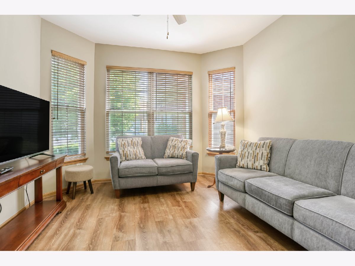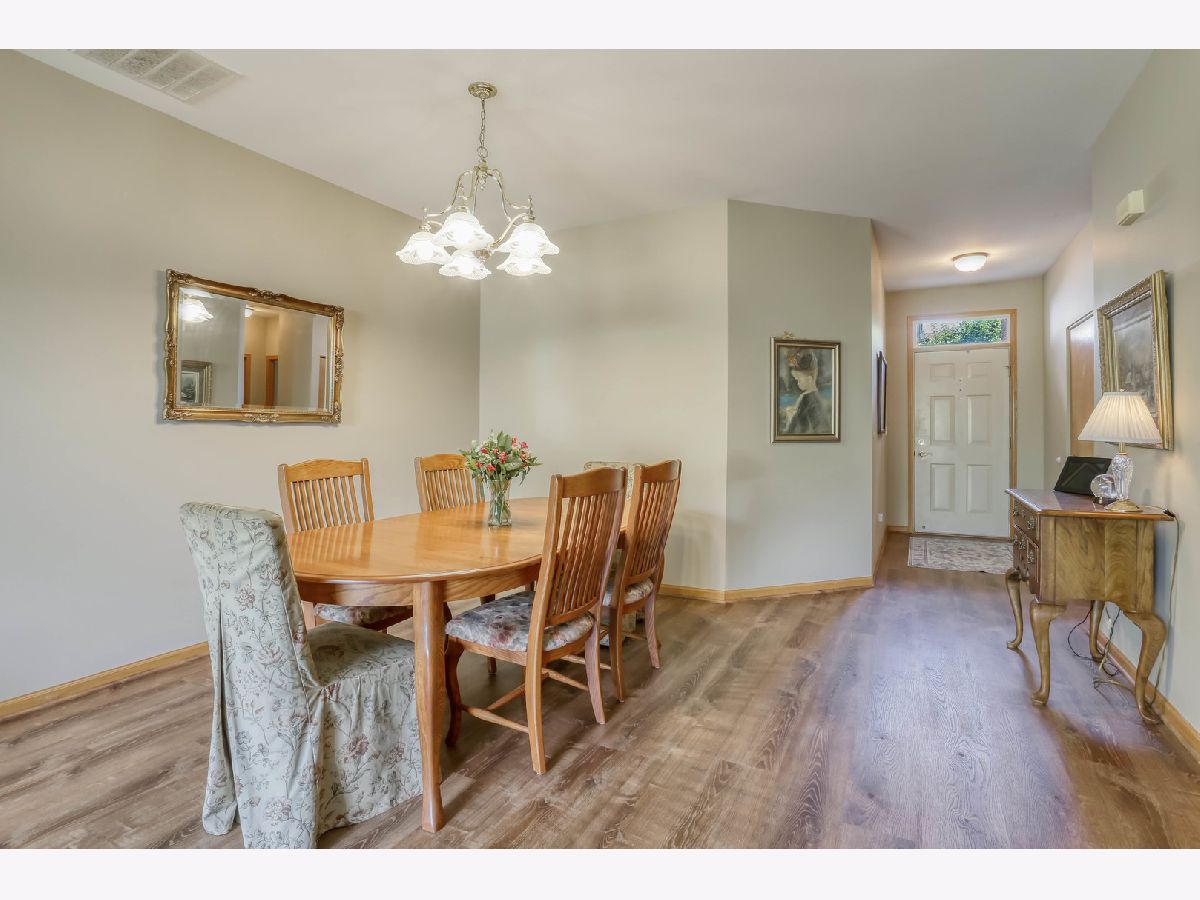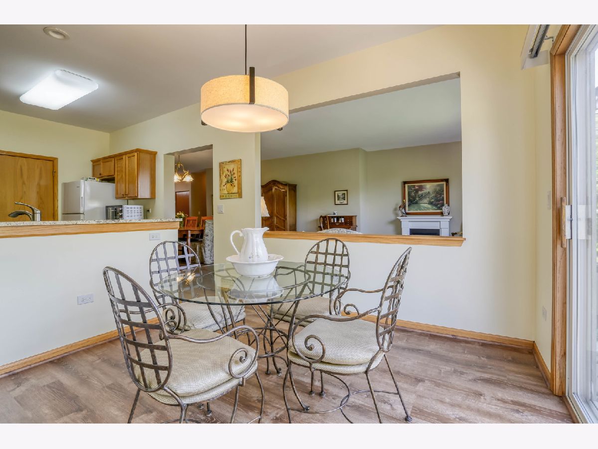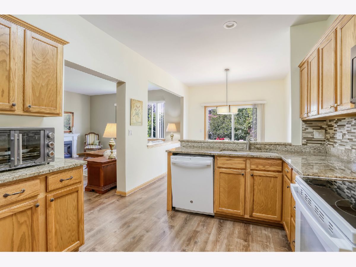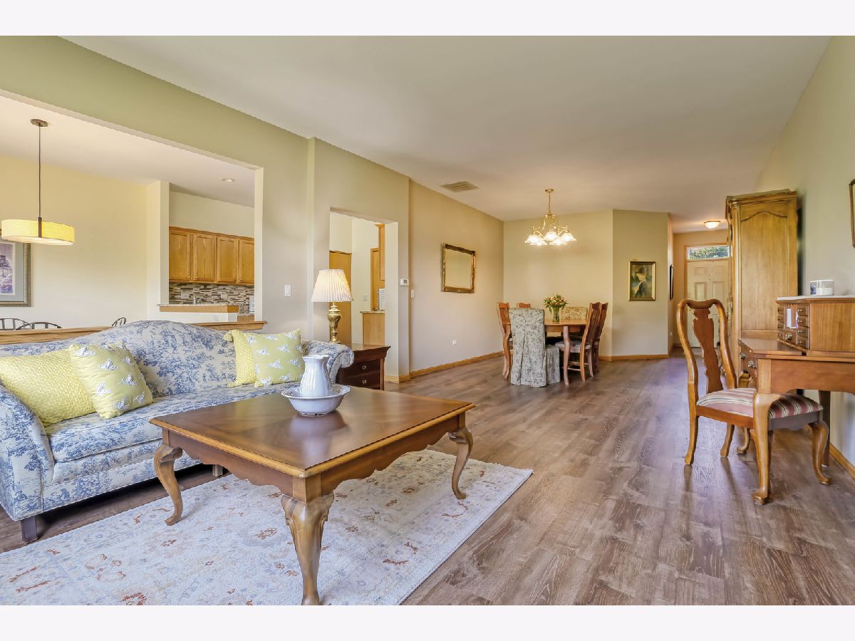 Ready for new owners, this refreshed Laguna RANCH model is beautifully updated with stylish touches throughout. Enjoy the quiet, picturesque setting in Carillon's 55+ Active Adult Community with no neighbors behind you. This move-in ready home boasts a bright and welcoming open floor plan designed for easy living. From the moment you step inside, you'll appreciate the airy 9-foot ceilings and the newer luxury vinyl flooring that flows seamlessly throughout the main living areas. The spacious dining room is ideal for both formal and casual dining occasions and opens to the expansive, versatile living room, creating an inviting space. The lovely eat-in kitchen is highlighted by an abundance of oak cabinetry, granite countertops, glass tile backsplash, and all newer appliances, just 1-2 years old. A sun-filled eating area with a modern drum light fixture is perfect for everyday meals. Step outside through the sliding glass door that leads to a quaint concrete patio that is tree-lined for privacy. The expansive primary bedroom suite features newer carpet, a generous walk-in closet, and direct access to the refreshed shared bathroom, which includes quartz counters and a large shower. A versatile second bedroom with a bay window makes a perfect guest room, office, or cozy den. The laundry room features a convenient closet and direct access to the 2 car garage. UPDATES INCLUDE: luxury vinyl floors and carpet (2023), roof, gutters, soffits/fascia (2023), interior painted (2023), smoke/carbon detectors (2025). Previous seller representations: air conditioner and furnace (2017), granite countertops and kitchen backsplash (2017), faucets and sinks throughout (2017), bathroom quartz countertop and painted vanity (2017), light fixtures and fans (2017), hot water heater (2016), washer and dryer (2016). Carillon is a gated, golf course community with indoor/outdoor pools, clubhouse, tennis courts, countless activities and much more. Ideal location near shopping dining and easy access to I-55 and expressways. Don't miss out on this beauty located in the Chelsea community.