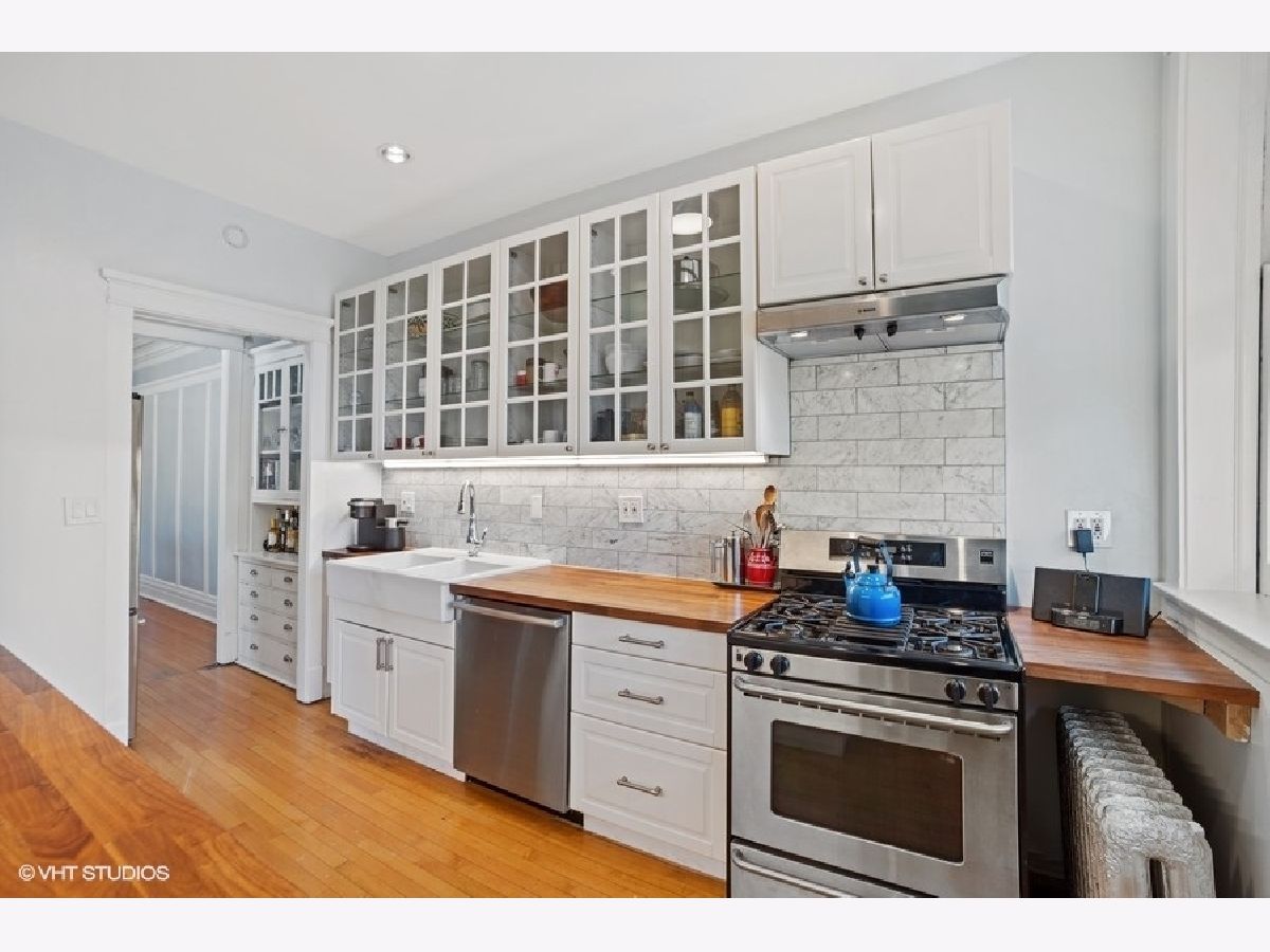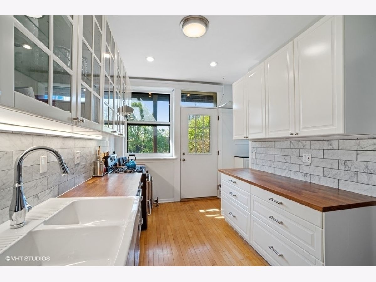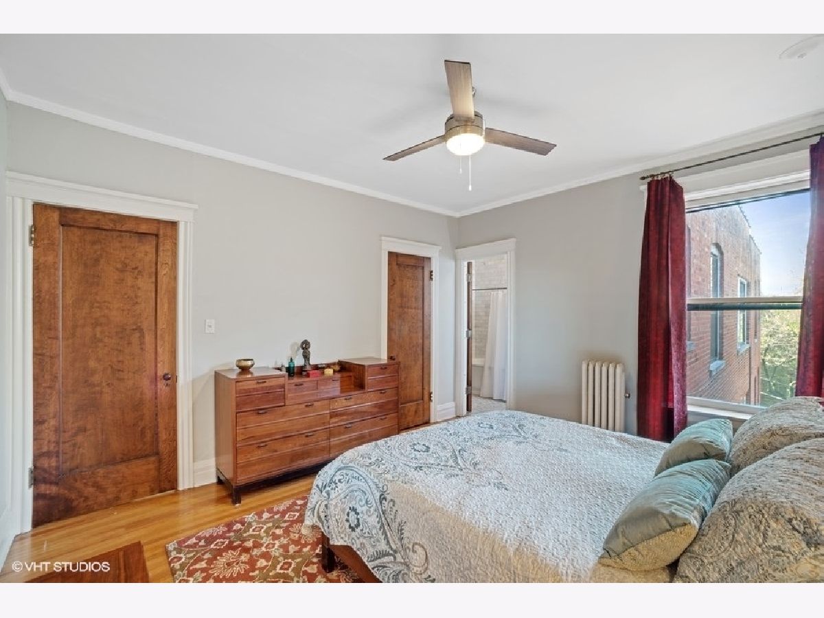 Welcome to this gorgeous, sundrenched top floor condo in the heart of Hyde Park. Unobstructed views of gardens and back yards in north, west and south exposures. Spacious living room with custom 57th street book case, lovely sunporch perfect for reading and hardwood floors. Three bedrooms with great organized closet space, two updated baths. The kitchen has been completely redone recently with white cabinets, stainless appliances, butcher block counters and deep farmers sink, and opens to back porch seating area. Entire unit has been electrically rewired. Washer/dryer in the condo. Well managed building that shares fabulous greenspace back yard. Storage, bike room - and deeded parking space in parking coop on Dorchester included in price. Don't miss this one