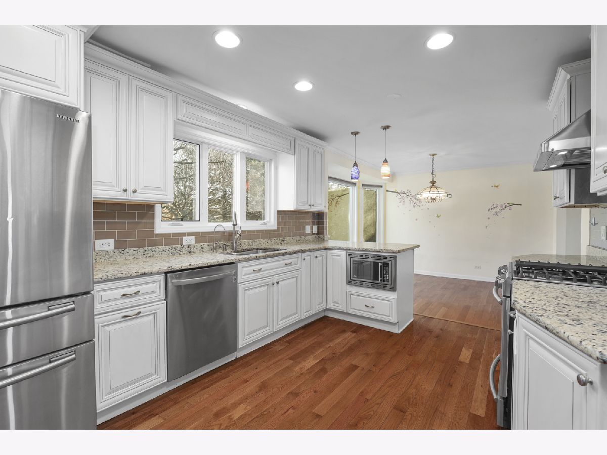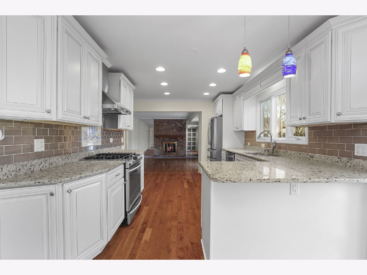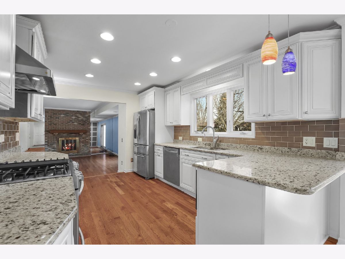 Gorgeous home in highly sought Green Knolls! Gleaming hardwood floors throughout the main and upper levels! Bright, spacious living room & separate dining room with a beautiful bay window opens to the exceptional updated kitchen featuring granite counters, stainless steel appliances and hood, breakfast bar, and subway tile backsplash. Step down into the inviting family room with floor-to-ceiling brick fireplace, built-in storage, and french doors leading to the patio. Upstairs, a spacious master suite boasts a walk-in closet, window seats, a large vanity and an ensuite bath with tile shower/tub. A junior suite features a shared ensuite bath with tile shower/tub and dual bifold closets. Two additional bedrooms with hardwood floors and window seats complete the second level. Finished basement with a large recreation room and extra storage space! Attached 2-car garage. Incredible location backing to peaceful walking path with multiple parks and tennis courts within walking distance. Excellent award-winning schools including Prairie Elementary & Stevenson HS! Kitchen renovated 2015, Roof 2014, Basement finished 2014, Furnace 2012, Windows 2009, Water heater 2007.