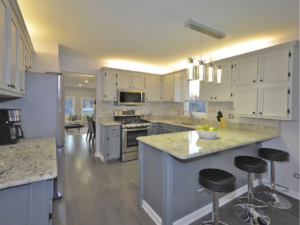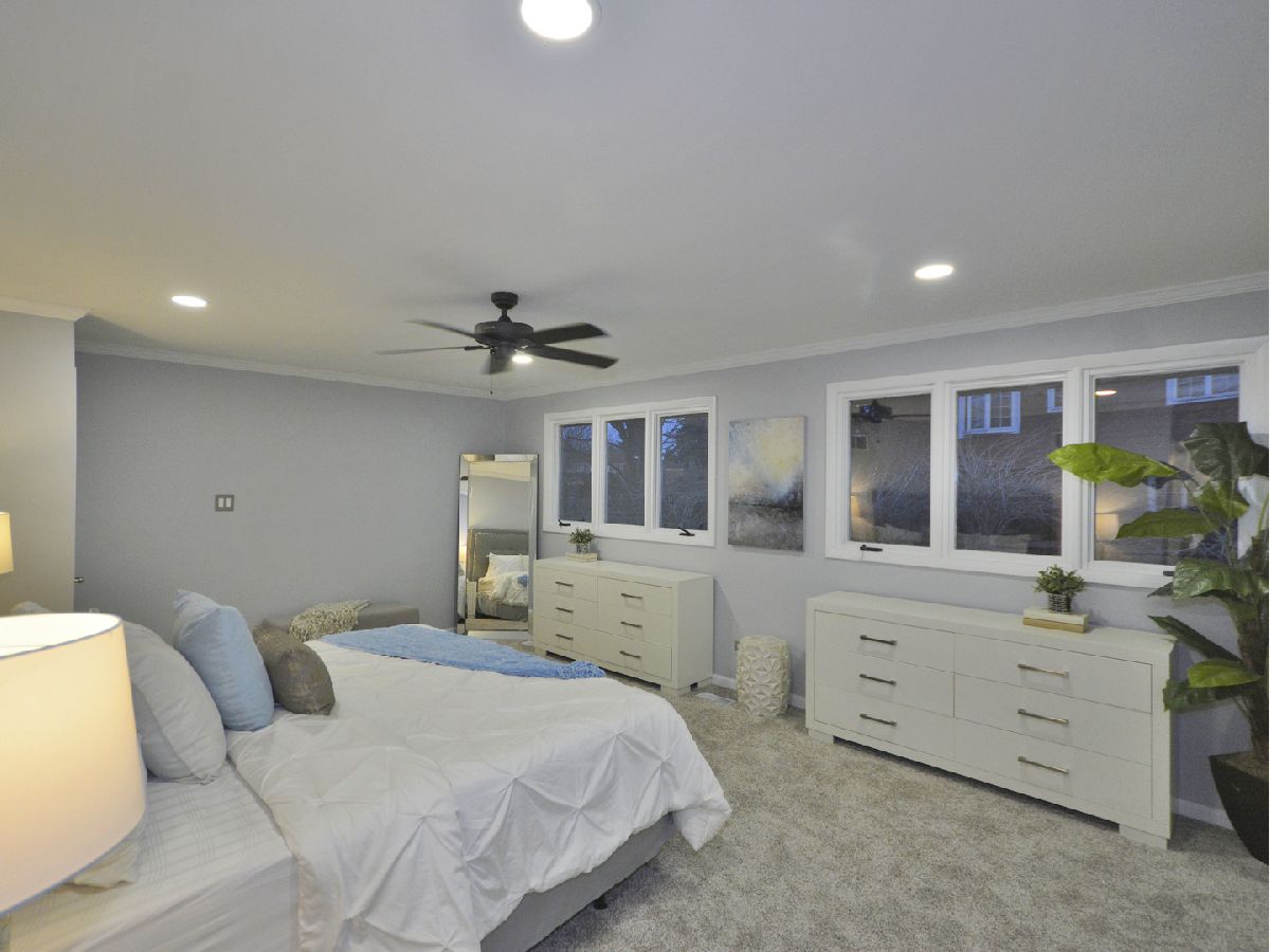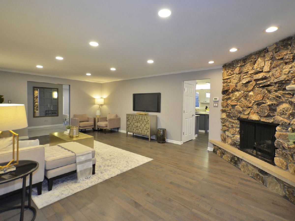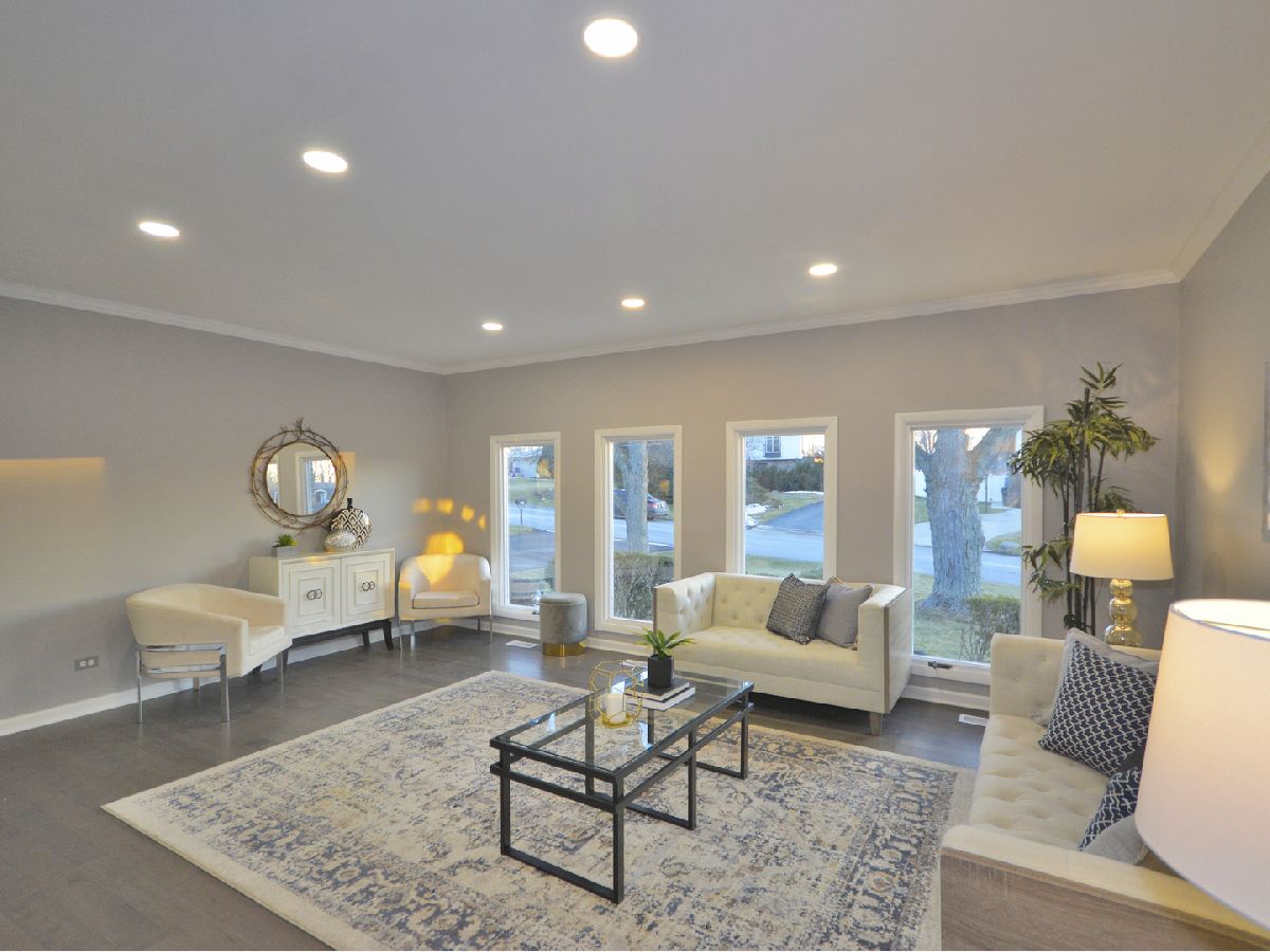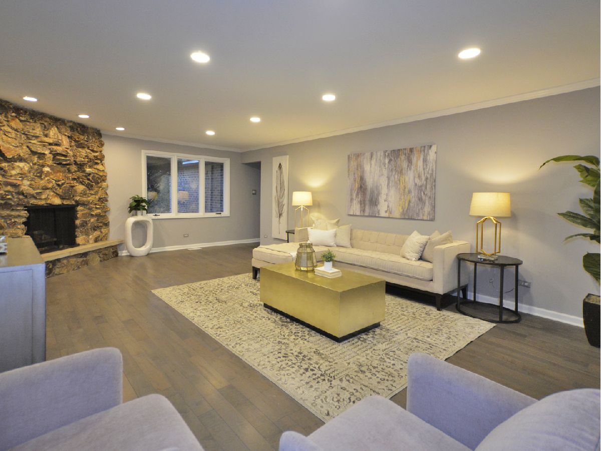 Prepare to be dazzled by this architecturally stunning and marvelously remodeled brick abode. As you step into the home, you're met with a truly regal entryway, accentuated with custom square-paneled walls, that will leave you feeling nothing short of inspired. Ash grey wood flooring and soft, blue-tones define the perfectly curated color palette found throughout. An abundant use of recessed lighting and tasteful crown molding form the perfect blend of modernity and classic character. The expansive main level family room, highlighted with a natural stone fireplace, delivers a cozy, yet spacious, atmosphere. The front-facing living room is lined with dramatic, oversized windows that exude splendor and sophistication. A separate, formal dining area comes fitted with additional built-in storage. The chef's kitchen has been exquisitely updated with ornate cabinetry, custom tiled backsplash, and overhead ambient lighting. Modish pendant lights overhang and showcase the beautiful granite countertops and breakfast bar. Contemporary stainless steel appliances round out the picturesque package. The commodious, ensuite master bedroom provides ample space for a full suite of furniture. A second and third bedroom, as well as an additional full hallway bathroom, can be found on the main level. Both bathrooms have been upgraded to a spa-like quality featuring double vanities, standing glass showers, floating tubs, and trayed ceilings. Head downstairs and you'll find the finished basement has been as meticulously tailored as the rest of the home. A sprawling recreation room can be used as additional living space, or a creative area to practice your personal hobbies. A separate den supplies an ideal work-from-home office. The designated laundry room comes equipped with front-loading washer and dryer, as well as a utility sink. At the rear of the home, a sliding glass door leads to a paved patio and luscious green space. Located in close proximity to the Old Oak Country Club. Surrounded by parks, lakes, and recreation areas. Come and see this remarkable home and be ready to fall in love.