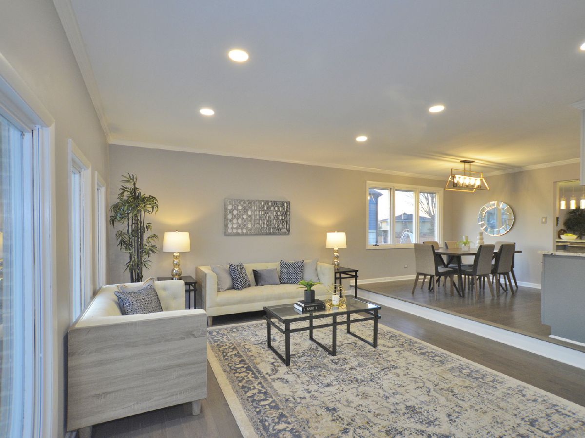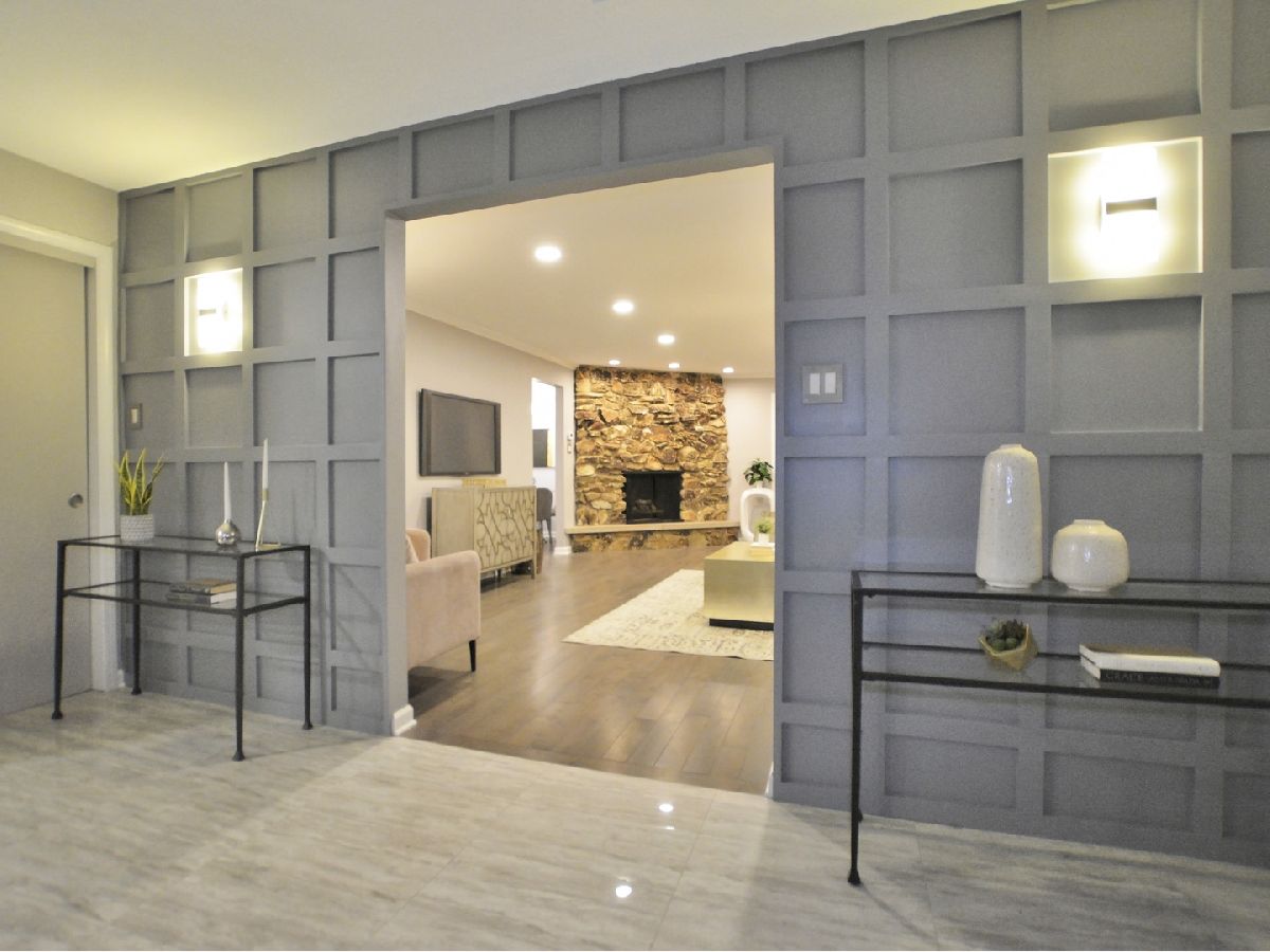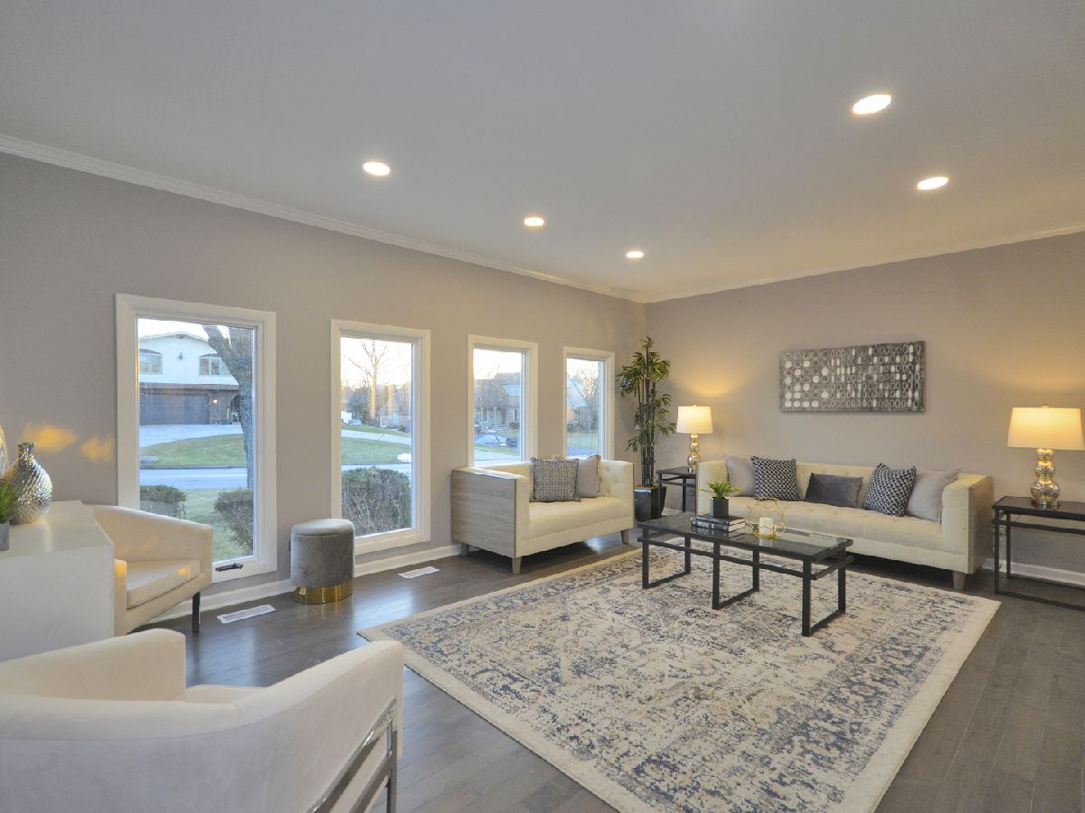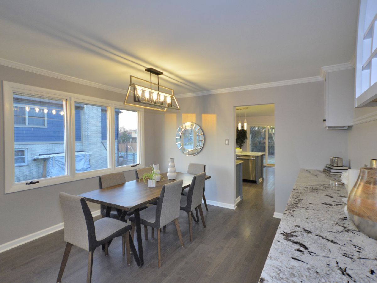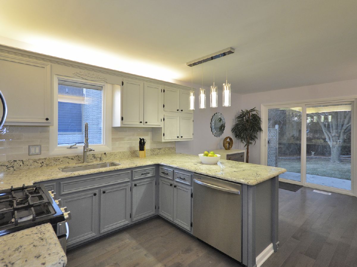Prepare to be dazzled by this architecturally stunning and marvelously remodeled brick abode. As you step into the home, you're met with a truly regal entryway, accentuated with custom square-paneled walls, that will leave you feeling nothing short of inspired. Ash grey wood flooring and soft, blue-tones define the perfectly curated color palette found throughout. An abundant use of recessed lighting and tasteful crown molding form the perfect blend of modernity and classic character. The expansive main level family room, highlighted with a natural stone fireplace, delivers a cozy, yet spacious, atmosphere. The front-facing living room is lined with dramatic, oversized windows that exude splendor and sophistication. A separate, formal dining area comes fitted with additional built-in storage. The chef's kitchen has been exquisitely updated with ornate cabinetry, custom tiled backsplash, and overhead ambient lighting. Modish pendant lights overhang and showcase the beautiful granite countertops and breakfast bar. Contemporary stainless steel appliances round out the picturesque package. The commodious, ensuite master bedroom provides ample space for a full suite of furniture. A second and third bedroom, as well as an additional full hallway bathroom, can be found on the main level. Both bathrooms have been upgraded to a spa-like quality featuring double vanities, standing glass showers, floating tubs, and trayed ceilings. Head downstairs and you'll find the finished basement has been as meticulously tailored as the rest of the home. A sprawling recreation room can be used as additional living space, or a creative area to practice your personal hobbies. A separate den supplies an ideal work-from-home office. The designated laundry room comes equipped with front-loading washer and dryer, as well as a utility sink. At the rear of the home, a sliding glass door leads to a paved patio and luscious green space. Located in close proximity to the Old Oak Country Club. Surrounded by parks, lakes, and recreation areas. Come and see this remarkable home and be ready to fall in love.