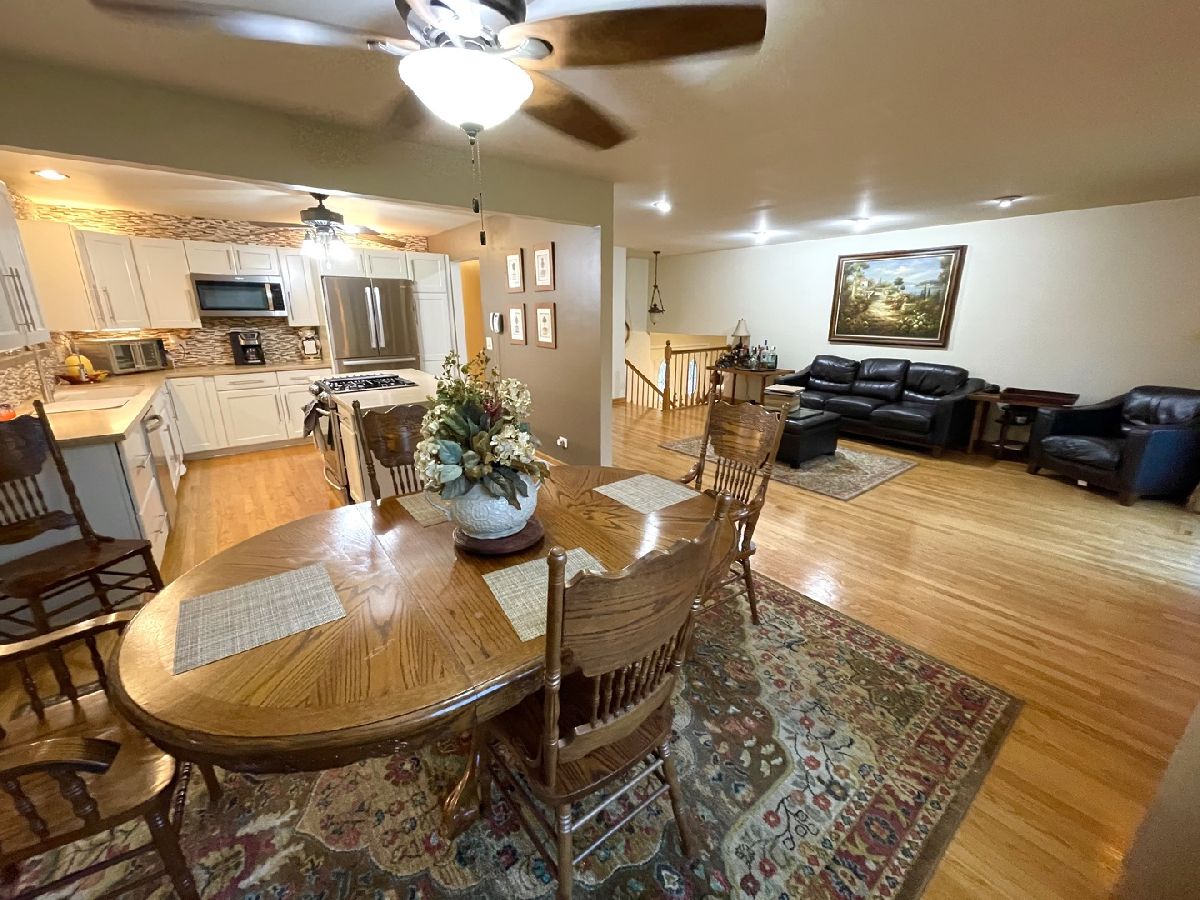 Updated Gaslight 3+ Bedroom raised ranch with walkout lower on a large tree lined 3/4 ac lot. Double-door main entry and garage access from the large 2-story Foyer. Updated Kitchen with island, all stainless appliances, tile backsplash and newer cabinets. The picture window in the large Living Room brings lots of natural light the reflects the gleaming hardwood floors that continue through the Kitchen and Dining. Dining Room with sliders to the Deck overlooking the oversized yard. 3 Bedrooms and updated full bath also on the main level. Walkout lower opens to a huge Family Room ideal for entertaining with a wet bar, cozy fireplace and sliders to the back yard, plus a 4th bedroom, 2nd full updated bath, and spacious Laundry. Plans available for an additional 2-car garage. New roof in 2022. Cul-de-sac street with easy access to I-90, shopping, bike trails, golf course and the Fox River. This home is a Corporate Relocation Home and requires additional docs. Sorry no home to sell CTG will be accepted.