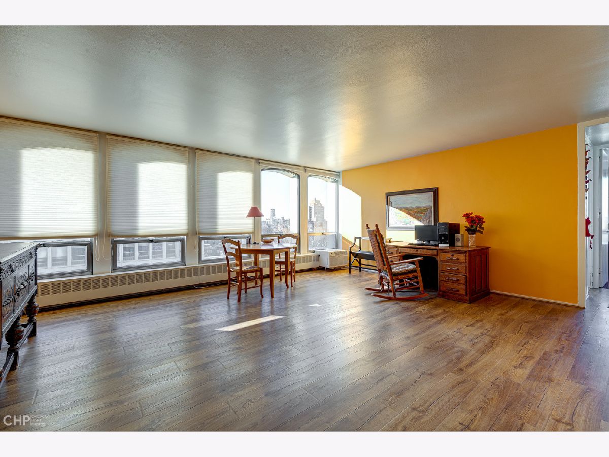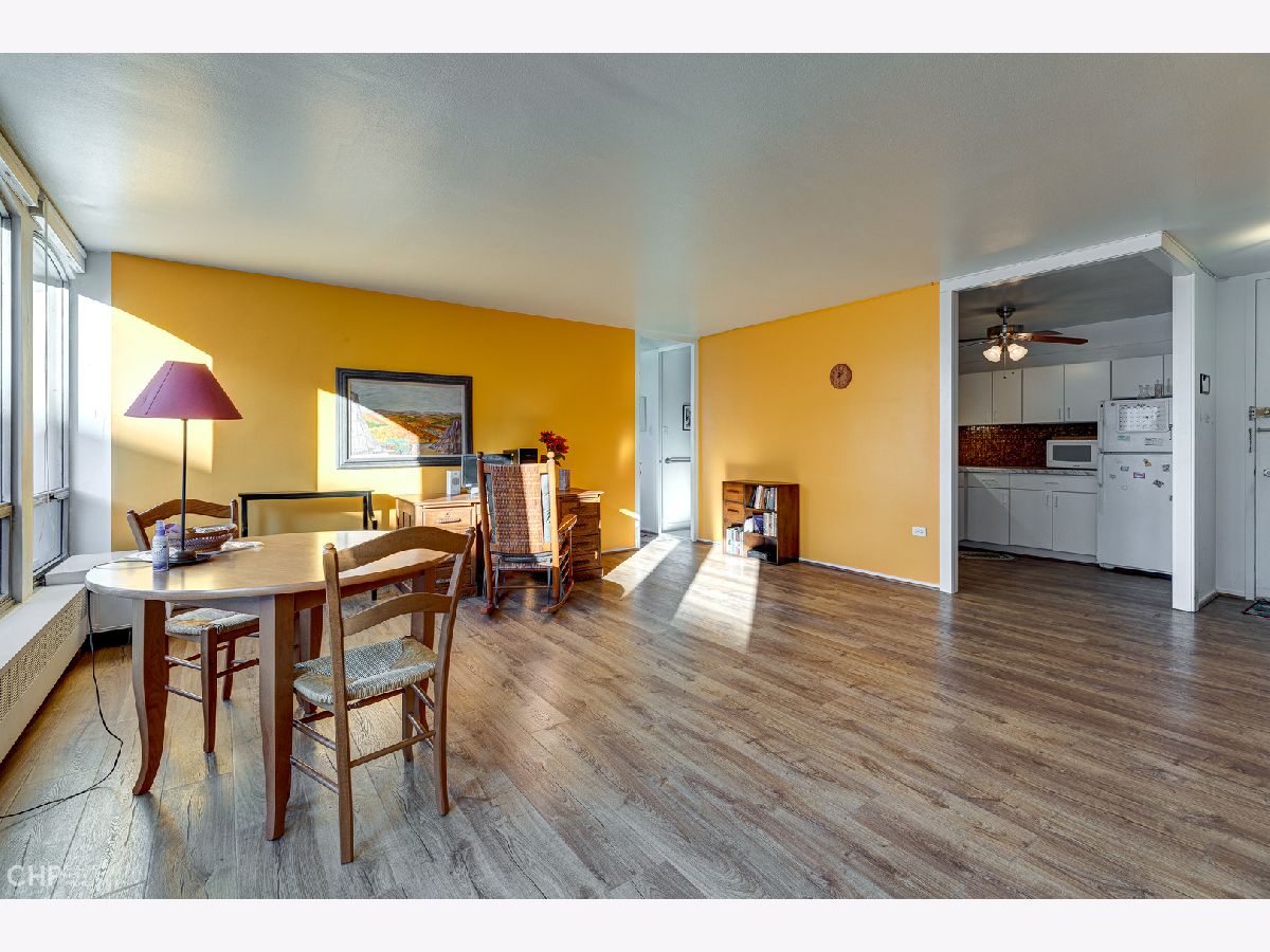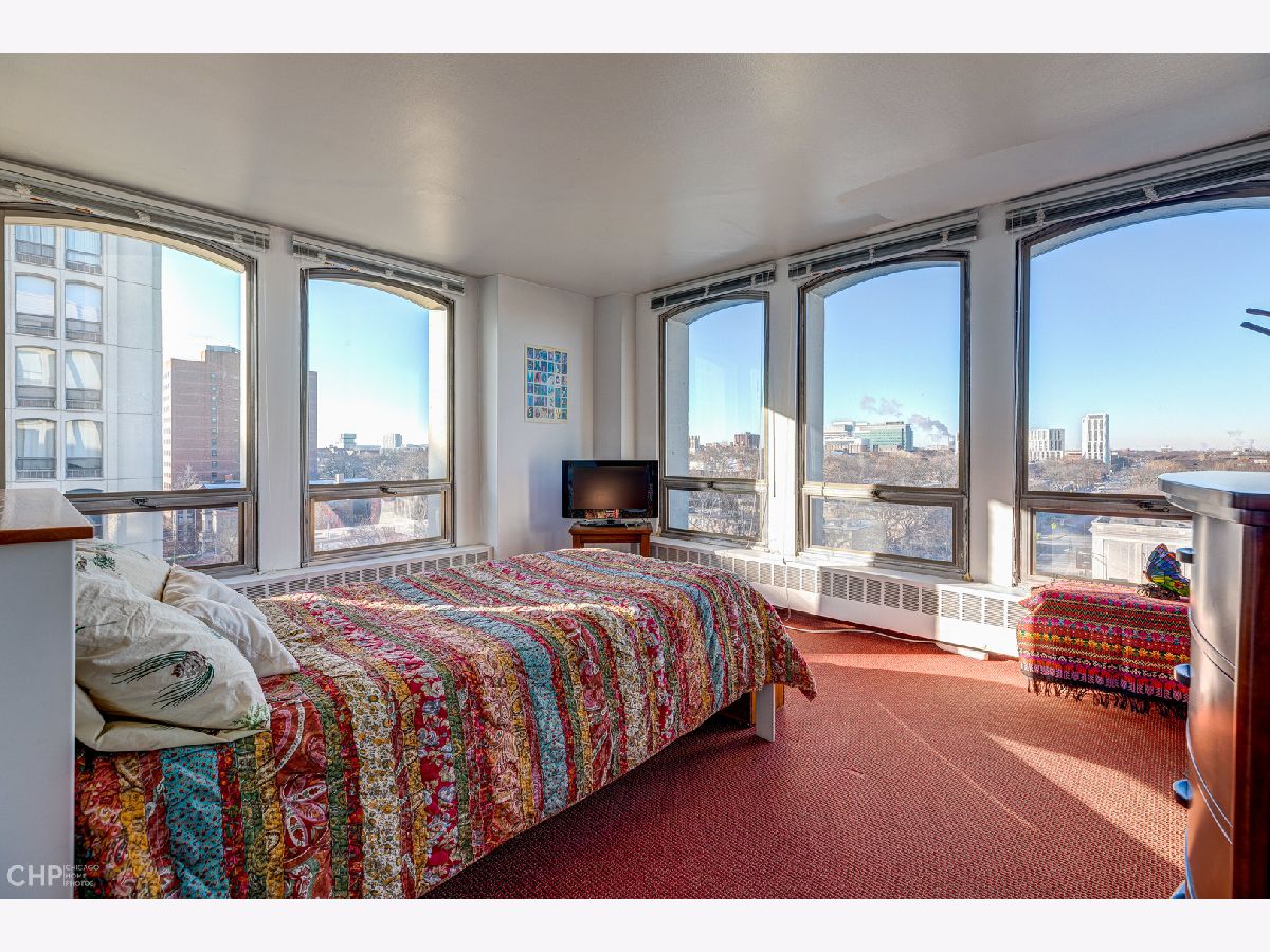 Very nice 7th floor corner unit with 2 bedroom, 2 bathroom in a well managed midcentury building. 14 huge south and west facing windows bathe this home in natural light and sunset views. Kitchen is partially opened to the living dining space. Enjoy the seasonal outdoor pool, take a stroll in the beautifully manicured gardens, or stay in shape at the on-site fitness center, all with the peace of mind of a 24 hour door staff. On-site storage locker included. On-site Management company. Garage parking could be available for an additional fee. Great location; walking distance to restaurants, stores, University of Chicago, the lake, museums, parks and public transportation. Easy to show.