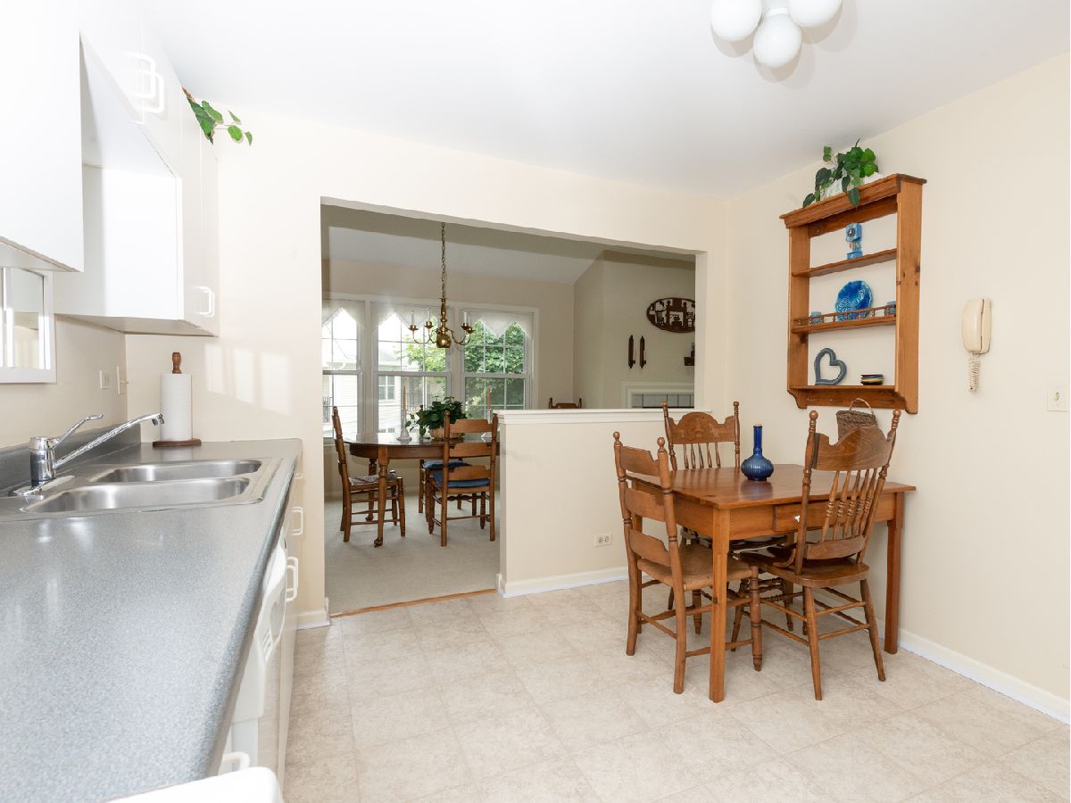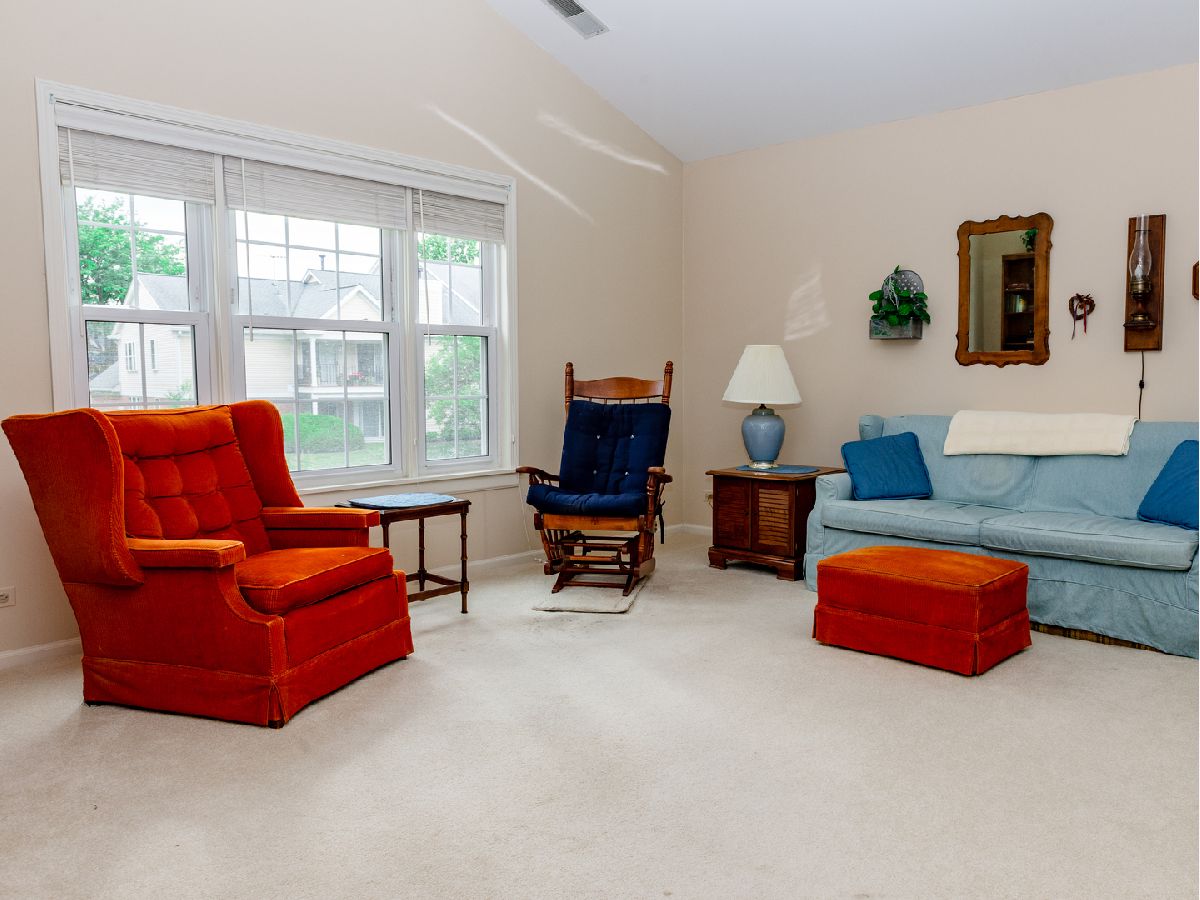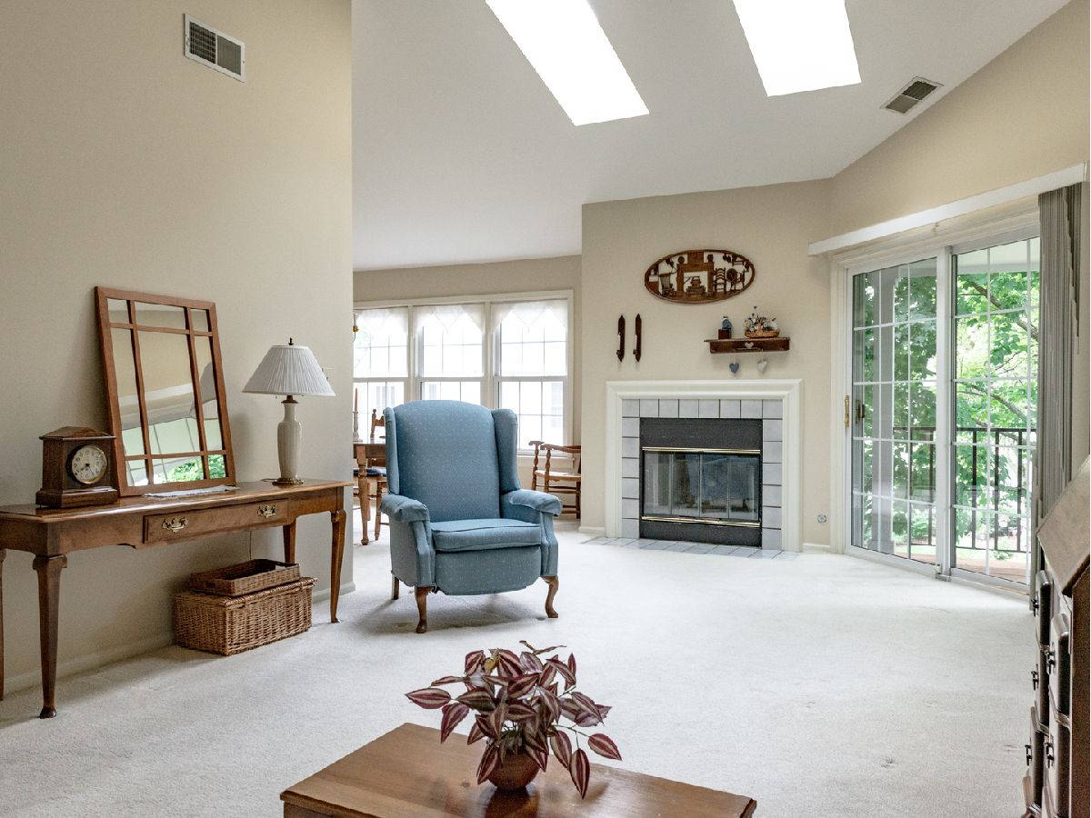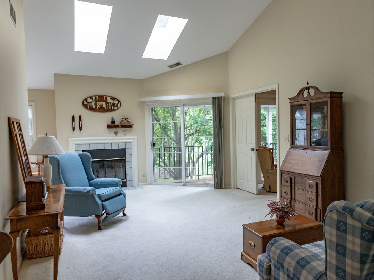 So much space in this top-floor, 3-bedroom unit! Skylights on the vaulted ceiling allow for loads of natural light. Eat-in kitchen with spacious pantry flows into the dining room. The living room features a fireplace and access to the balcony overlooking manicured grounds and walking path. The primary bedroom has two generous closets and en-suite bath with dual vanities and separate shower and jacuzzi tub. Additional full bath in the hallway with tub and shower. Balcony access in the third bedroom. Separate laundry room with full-size washer and dryer. Neutral carpeting throughout. Well-managed association, clubhouse, and outdoor pool. Fabulous location with close proximity to both Mt. Prospect and Prospect Heights train stations, restaurants, and shopping.