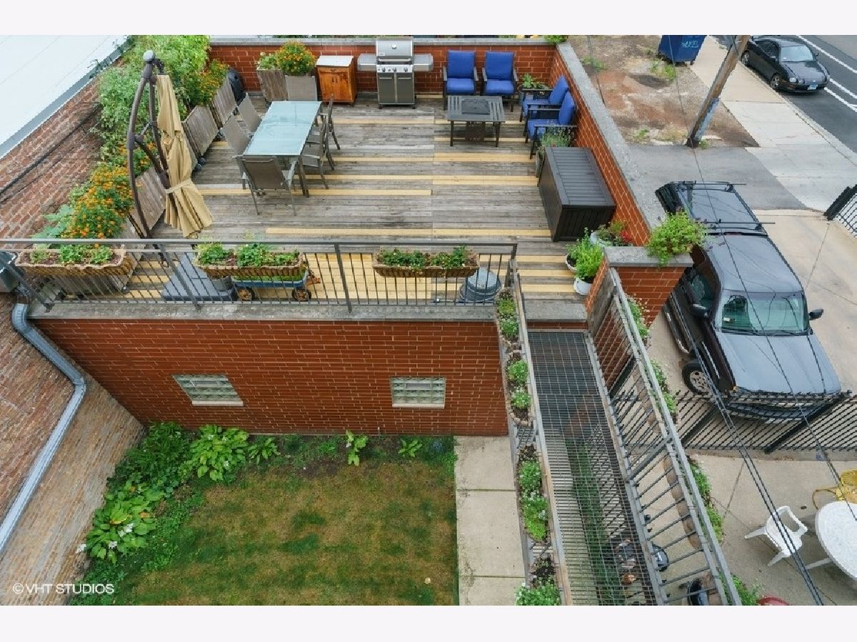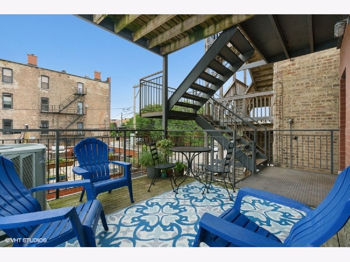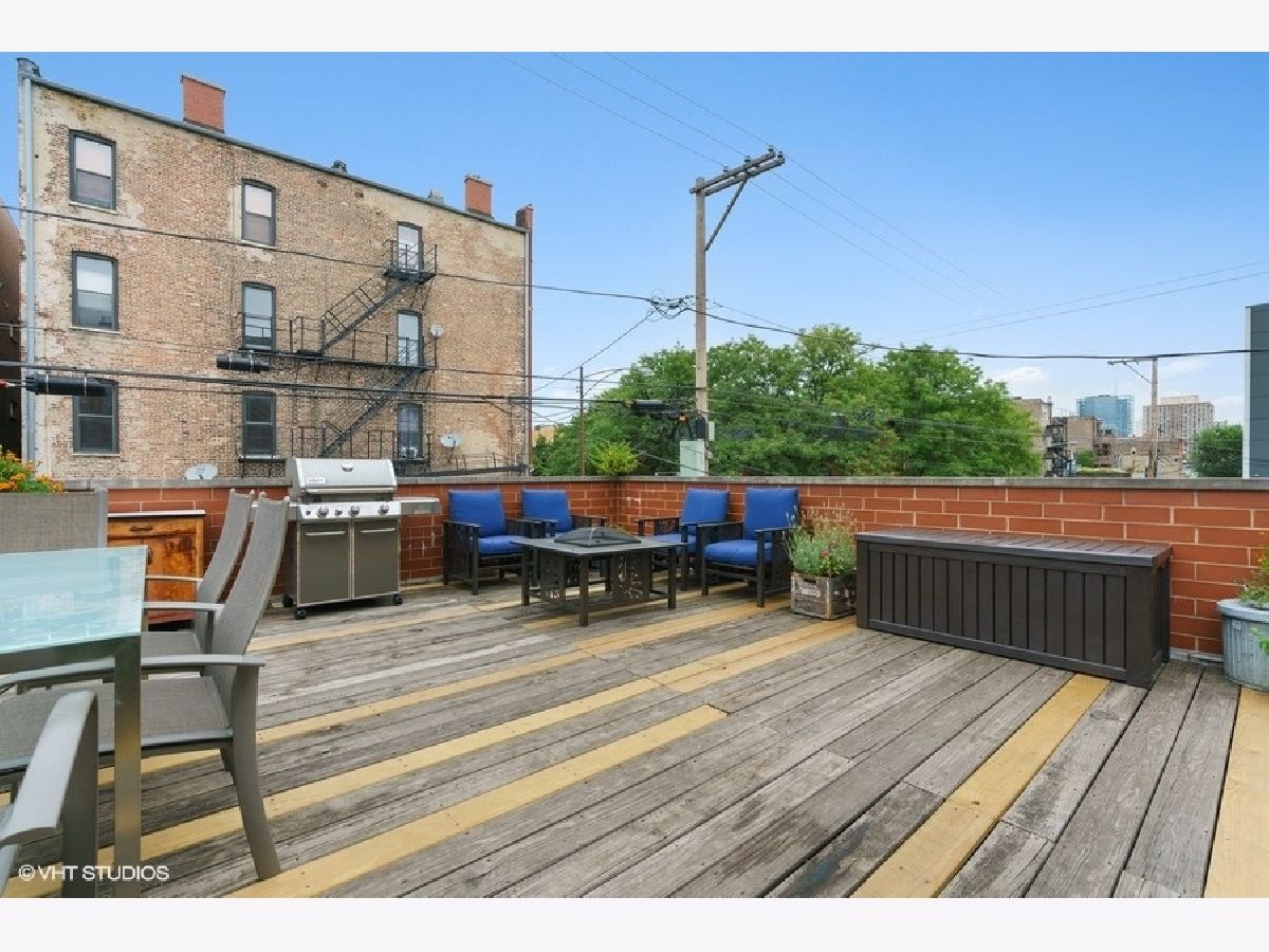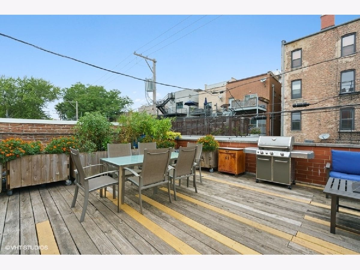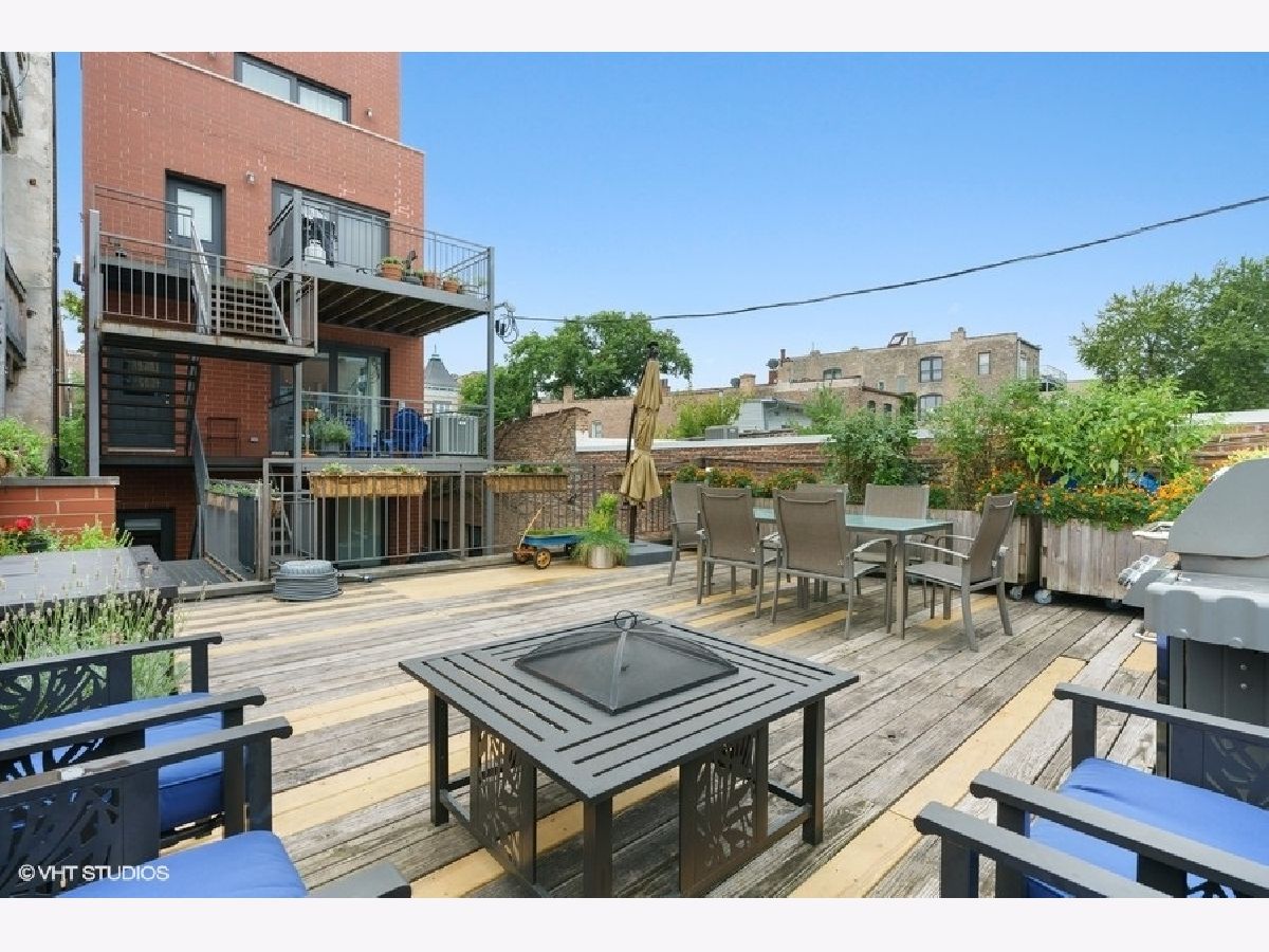 Sunny and bright 2 bed, 2 bath in West Town. Enjoy the outdoors on the two private decks with an over 400sf garage rooftop deck complete with large planter boxes and umbrella plus a second deck directly accessible from both the hallway and primary bedroom. Spacious living room overlooks tree lined street, oversized windows provide abundant natural light, and charming built-in bookshelves. Separate dining area with fireplace. Kitchen boasts shaker cabinets, granite countertops, large island for counter seating, subway tile backsplash, and stainless appliances. Primary bathroom offers stone finishes, double sink, and heated floors. Ample sized second bedroom with full sized window. Recessed lighting, multiple in-unit storage spaces and hardwood floors throughout. Washer/dryer in unit. Parking included in price. Walking distance to all West Town has to offer and kitty-corner from Erie Street Ice Cream & The Irish Nobleman!
