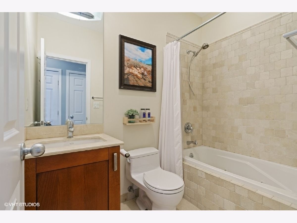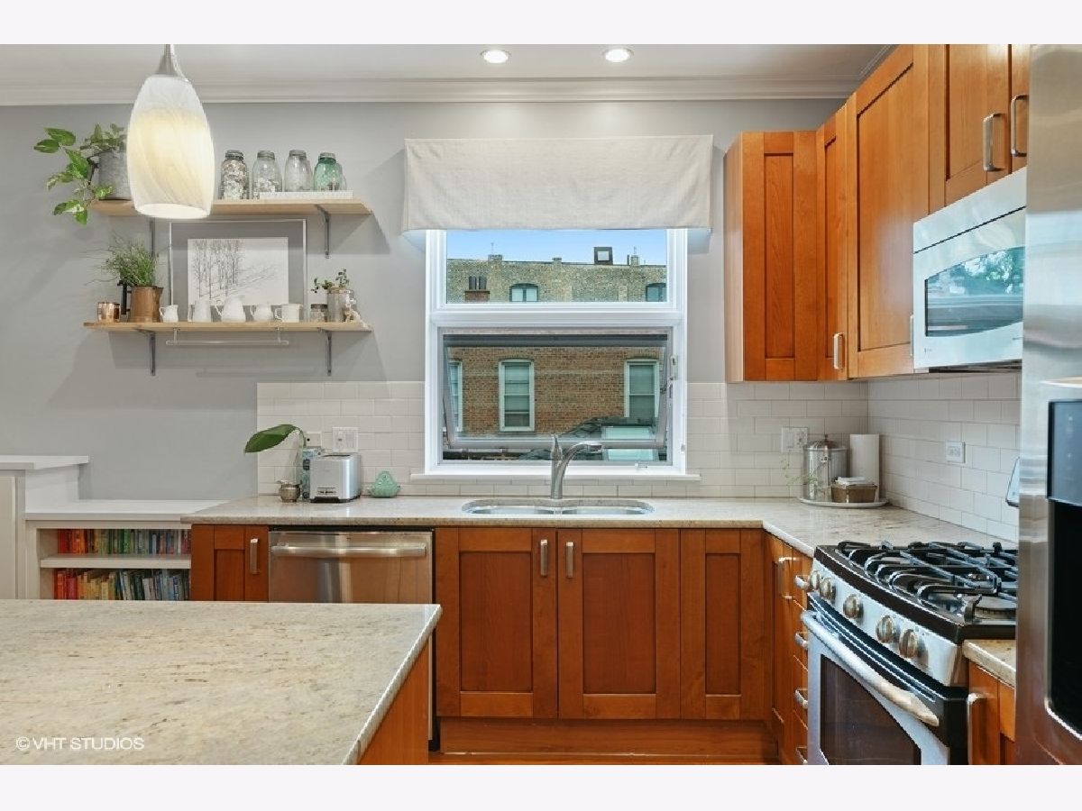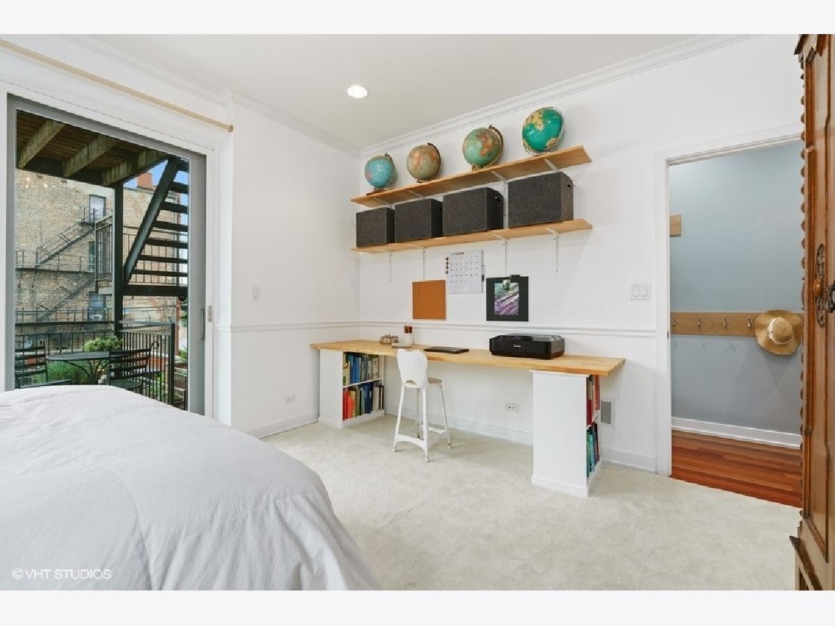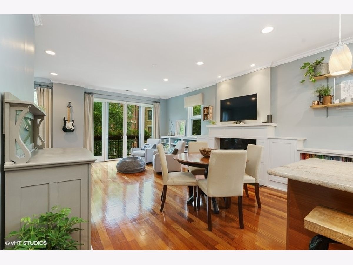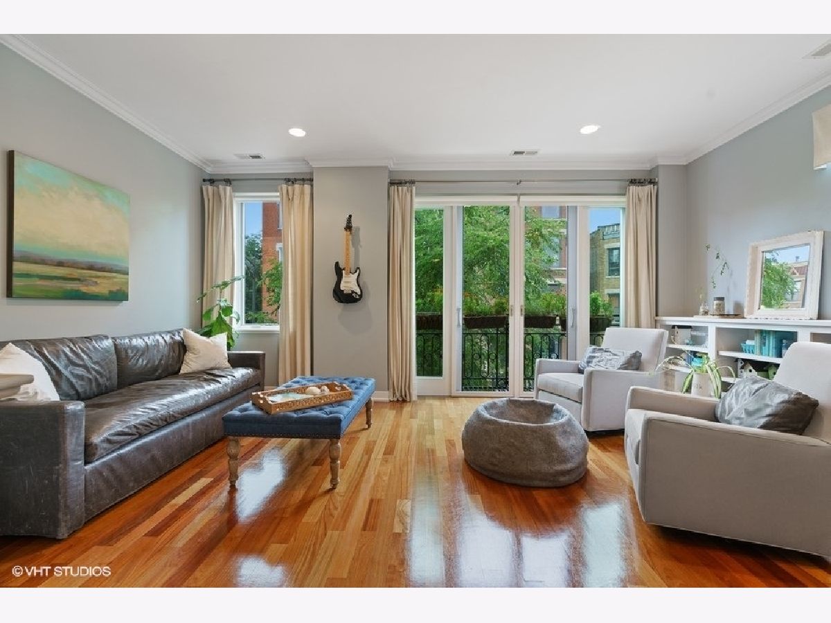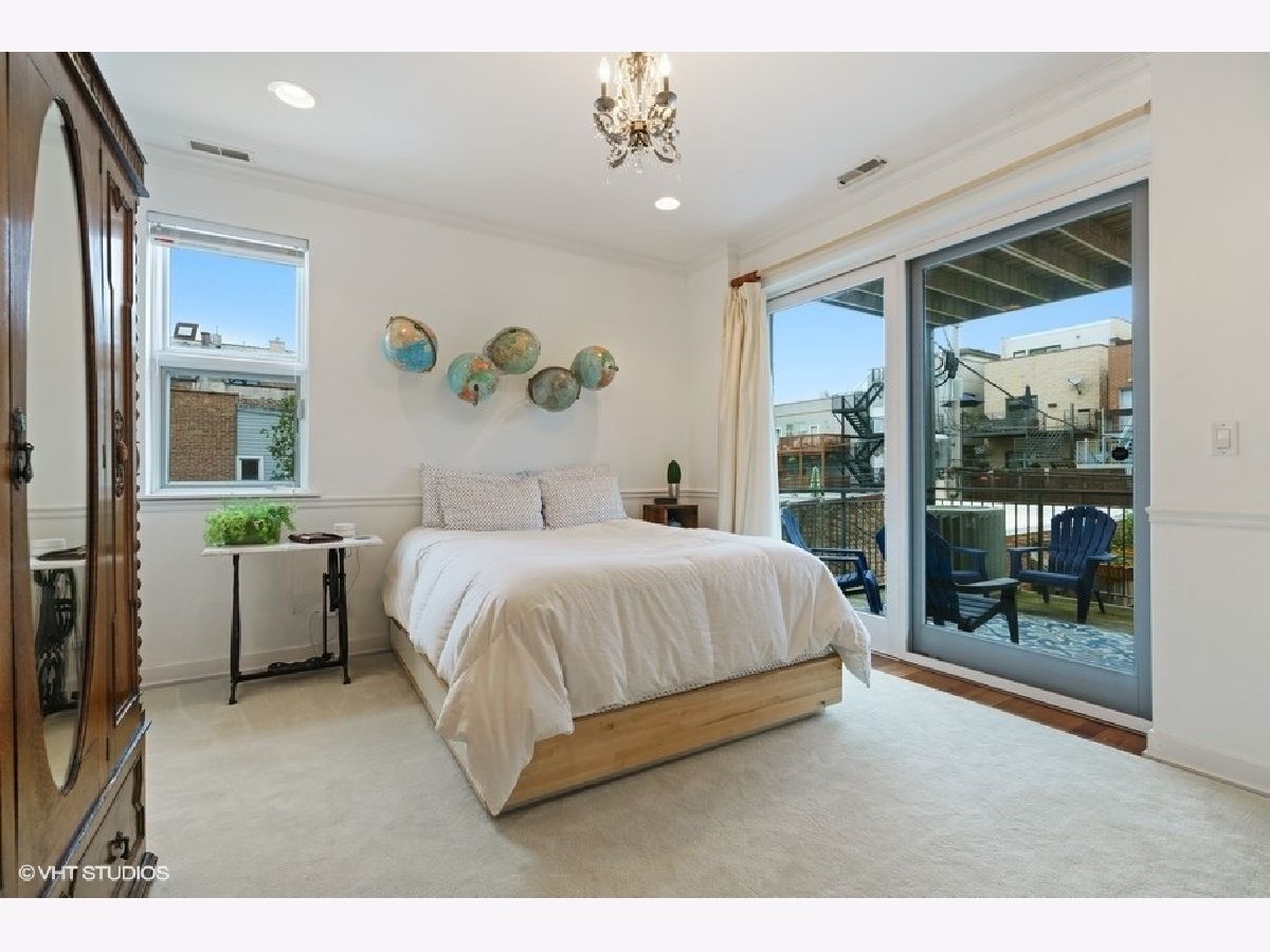 Sunny and bright 2 bed, 2 bath in West Town. Enjoy the outdoors on the two private decks with an over 400sf garage rooftop deck complete with large planter boxes and umbrella plus a second deck directly accessible from both the hallway and primary bedroom. Spacious living room overlooks tree lined street, oversized windows provide abundant natural light, and charming built-in bookshelves. Separate dining area with fireplace. Kitchen boasts shaker cabinets, granite countertops, large island for counter seating, subway tile backsplash, and stainless appliances. Primary bathroom offers stone finishes, double sink, and heated floors. Ample sized second bedroom with full sized window. Recessed lighting, multiple in-unit storage spaces and hardwood floors throughout. Washer/dryer in unit. Parking included in price. Walking distance to all West Town has to offer and kitty-corner from Erie Street Ice Cream & The Irish Nobleman!