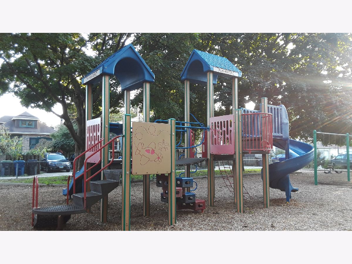 Larger than your standard unit in this type of building. There was a brick addition many years ago extending the back sun room into a real 3rd bedroom. Enter the large bright living room. Down the hallway there is a coat closet. 2nd and 3rd bedrooms are good size. Lovely yellow & grey vintage tiled bathroom with newer vanity. Linen closet in hallway. 17' Kitchen has vintage cabinets with Formica counter top and nice white appliances. There is pace for dining table for 6 or more. The master bedroom in the back is set away from the other bedroom and has a large closet. Individual W/D in basement along with your very own hot water boiler and HWH and loads of storage space. There is a lovely back yard and side patio for your table and chairs. Dobson and Brummel park is uniquely positioned behind the property and just east BETWEEN the alleys. Fully fenced with lots of fun playground structures, open field for soccer, BBQ and covered seating area, this is a great place to take the kids to play.