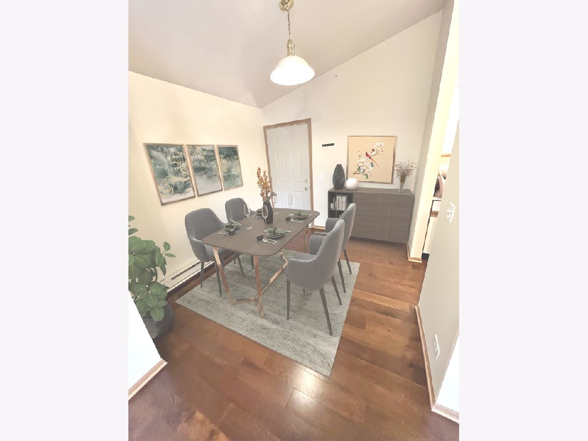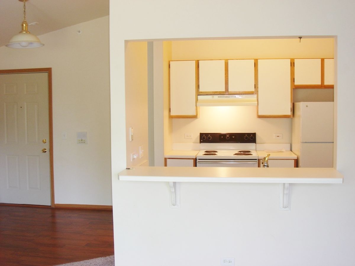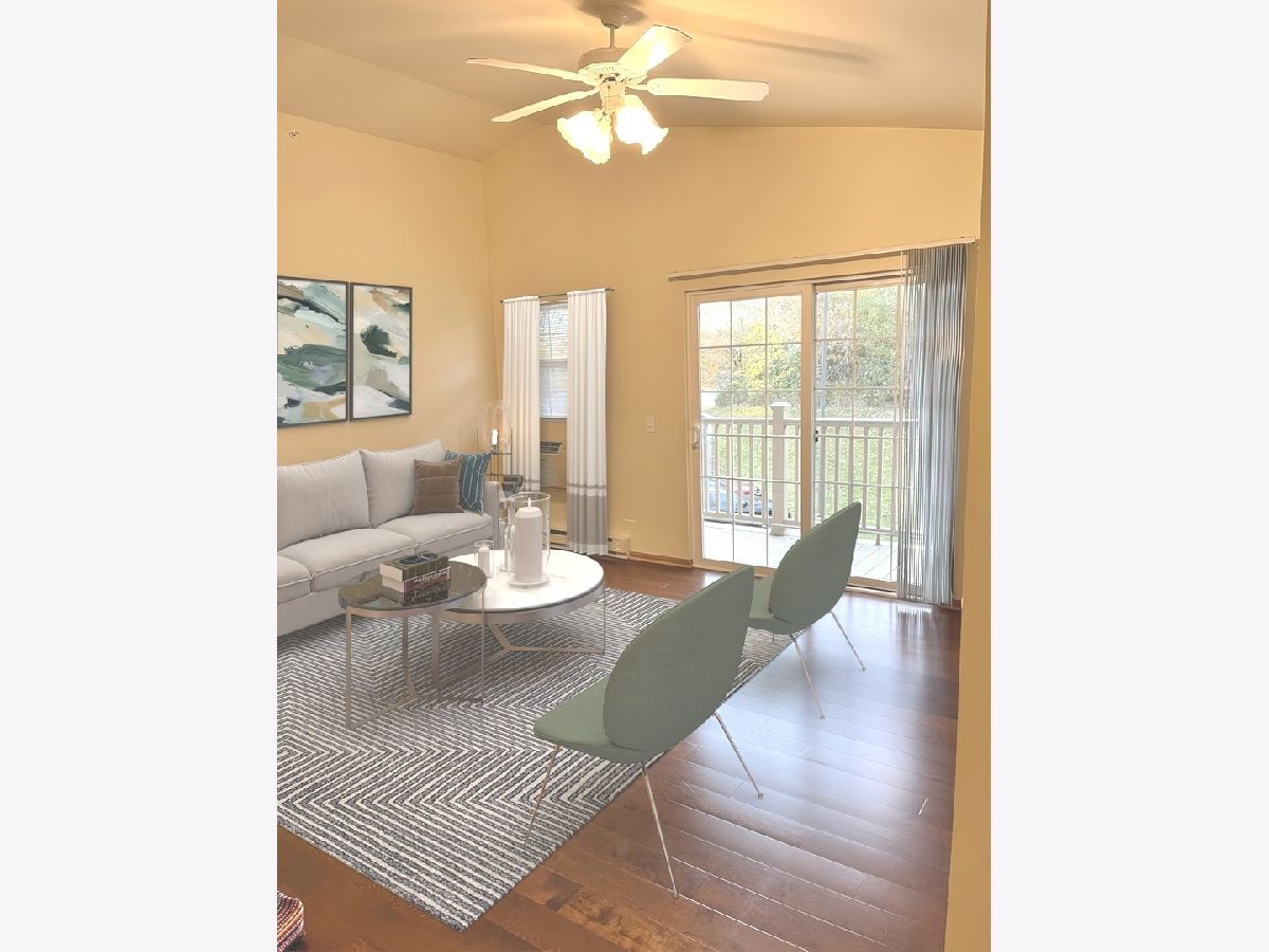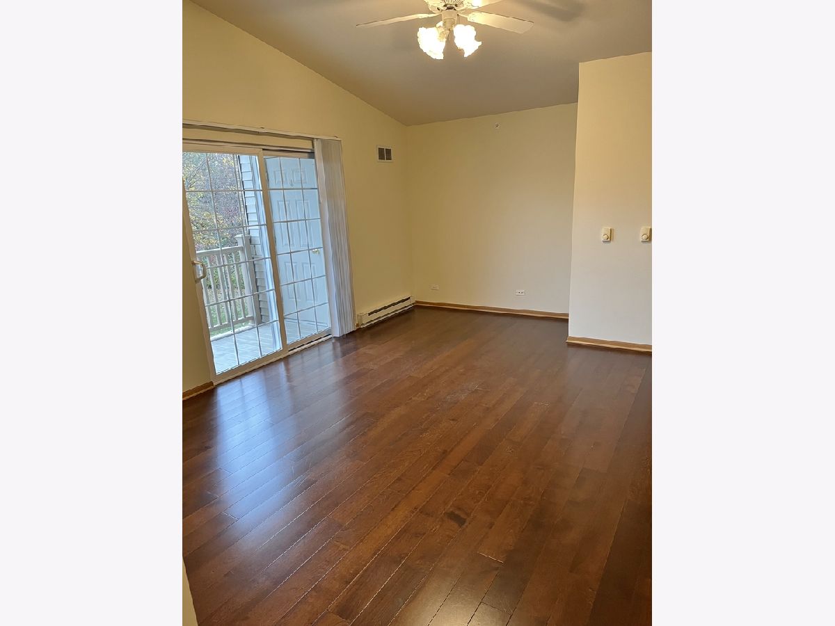 Largest one-bedroom and great end unit! Open floor plan with gorgeous newer hardwood flooring. Freshly painted and newly carpeted. Vaulted Ceilings in Living, Dining, Kitchen. The bedroom features a spacious walk-in closet. Largest bathroom model including 3 closets! Full size washer and newer dryer. Sliding glass doors in the living room lead to a private balcony with an exterior storage closet. Secluded large deck overlooks wooded area. This unit comes with a 1 Car Garage with a key-pad and 2 remotes. It's a great location with lakes, walking paths, and close access to the Long Lake Metra Station. This could be a great option for investors since the units can be rented.