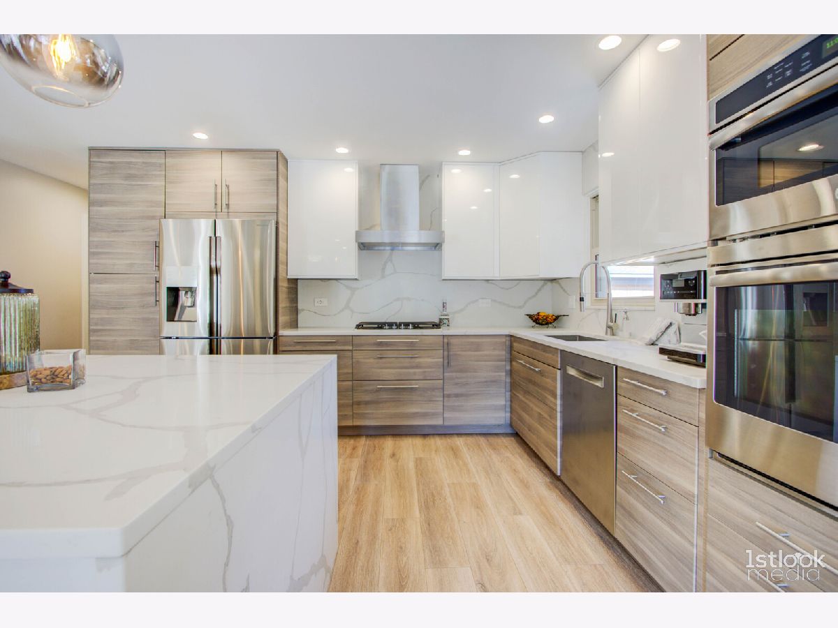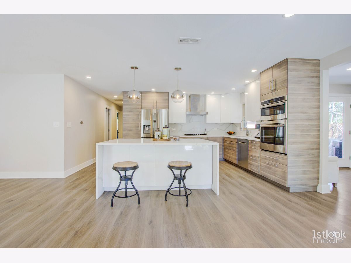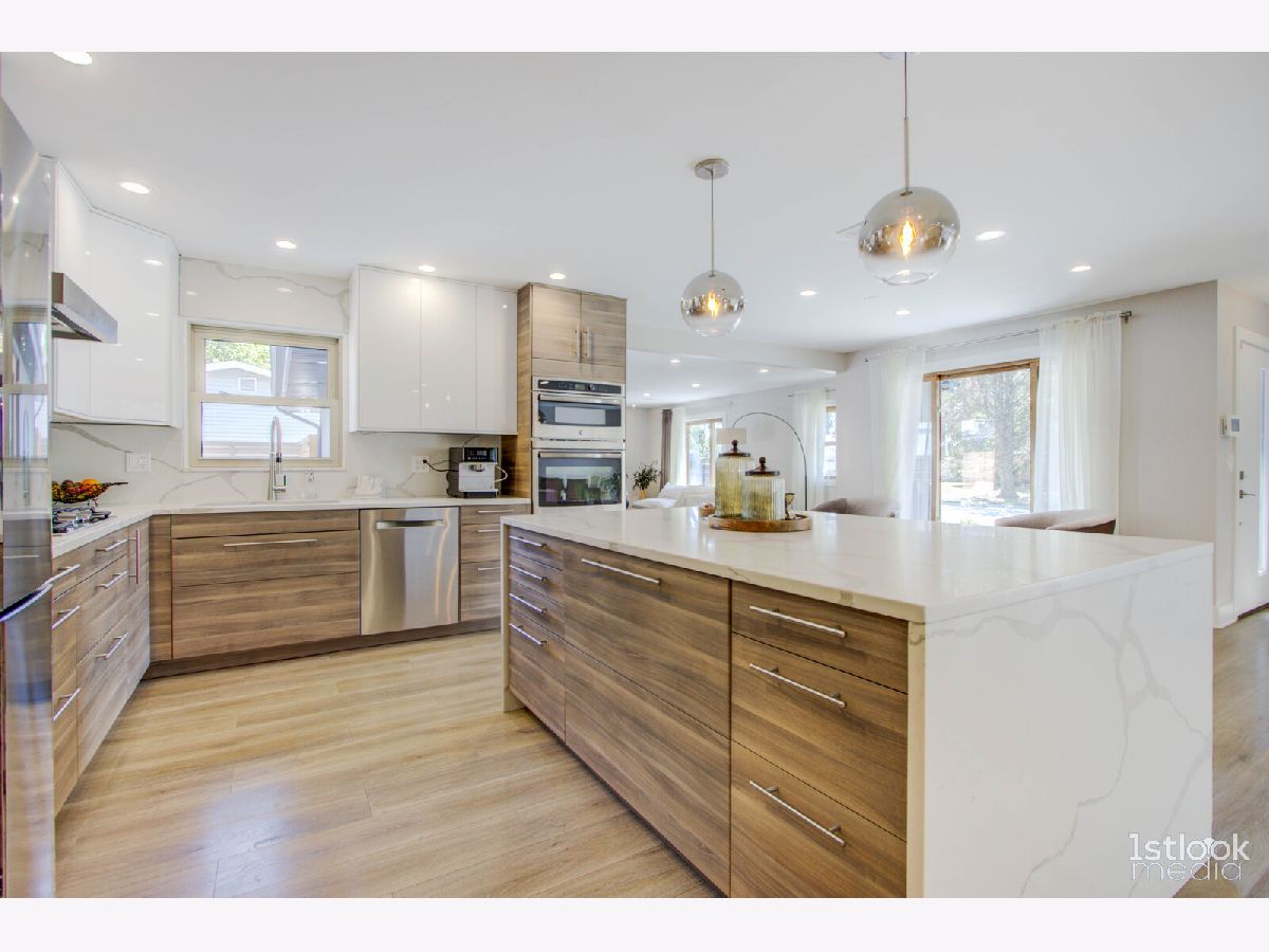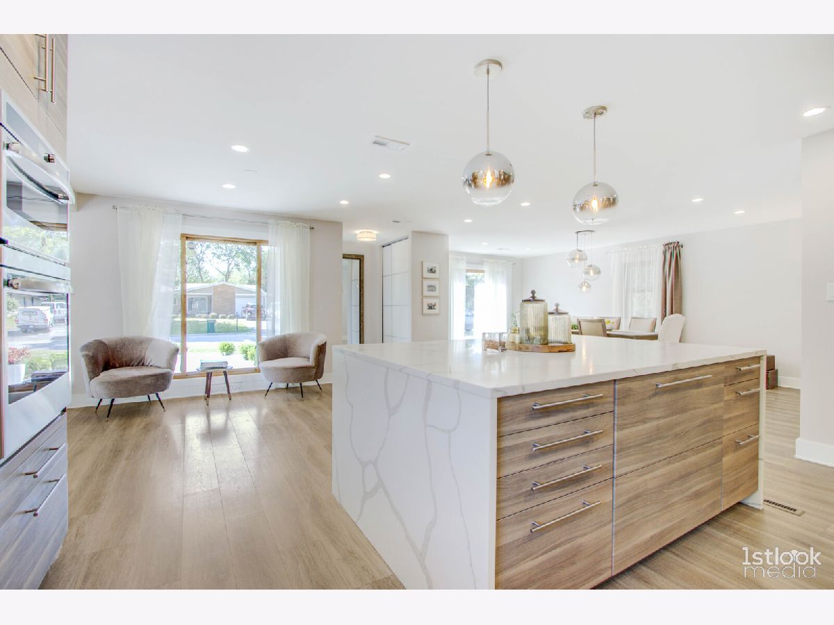 Please click above pictures for full 3D tour ! Very desirable ranch style home in the heart of Darien. Has extended family room, three large bedrooms and 2 baths. Entire home in and out is extremely modern. Total gut rehab completed in 2020. New Roof w/new plywood under/new walkways and new patio/new wood-burning fireplace /new garage opener / new QUARTZ countertops and backsplash/new heated tiles in the bathrooms and soft close drawers and cabinets in the kitchen /AquaGuard-water resistant laminate floors. Beautiful European kitchen, and an open floor plan where you can gather with your family and friends. Backyard is fenced in and very private. There is a detached two car garage. Close to shopping centers and I-55.