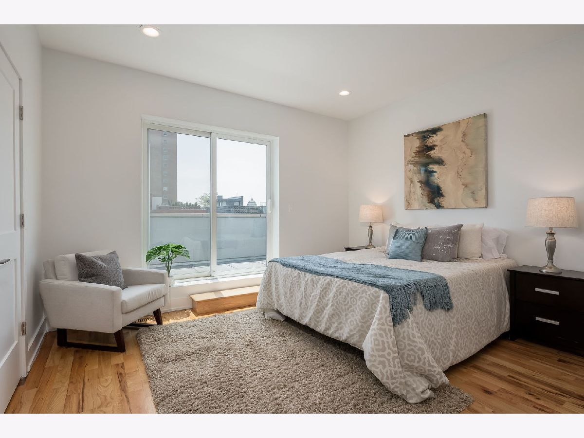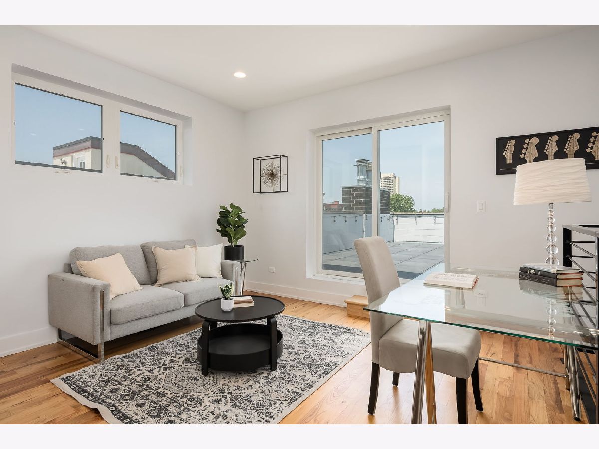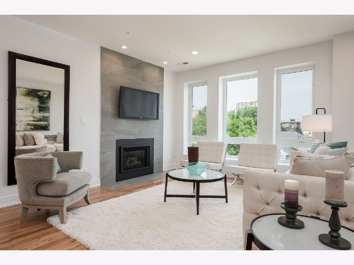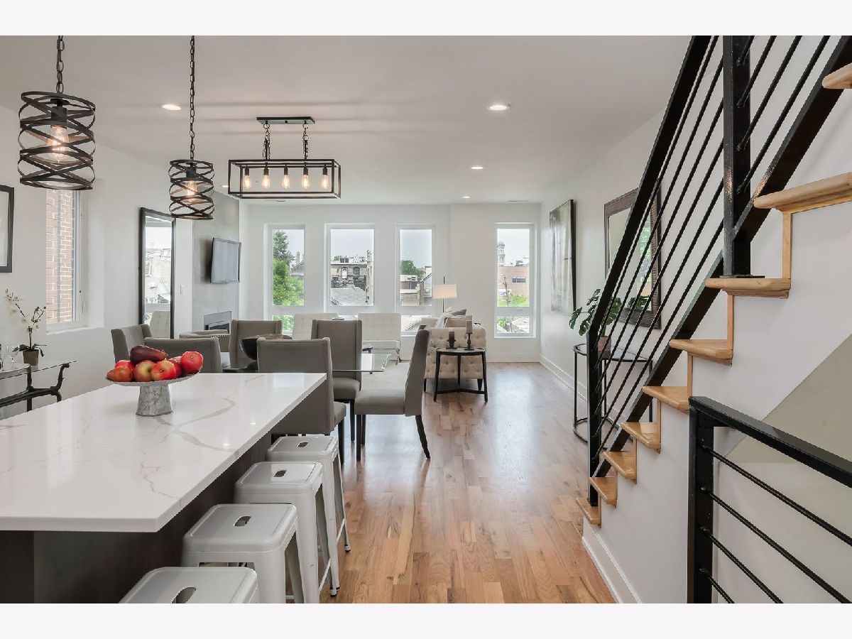 Experience elevated city living in this stunning 4-bedroom, 3-bath Penthouse duplex in the heart of Noble Square. Designed for seamless entertaining and everyday comfort, this home features an open-concept living, dining, and kitchen area flooded with natural light. The beautifully appointed transitional kitchen boasts custom walnut cabinetry, sleek quartz countertops, and high-end finishes throughout. Beautiful solid oak hardwood floors run throughout the home, complemented by soaring 9'+ ceilings and an updated gas fireplace in the main living area. The luxurious primary suite includes a spa-like bath with an oversized shower and heated floors, offering a true retreat. Three additional bedrooms provide flexible space for family, guests, or a home office. Thoughtful upgrades include Elfa closet systems in all closets, maximizing organization and storage. Tech-savvy buyers will appreciate the 5.1 surround sound entertainment centers, plasma point connections, and centralized electronics. Enjoy multiple private outdoor spaces: a large front-facing deck on the second level, a cozy sitting area at the back of the home, and a rear deck-plus an easement to the roof (unfinished), offering potential for future customization. Located just a quick walk from the park, and walking distance to two Blue Line EL stops, plus a vibrant mix of local restaurants and cafes, this home combines luxury, functionality, and unbeatable convenience. A brand-new washer and dryer are to be added, offering even more convenience to this move-in-ready home.