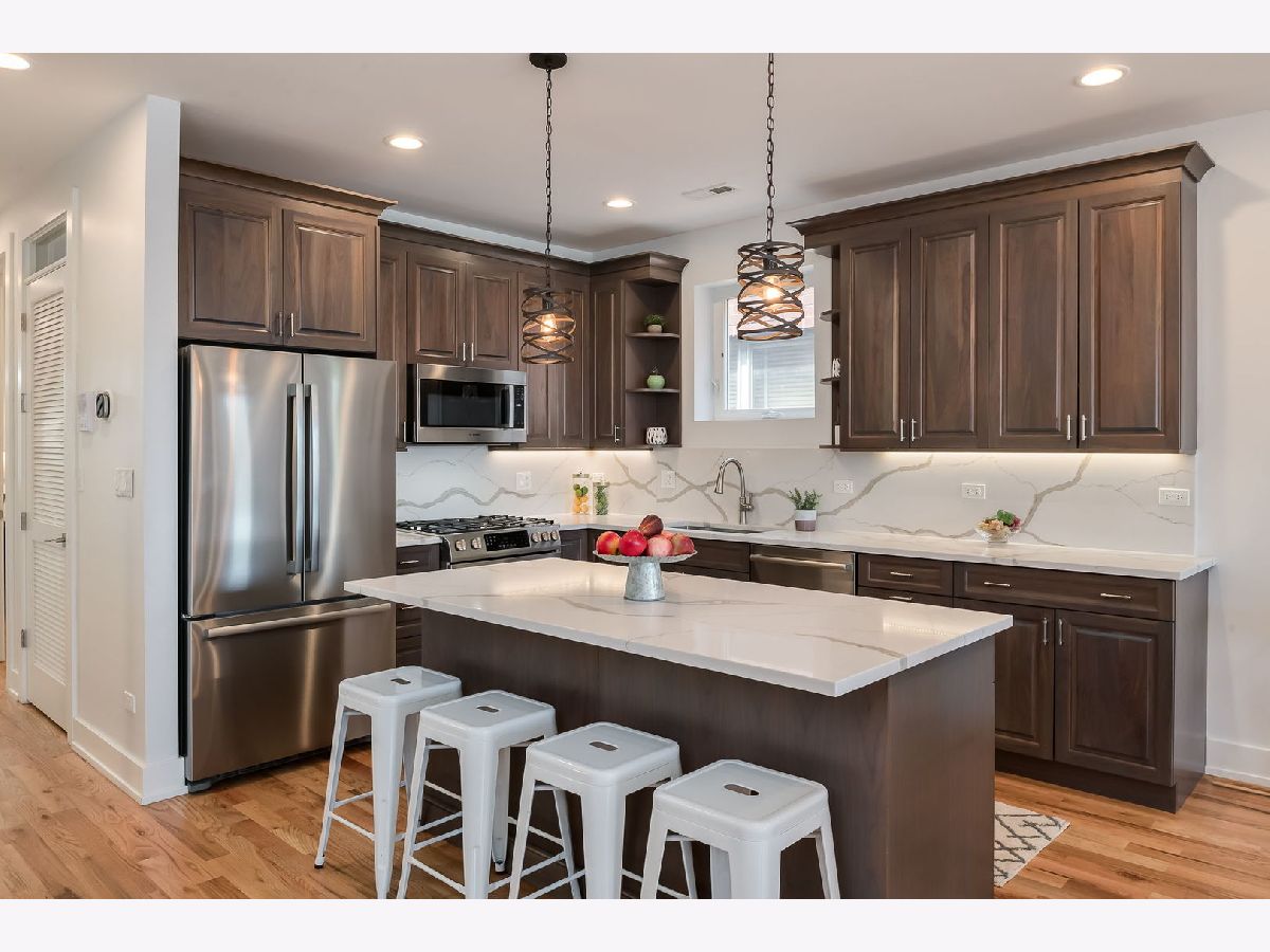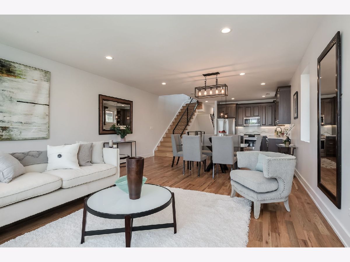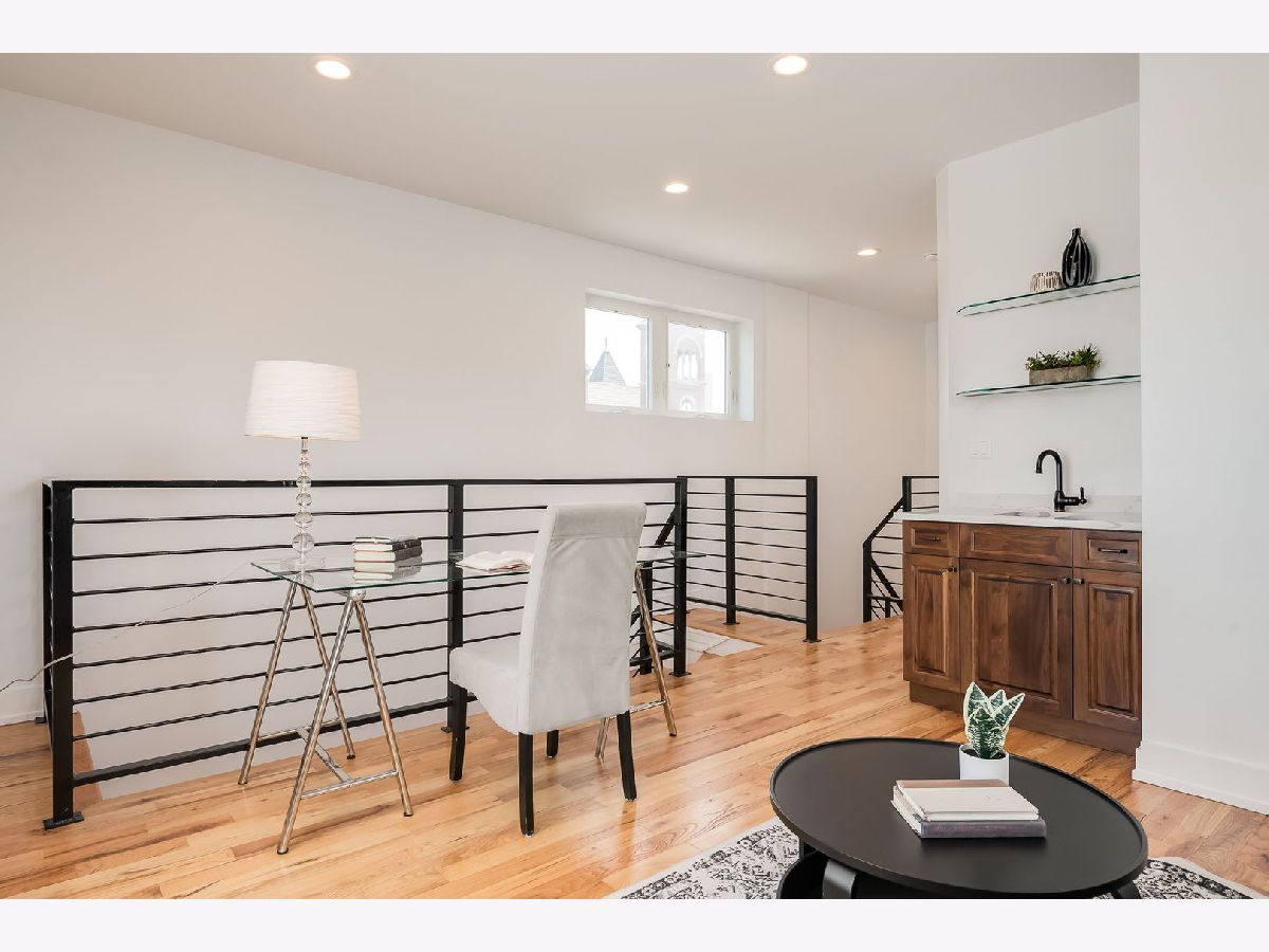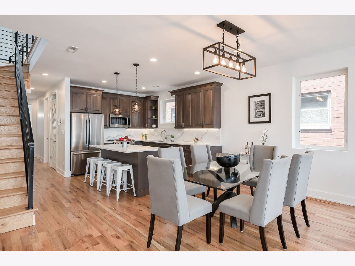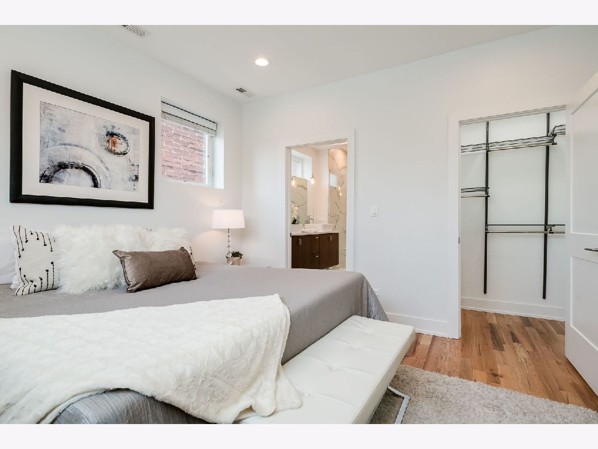 Experience elevated city living in this stunning 4-bedroom, 3-bath Penthouse duplex in the heart of Noble Square. Designed for seamless entertaining and everyday comfort, this home features an open-concept living, dining, and kitchen area flooded with natural light. The beautifully appointed transitional kitchen boasts custom walnut cabinetry, sleek quartz countertops, and high-end finishes throughout. Beautiful solid oak hardwood floors run throughout the home, complemented by soaring 9'+ ceilings and an updated gas fireplace in the main living area. The luxurious primary suite includes a spa-like bath with an oversized shower and heated floors, offering a true retreat. Three additional bedrooms provide flexible space for family, guests, or a home office. Thoughtful upgrades include Elfa closet systems in all closets, maximizing organization and storage. Tech-savvy buyers will appreciate the 5.1 surround sound entertainment centers, plasma point connections, and centralized electronics. Enjoy multiple private outdoor spaces: a large front-facing deck on the second level, a cozy sitting area at the back of the home, and a rear deck-plus an easement to the roof (unfinished), offering potential for future customization. Located just a quick walk from the park, and walking distance to two Blue Line EL stops, plus a vibrant mix of local restaurants and cafes, this home combines luxury, functionality, and unbeatable convenience. A brand-new washer and dryer are to be added, offering even more convenience to this move-in-ready home.