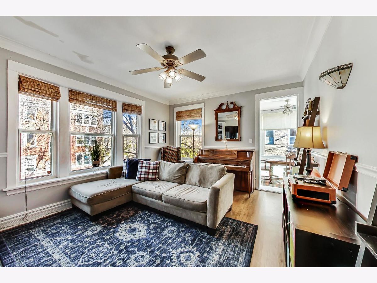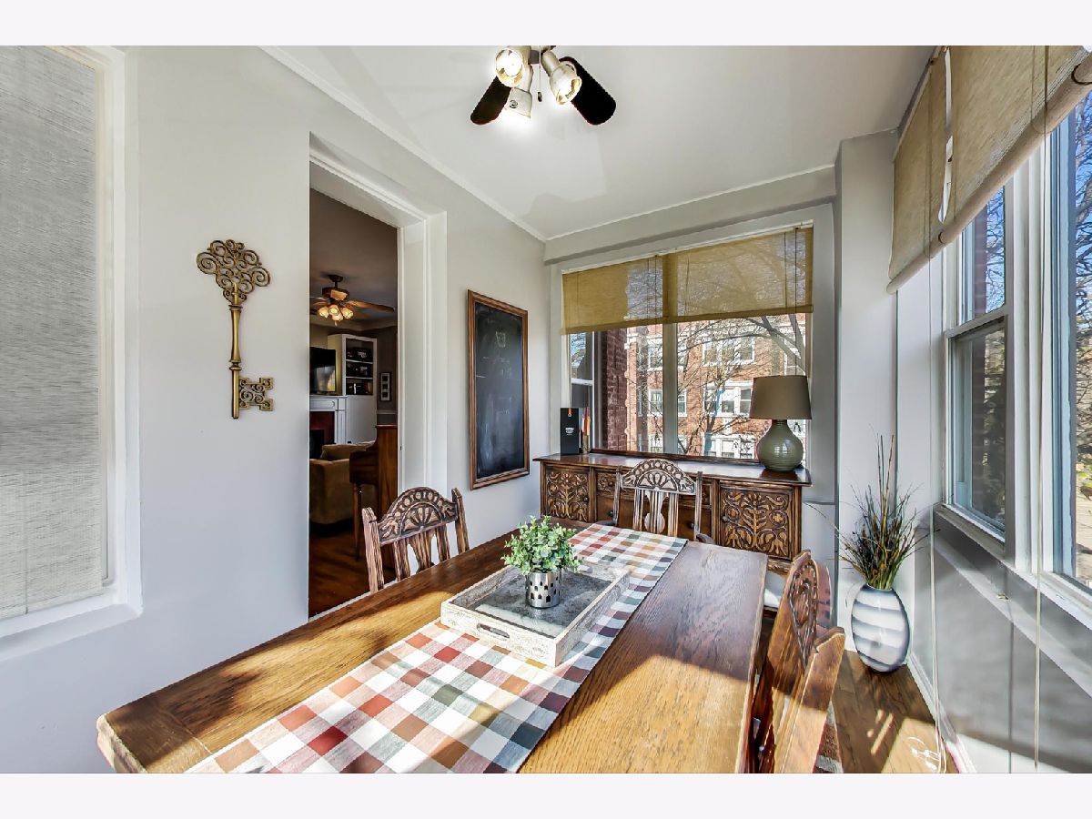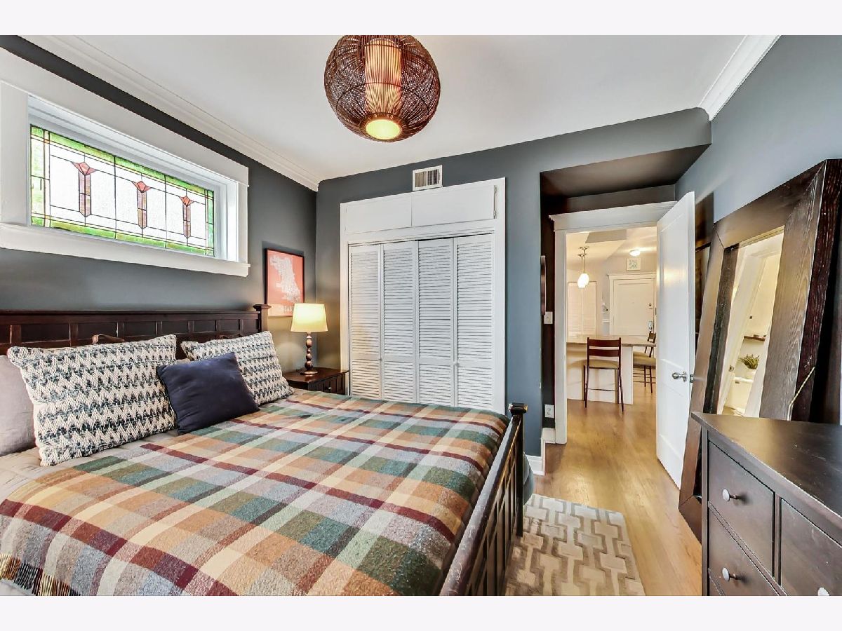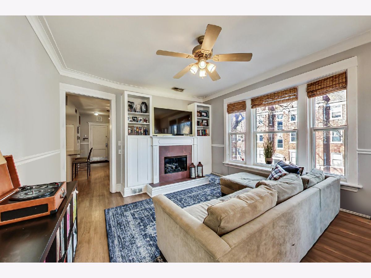 Charming, yet spacious 2 bedroom, 1 bath corner condo on the south edge of Rogers Park near Edgewater and Loyola. 2nd floor of an all-brick building. Amazing sunlight due to an abundance of windows on three sides and a fantastic floorplan. Formal foyer greets guests and welcomes them into your new home, complete with a large coat closet. The ample kitchen features maple cabinets with tons of storage and counter space, an island with seating for three, granite countertops, stainless steel appliances and a pantry. The large living room features a gas fireplace, tons of oversized windows which look out over a quiet, tree-lined, one-way residential street and opens to a large bonus sunroom currently used as a dining room, but would also make a fantastic home office. The primary bedroom fits a king bed with ample space for nightstands and a dresser along with a reach in closet, with additional storage space overhead, perfect for luggage storage or out of season clothes. The second bedroom can fit a queen sized bed and makes a great combo bedroom/office due to its length and has a huge walk-in closet. Off the hallway is a marble bath with a built-in toilet/bidet combo (no more Covid toilet paper worries) as well as the in-unit laundry closet. There is also a small outdoor space with a grill that is included with the condo. The condo is in fantastic shape with hardwood floors throughout that were refinished in 2016, newer paint, central heat with a new furnace in 2017 and central air. Everything you need at a great price. Preferred Rogers Park location on a tree-lined street near Devon, the lake, the Red Line and shops and restaurants. Easy, non-permitted street parking or off-street rental parking nearby. Well managed, proactive building with a new tear off roof in 2020. Plenty of storage space as a large, appx 8 x 10 storage unit in the basement is also included in the price. This is a great, not to be missed condo.
