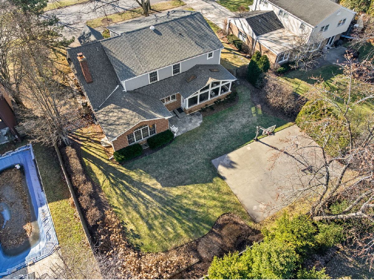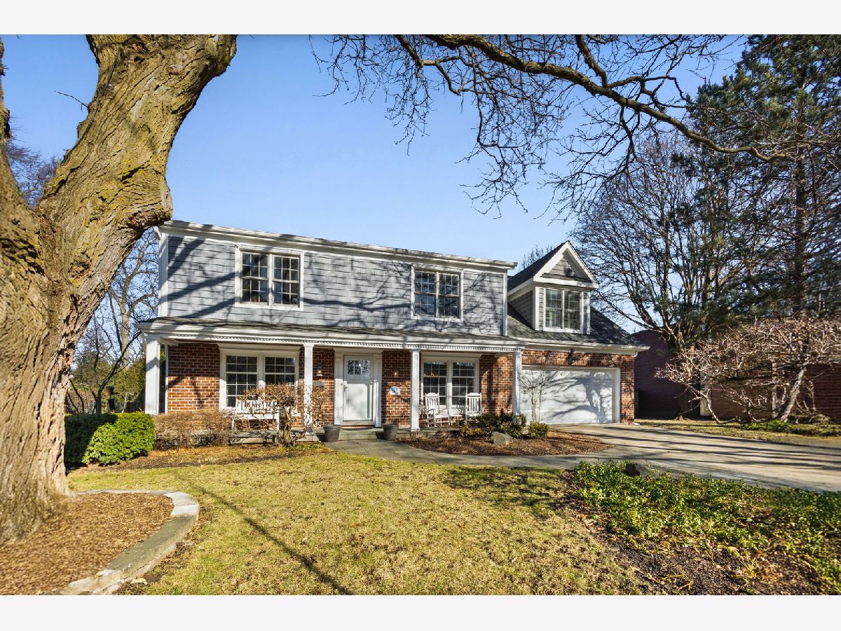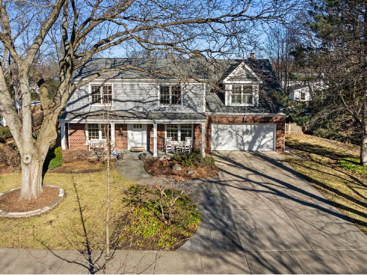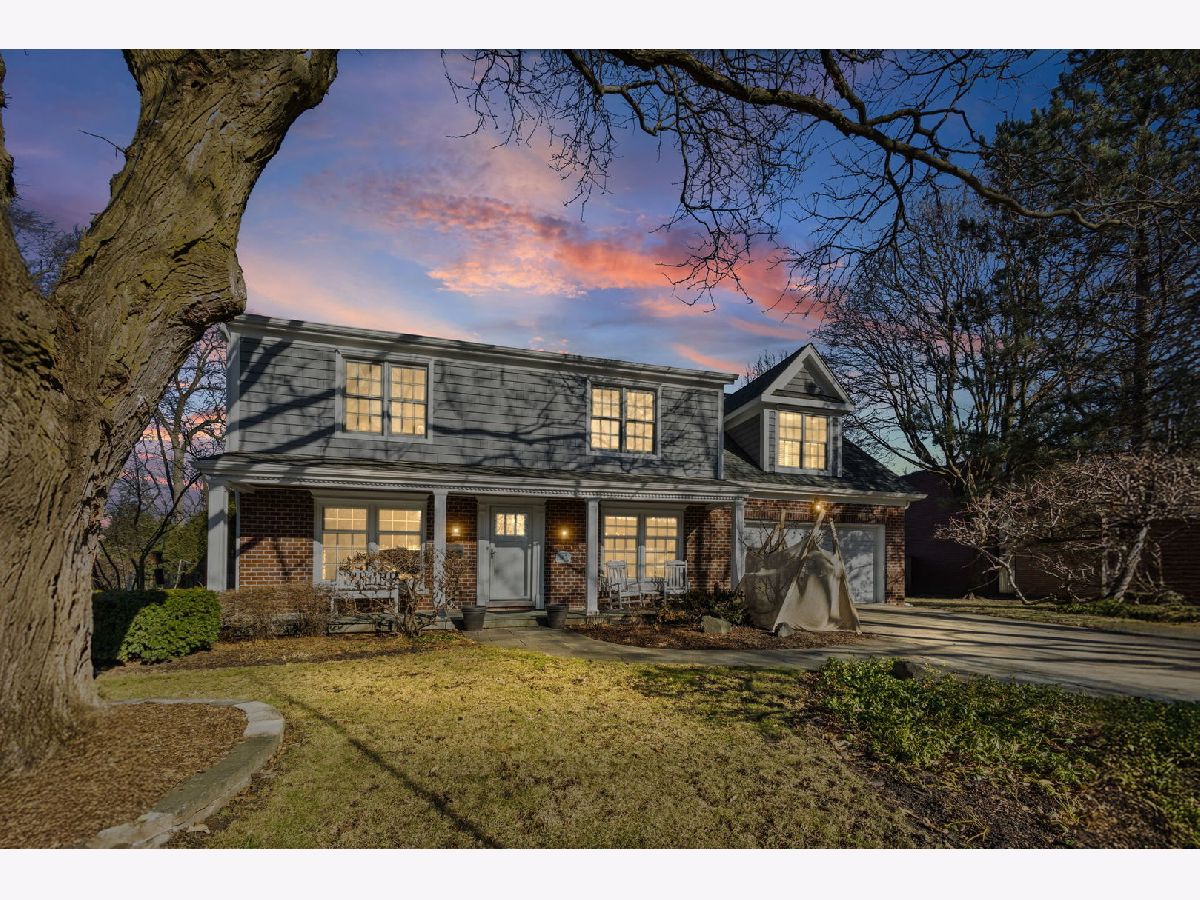 Positioned on a prime lot in coveted Tall Trees, this New England inspired colonial will captivate your heart with impressive features and classic charm at an unbeatable location. The bluestone walkway usher you through a charming covered front porch into the homes center foyer. The main level boasts a thoughtful layout ideal for entertaining and every day living and is marked with beautiful Hardwood Floors and crisp crown molding. On the left a formal living room radiates character with multi pane picture windows and French doors to the attached office. The dining room to the right is perfect for large gatherings, the chair rail extends the traditional feel. The main hall invites you to the heart of the home; a show stopping New England kitchen right out of a magazine. Boasting beamed ceilings, custom wood cabinetry topped with soapstone counters, Wolf double wall ovens and 6 burner cooktop, deep farm sink overlooking the backyard, a large center island with prep sink and 4 inch thick butcher block top that offers seating for 3. The adjacent breakfast area with it's floor-to-ceiling brick fireplace is flanked by stylish custom bookcases. French doors to the adjacent family room sport a beamed cathedral ceiling with warm wood paneled walls and an expansive window overlooking the lush yard. Off the kitchen is the beautiful three season porch, perfect for casual gatherings, exiting to a Bluestone patio and to the concrete basketball court. Tucked away off the main hall is a versatile office and a powder room. Upstairs you'll find five generously size bedrooms each with organized closets and three luxurious bathrooms. The serene and extensive primary suite features Hardwood Floors, vaulted ceilings, wainscoting and custom walk-in closet. The spa like en-suite impresses with double vanity complete with Carrera marble, wainscoting, soaking tub, walk in shower and private water closet. Bedroom 3 impresses with double closets and its own en-suite featuring a large shower and natural stone tiling. Spacious hall bath offers a double sink vanity and a tub shower. The finished and expanded basement boasting tiled floors offers even more living space including a family room with built-ins, hobby/gaming space and a large extra deep area perfect for exercise or recreation. A large laundry room with white cabinetry, utility sink and ample storage enhances the functionality and extra storage areas enhance organization of the home. A mudroom entering from the 2 car garage and a fully fenced in yard, new roof and furnaces complete it all. This impressive home offers refined living in one of Glenview's most desirable locations within walking distance to the Metra, downtown Glenview and the Glen. This is the home you have been waiting for where timeless style meets every day convenience.