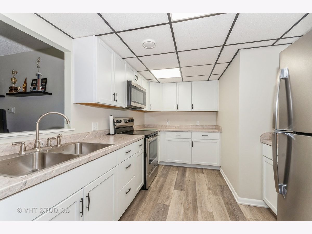 Perfect second floor condo with parklike courtyard views. All New(2022) white kitchen cabinets, new stainless steel appliances, new lighting & electrical switches/receptacles, new countertops, new luxury waterproof vinyl plank flooring in the kitchen, bath, entry and laundry. New carpeting, freshly painted throughout, new hot water heater, new bathroom vanity. Very quiet complex/building with elevators to the underground climatized parking garage. Unit comes with 1 car space in garage. New windows 2023 in BR.