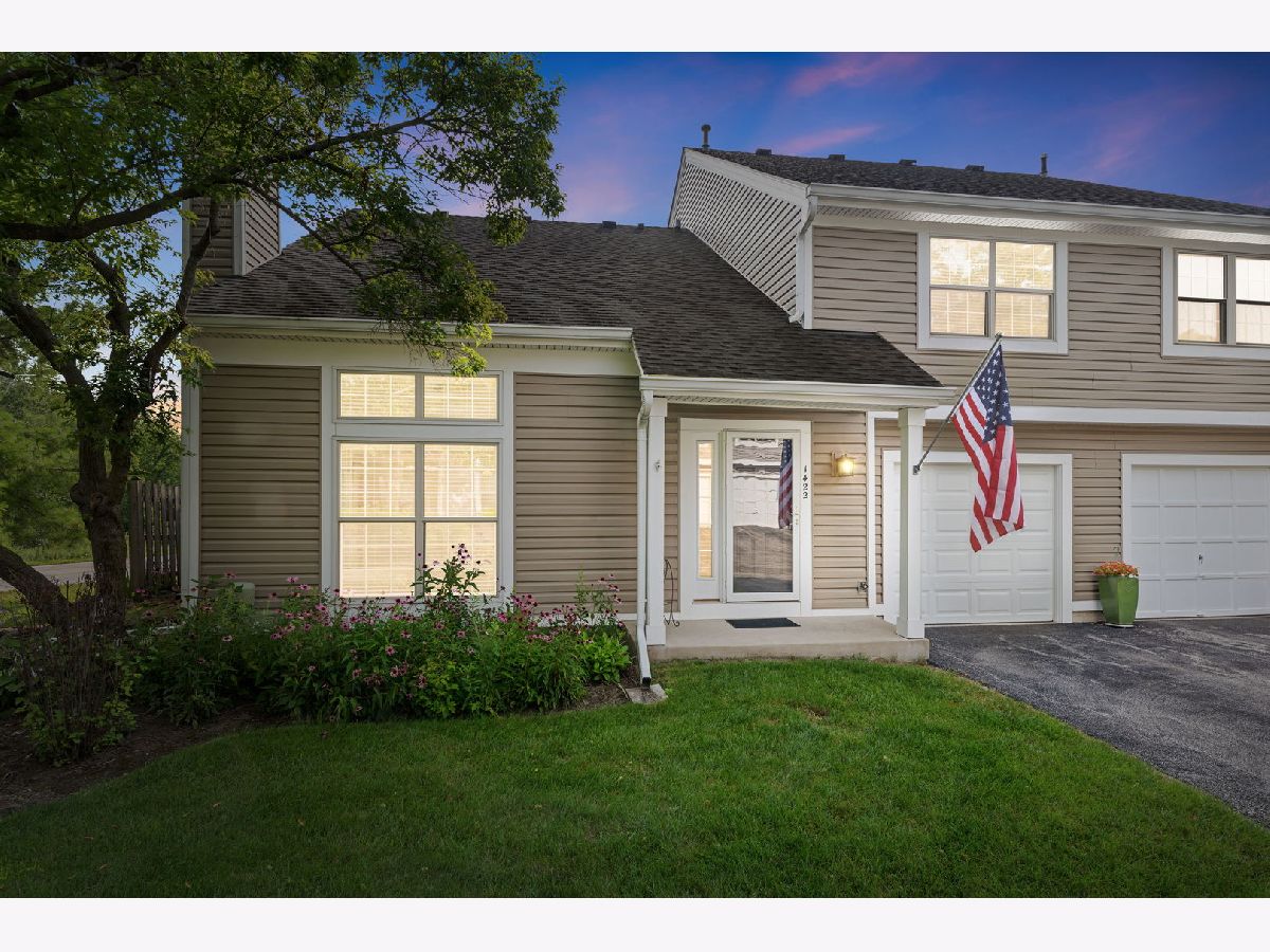 Beautifully Updated End-Unit Townhome in a Prime Location! Step into this light-filled home featuring an open concept floor plan and stylish upgrades throughout. The vaulted living room showcases a stunning fireplace with custom millwork and a dramatic mantle, complemented by gleaming hardwood floors that flow seamlessly into the dining area and kitchen. The kitchen is a true standout with stainless steel appliances, crisp white baseboards and trim, an open pantry with convenient pull-out drawers, and a full-sized washer and dryer tucked neatly away. The first-floor bathroom includes durable wood-look vinyl flooring, a pedestal sink, and elegant triple baseboard detail. Upstairs, you'll find two generously sized bedrooms with newer carpeting and refined trim accents. The owner's suite includes a spacious walk-in closet, while the shared full bathroom boasts a double vanity, new flooring, and a new relaxing soaker tub/shower combo and tile. Enjoy outdoor living on the private patio just off the dining room, perfect for grilling and entertaining behind a cozy privacy fence. The attached garage features epoxy flooring, drywall, and painting. Plus, additional guest parking is available on every street. Nestled near the scenic Deer Grove Forest Preserve, Deer Park Town Center, dining, entertainment, and shopping. This home provides both comfort and convenience. Sold "AS IS."