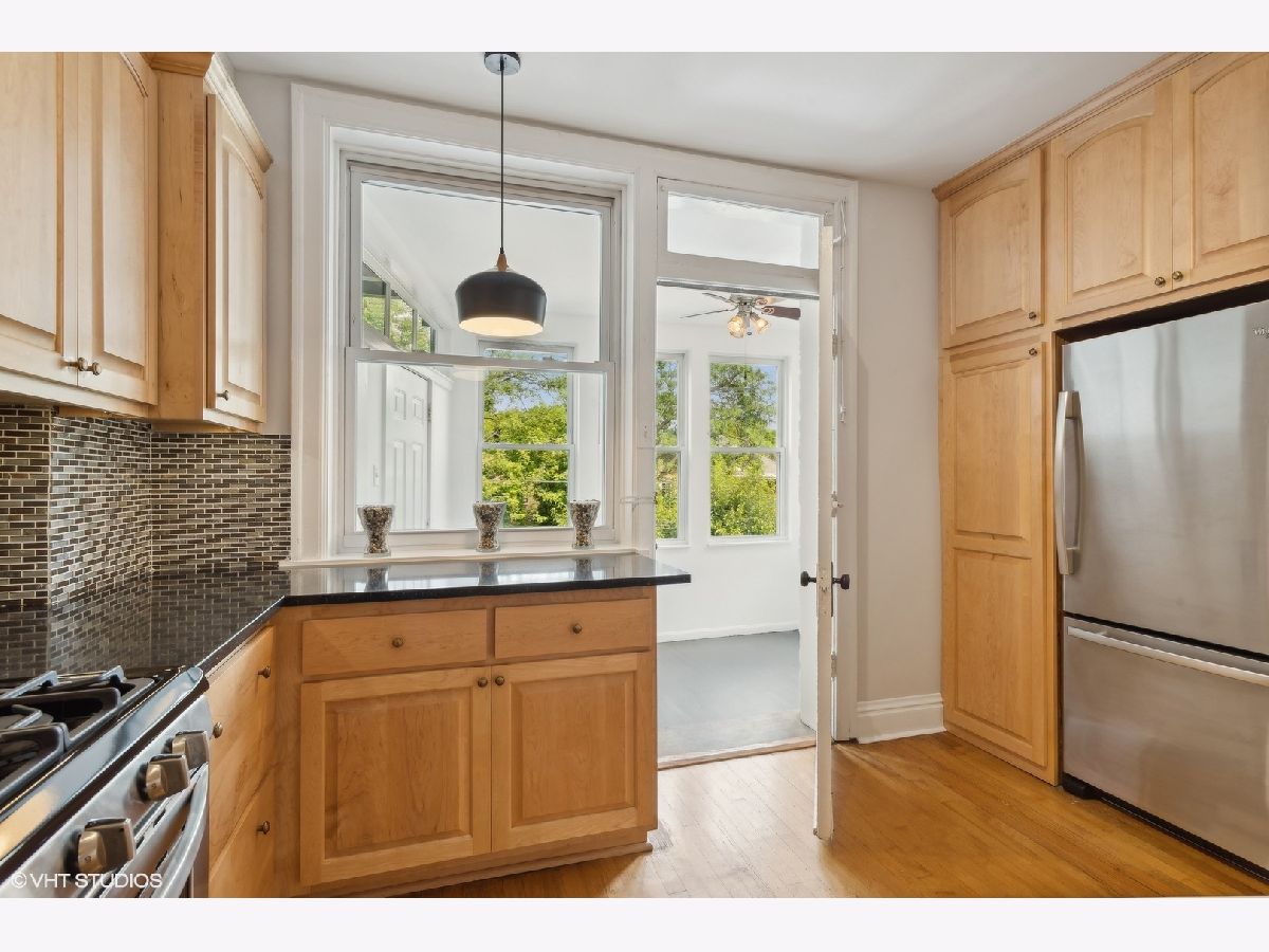 EDGEWATER GLEN! A harmonious blend of modern elegance and vintage realness await you in this beautifully updated extra-wide 1600+ sq ft flat with classic finishes. High ceilings and wrap around South facing windows create a sophisticated inviting atmosphere with an all day glow. With hardwood floors, in-unit washer/dryer, central heat living is easy in this space. Extra large dining area is perfect for just that or create a family room! The kitchen is a chef's delight, featuring sleek quartz countertops, stainless steel appliances, wood cabinets, and an elegant undermount sink paired with a stylish tile backsplash. The enclosed sun porch offers a versatile work from home situation or breakfast nook, perfect for leisurely mornings. Step outside to the expansive rear patio area, ideal for grilling and entertaining in a spacious, open environment. This unit comes with a garage and a big storage unit for comfort and convenience. Situated just moments from CTA rail and bus lines, Whole Foods, Loaves & Witches Cafe, Hollywood Beach, and the lively shopping, dining, and nightlife of Andersonville, plus a short distance to Loyola University, this location is unbeatable. Enjoy the benefits of a well-managed association with low assessments and a common area rear yard designed for grilling and relaxation. Please note: Dogs are not permitted but cats and emotional support animals are.