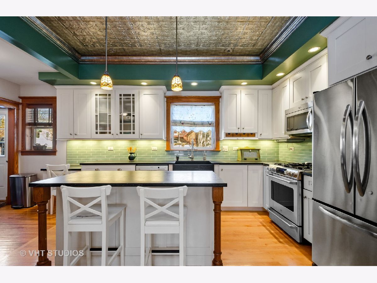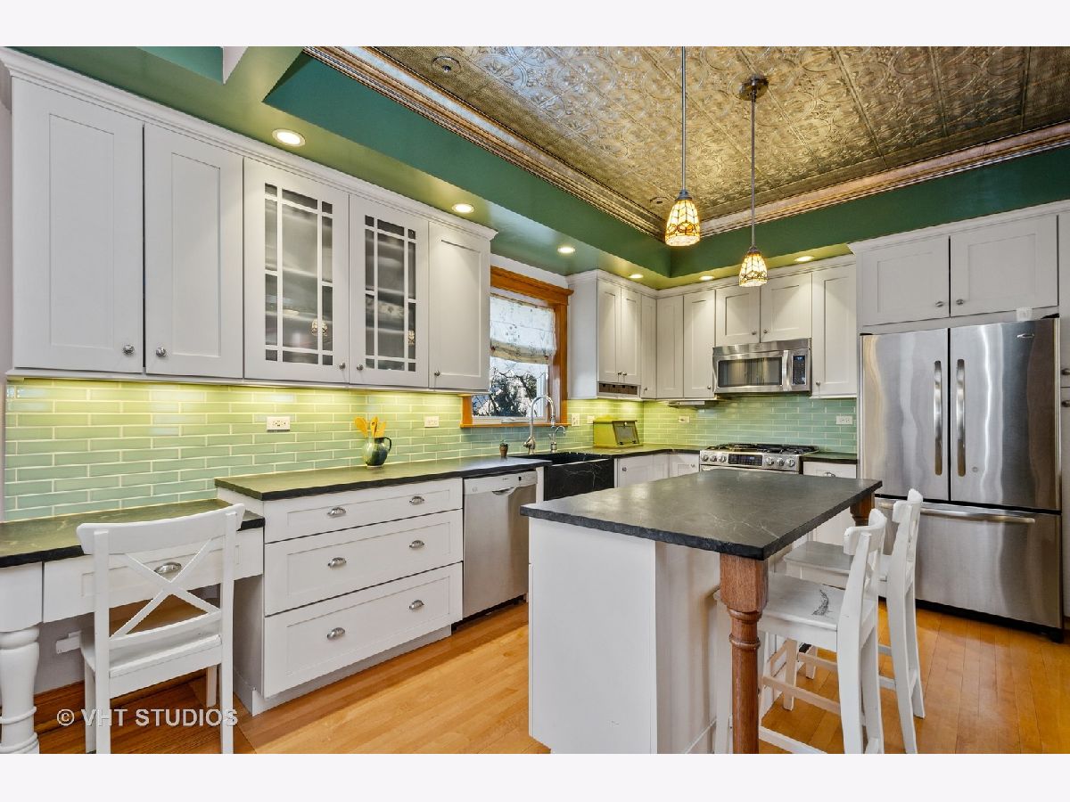 Welcome home to this beautiful 4 bedroom and 1 full and 2 half bathroom home in the heart of Edgewater Glen. This home truly embraces all the vintage charm with modern upgrades. Totally rehabbed in 2007, the home boasts windows galore, including newly uncovered windows flooding the open floorplan with light. The spacious living room and dining room has a beautiful mosaic tiled gas fireplace, built in bench that also has storage in the seats and flows seamlessly into the impeccable chef's kitchen. The kitchen features soapstone counters and island, plenty of gleaming custom white cabinets, stainless steel appliances, custom hot water faucet for instant morning tea and a walk-in pantry. The second floor has 3 large bedrooms. The primary is a double room looking out on the beautiful treelined street. Each has amazing closet spaces. Up the full staircase is a fully done attic. Currently being used as a huge playroom and office, the space is already plumbed to create a dream primary suite with large closet and primary bath. Hardwood and Radiant floors throughout the home. The basement was rehabbed in 2018. With high ceilings and beautiful flooring and a powder room, and so much storage, the basement is a place for entertaining. The home sits on an oversized lot which creates a huge backyard for all the outdoor activities you can imagine, just in time for summer! All this in walking distance to the EL, Whole Foods, the Lake, beaches, lakefront trails, parks, restaurants, and so much more!