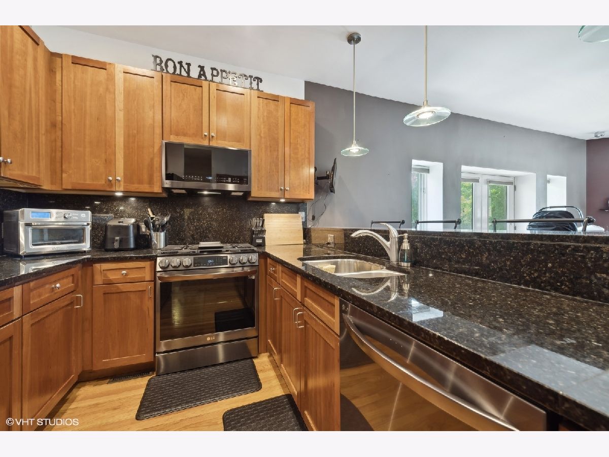 Gorgeous rehabbed 2 bed/2.1 bath duplex-down with great room proportions. Large living/dining room & kitchen are on top floor that is flooded with light from huge windows & looks out onto a landscaped side yard. SS kitchen appliances w/ granite countertops and backsplash. W/D in-unit & 1/2 bath off of kitchen. Lower level features 2 large bright bedrooms & a bonus family room/media room - leading out to a huge & private 320 sq/ft outdoor side patio. Baths have all been redone and upgraded. 1 garage parking space included in price. Must see!!