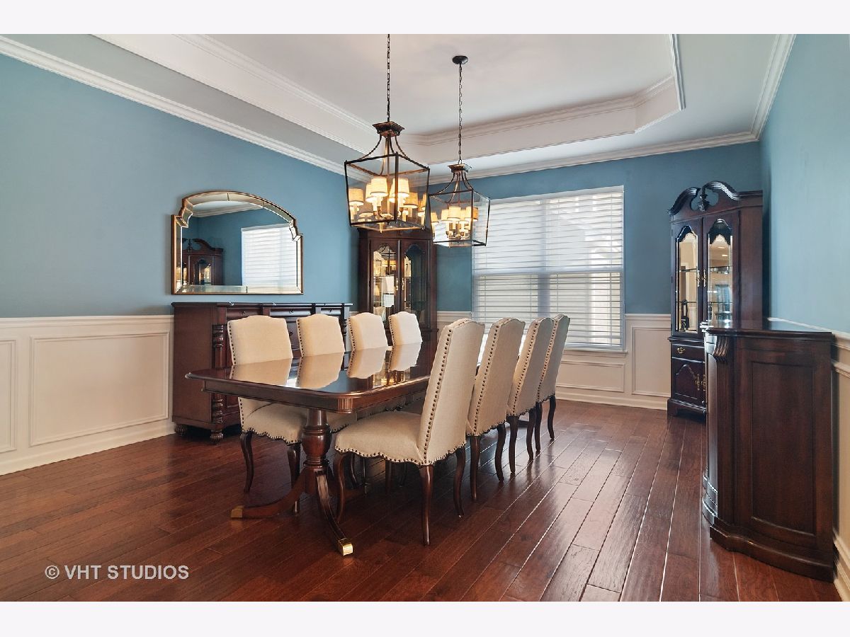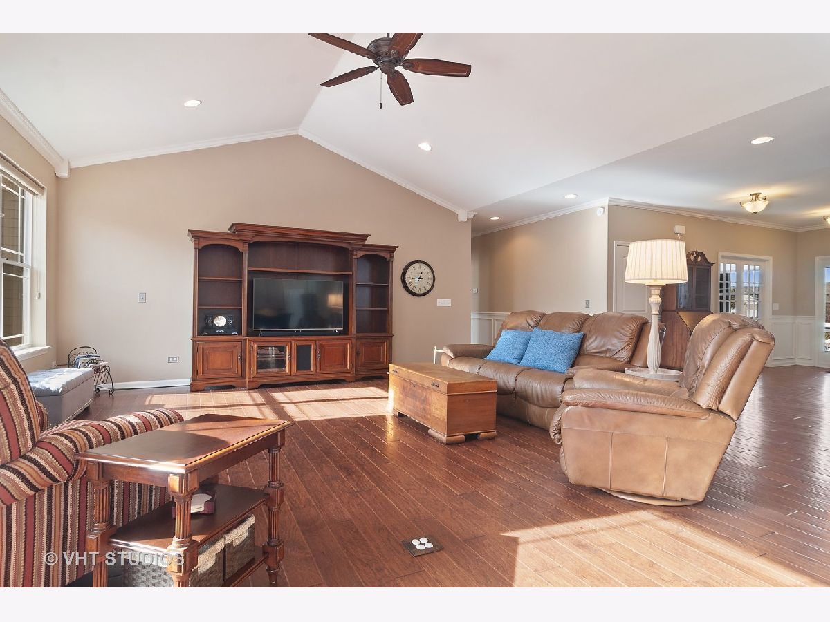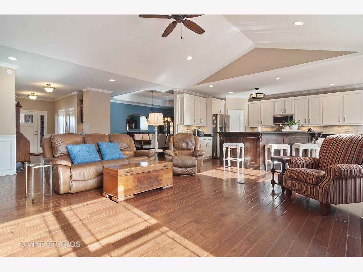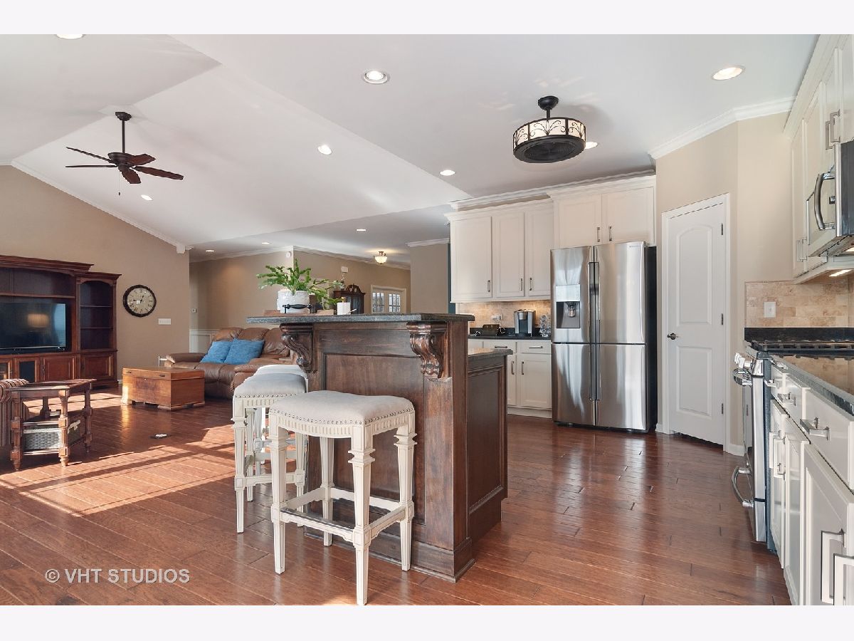 Meticulously maintained well built ranch with endless upgrades! Beautiful 5" plank engineered hardwood floors featuring an elegant time worn scraped finish, on most of main level. Extensive trim package throughout home. Office has French doors and beautiful built ins. Large dining room with wainscoting. Full gourmet kitchen with breakfast bar, all stainless steel appliances, backsplash, pantry closet and eating area. Great space for entertaining. Tons of natural light throughout. Kitchen is open to family room with vaulted ceiling, custom mantle and gas fireplace. Upgraded pads and carpet in bedrooms. Fall in love with the completely finished lower level with a walkout! Two additional bedrooms in basement with amazing full bath, wet bar sink, granite counter. Host all of your parties in this great space! Custom window treatments. Unique storage which could be used as a "3rd garage" in the unfinished section of basement. Perfect space for outdoor furniture, lawn mower, etc. Professional landscaping in both the front and back yard, driveway ribbons, no maintenance deck and stamped concrete patio. Minutes from METRA. Close to shopping, dining, parks, elementary school. This is truly a maintenance free home and one you won't want to miss!!