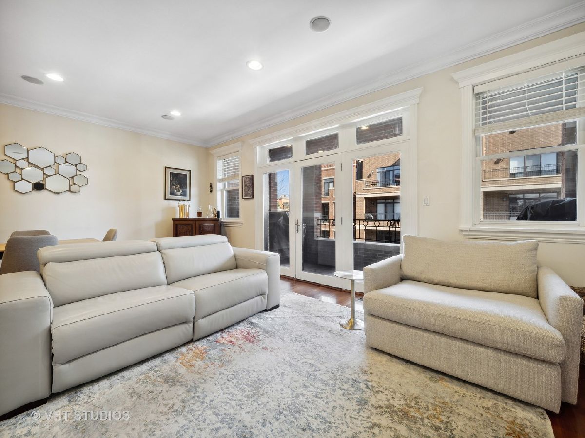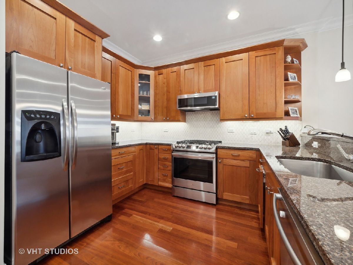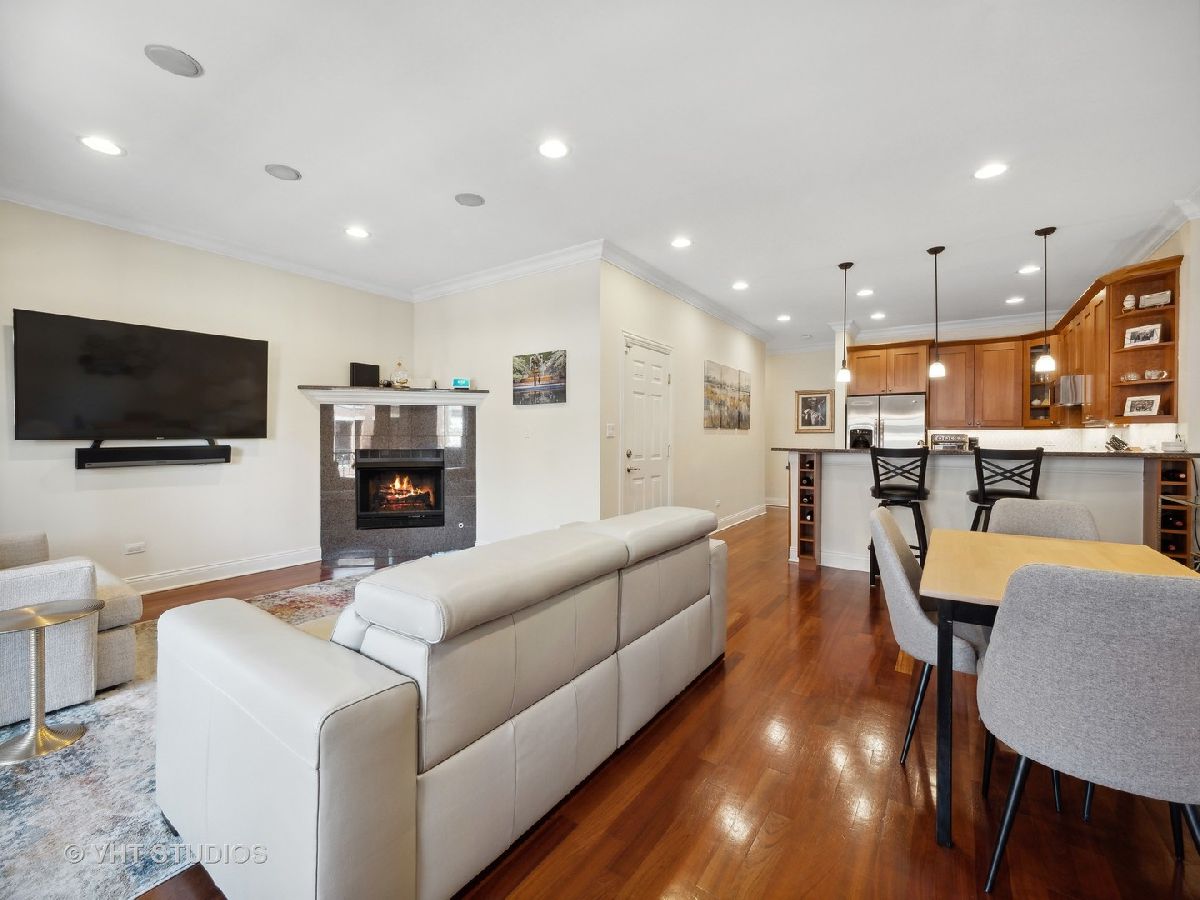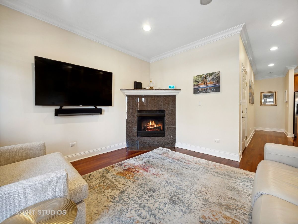 Ready for Immediate Occupancy! Enjoy living in the fabulous location of LAKEVIEW/SOUTHPORT CORRIDOR in this extra wide, open concept unit that features Brazilian cherry floors throughout, crown molding, 2 outdoor spaces and an attached heated garage. Winter months are made cozy in the large living room by the gas fireplace. The spacious dining area is perfect for entertaining. Both living and dining have access to a covered balcony the full width of the building perfect for entertaining and grilling. All stainless kitchen has new gas range oven, new microwave, cherry cabinets, granite counters, new backsplash, new undercabinet lighting and a breakfast bar with built in wine racks. The HUGE primary bedroom suite has direct access to the large deck and boasts a custom organized walk-in closet, luxury bath with dual sinks, jacuzzi tub, steam shower with large rain head and 2 additional shower heads and heated floors. Access to the building is via secure front door with security system while access to the garage is by second interior rear staircase. The wide hallway hosts a large coat closet with new custom organization, side by side washer & dryer with storage and mechanical closet. Living room & Primary bedroom have in-ceiling surround sound speakers. Unit completely freshly painted in September 2023. There is an additional common storage room on the first floor and the racks on the east side of the garage will remain. One block to Whole Foods, steps to Target and ALL the fabulous shops and restaurants along Southport make this a great place to call home!
