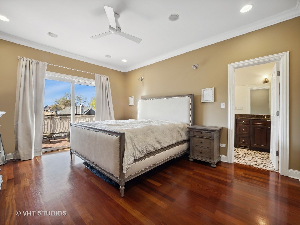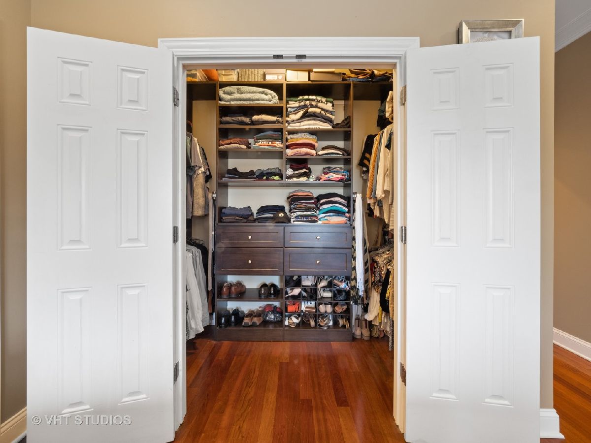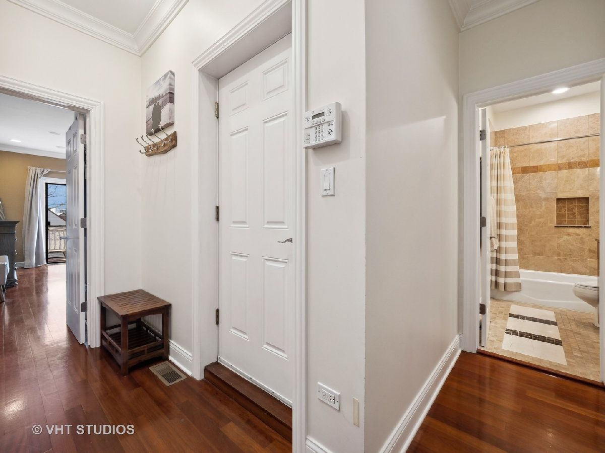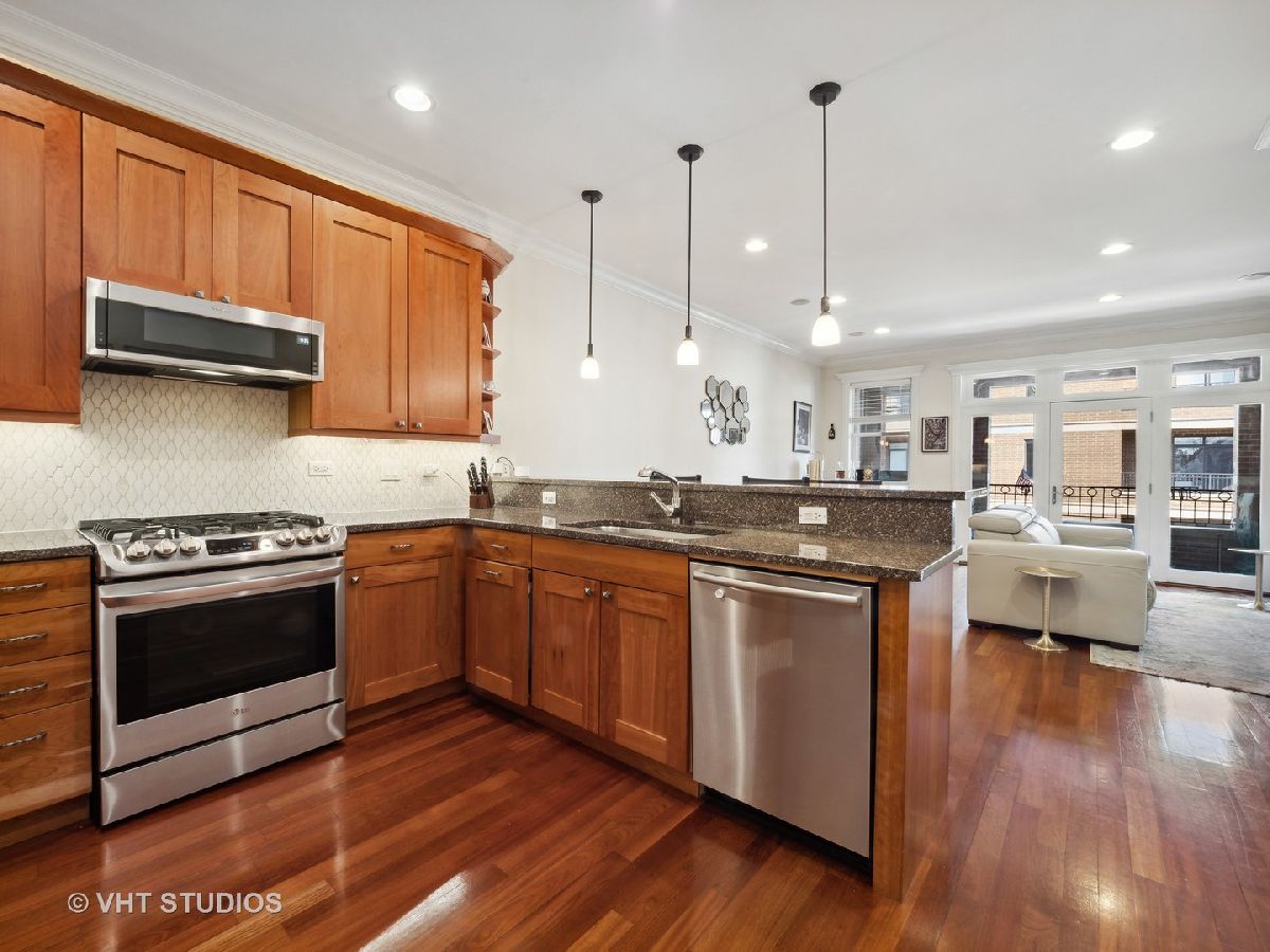 Ready for Immediate Occupancy! Enjoy living in the fabulous location of LAKEVIEW/SOUTHPORT CORRIDOR in this extra wide, open concept unit that features Brazilian cherry floors throughout, crown molding, 2 outdoor spaces and an attached heated garage. Winter months are made cozy in the large living room by the gas fireplace. The spacious dining area is perfect for entertaining. Both living and dining have access to a covered balcony the full width of the building perfect for entertaining and grilling. All stainless kitchen has new gas range oven, new microwave, cherry cabinets, granite counters, new backsplash, new undercabinet lighting and a breakfast bar with built in wine racks. The HUGE primary bedroom suite has direct access to the large deck and boasts a custom organized walk-in closet, luxury bath with dual sinks, jacuzzi tub, steam shower with large rain head and 2 additional shower heads and heated floors. Access to the building is via secure front door with security system while access to the garage is by second interior rear staircase. The wide hallway hosts a large coat closet with new custom organization, side by side washer & dryer with storage and mechanical closet. Living room & Primary bedroom have in-ceiling surround sound speakers. Unit completely freshly painted in September 2023. There is an additional common storage room on the first floor and the racks on the east side of the garage will remain. One block to Whole Foods, steps to Target and ALL the fabulous shops and restaurants along Southport make this a great place to call home!