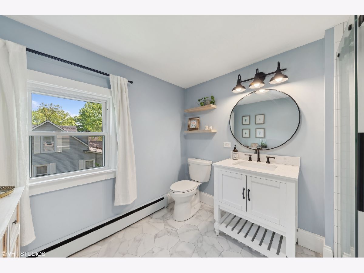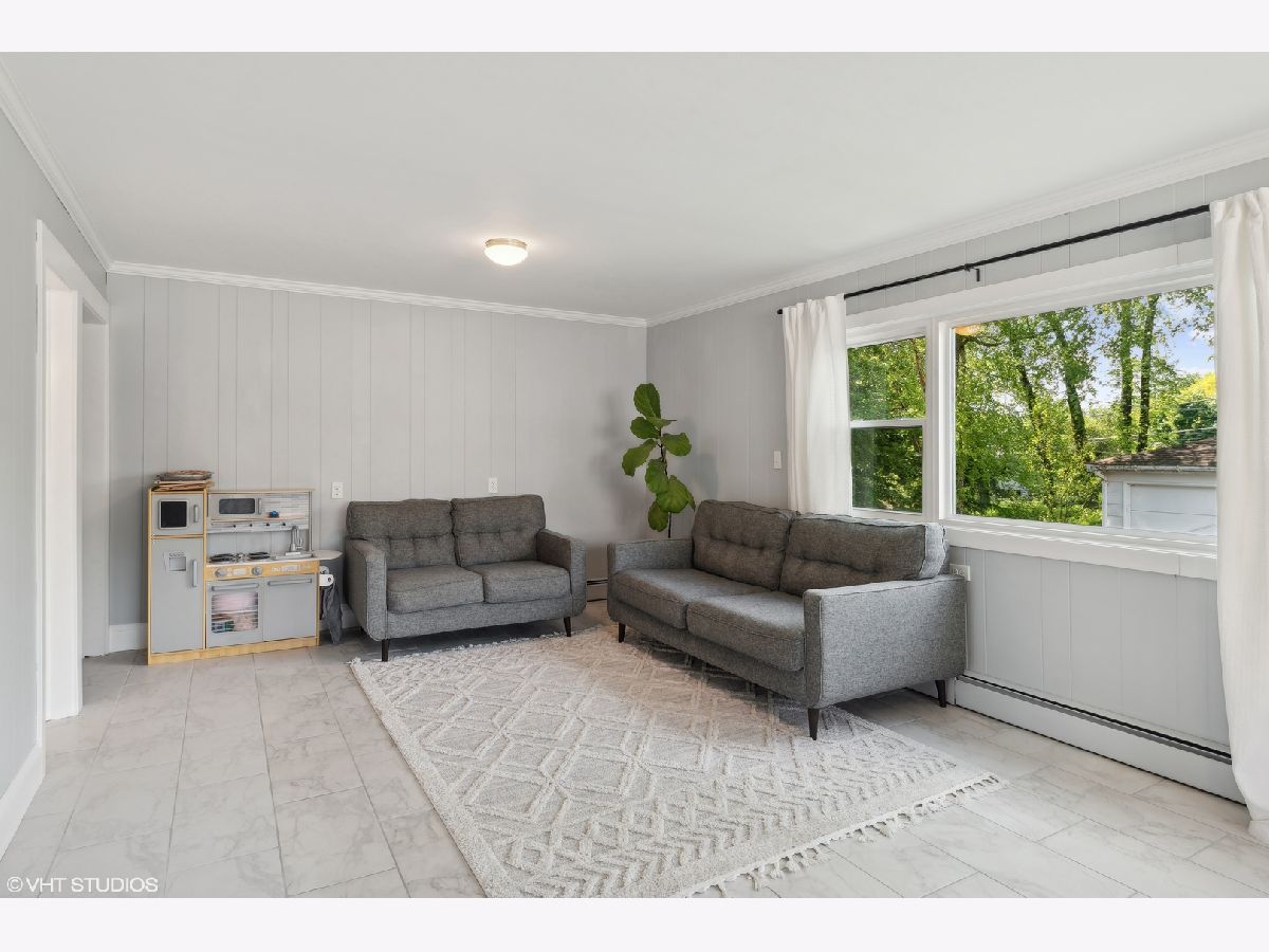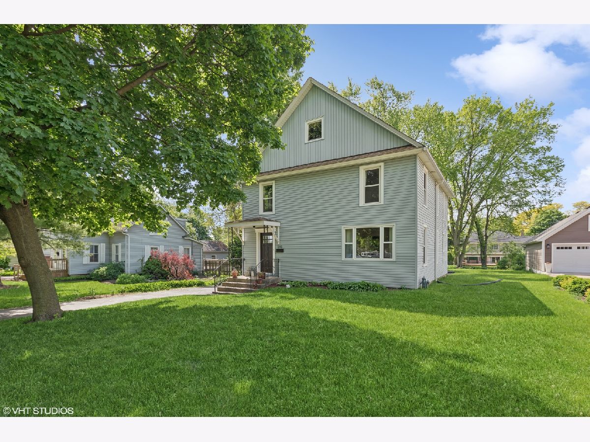 Welcome to this incredibly charming modern farmhouse in a perfect in-town location! Enjoy a blend of timeless craftsmanship like rich hardwood floors and crown molding with modern enhancements like a newly renovated kitchen and bathrooms! A sweet covered front porch welcomes you to the spacious foyer and living room with refinished original hardwood floors. The newly renovated kitchen features new cabinets, stainless steel sink, floating shelving, concrete countertops and new lighting. Flowing effortlessly from the kitchen is an open-concept dining room and family room flooded with natural light from large picture windows overlooking the backyard. The first floor also offers a bedroom and newly remodeled full bath with tub, ideal for a home office or guest space. Upstairs, discover a light-filled cozy loft and three generously sized bedrooms, each featuring new hardwood floors and baseboards, and ceiling fans, large closets with built-ins, and a renovated hallway bath with a stand-up glass shower and subway tile. The unfinished basement presents endless possibilities, whether as a playroom, home gym, or hobby space, with exterior access and abundant storage. Outside, the detached two-car garage is complemented by a generous turnaround asphalt driveway, while the backyard steals the show with its lush landscaping and ample space for outdoor activities. New staircase going to 2nd floor with hardwood floors. New vinyl windows and new window trim throughout (2021), new front door, new water heater (2024), new service line and 200 amp electric panel. Experience the convenience of walking to nearby parks, Kemmerling pool, library, shopping, restaurants, coffee shops, and the Metra station. Spring Hills Elementary, Roselle Middle School, Lake Park High School. Welcome home!
