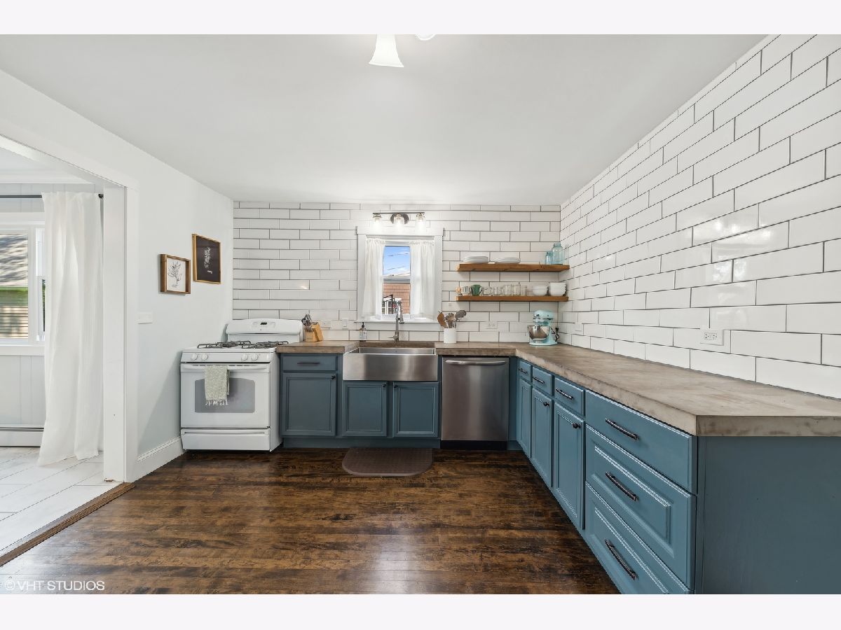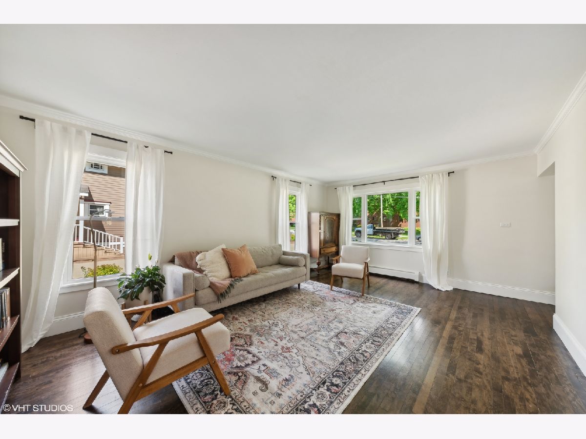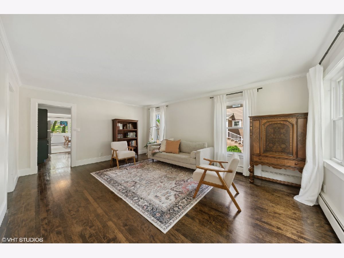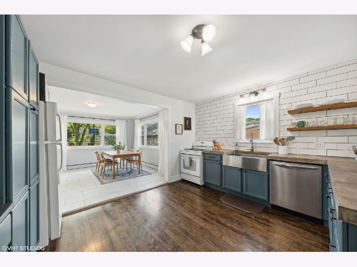 Welcome to this incredibly charming modern farmhouse in a perfect in-town location! Enjoy a blend of timeless craftsmanship like rich hardwood floors and crown molding with modern enhancements like a newly renovated kitchen and bathrooms! A sweet covered front porch welcomes you to the spacious foyer and living room with refinished original hardwood floors. The newly renovated kitchen features new cabinets, stainless steel sink, floating shelving, concrete countertops and new lighting. Flowing effortlessly from the kitchen is an open-concept dining room and family room flooded with natural light from large picture windows overlooking the backyard. The first floor also offers a bedroom and newly remodeled full bath with tub, ideal for a home office or guest space. Upstairs, discover a light-filled cozy loft and three generously sized bedrooms, each featuring new hardwood floors and baseboards, and ceiling fans, large closets with built-ins, and a renovated hallway bath with a stand-up glass shower and subway tile. The unfinished basement presents endless possibilities, whether as a playroom, home gym, or hobby space, with exterior access and abundant storage. Outside, the detached two-car garage is complemented by a generous turnaround asphalt driveway, while the backyard steals the show with its lush landscaping and ample space for outdoor activities. New staircase going to 2nd floor with hardwood floors. New vinyl windows and new window trim throughout (2021), new front door, new water heater (2024), new service line and 200 amp electric panel. Experience the convenience of walking to nearby parks, Kemmerling pool, library, shopping, restaurants, coffee shops, and the Metra station. Spring Hills Elementary, Roselle Middle School, Lake Park High School. Welcome home!