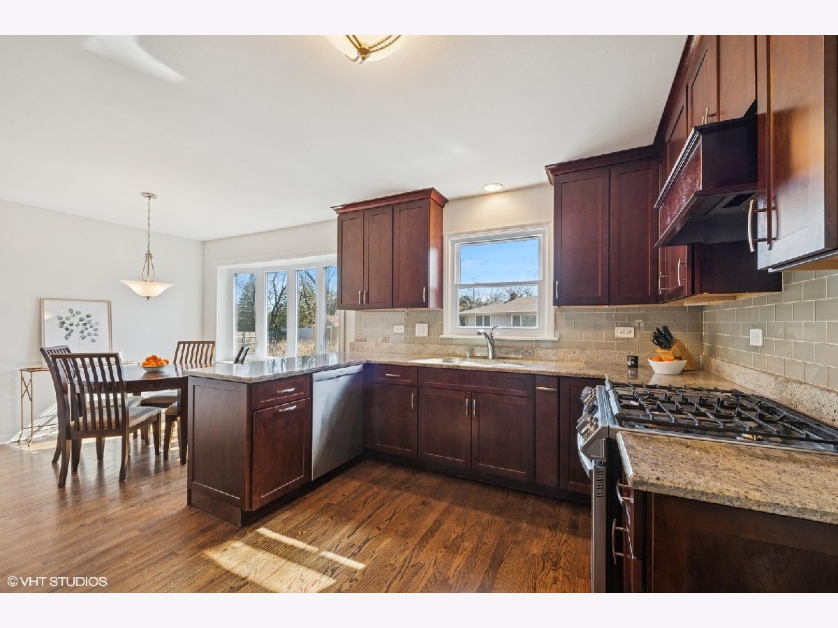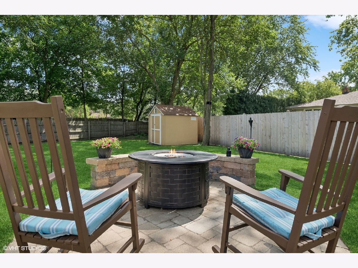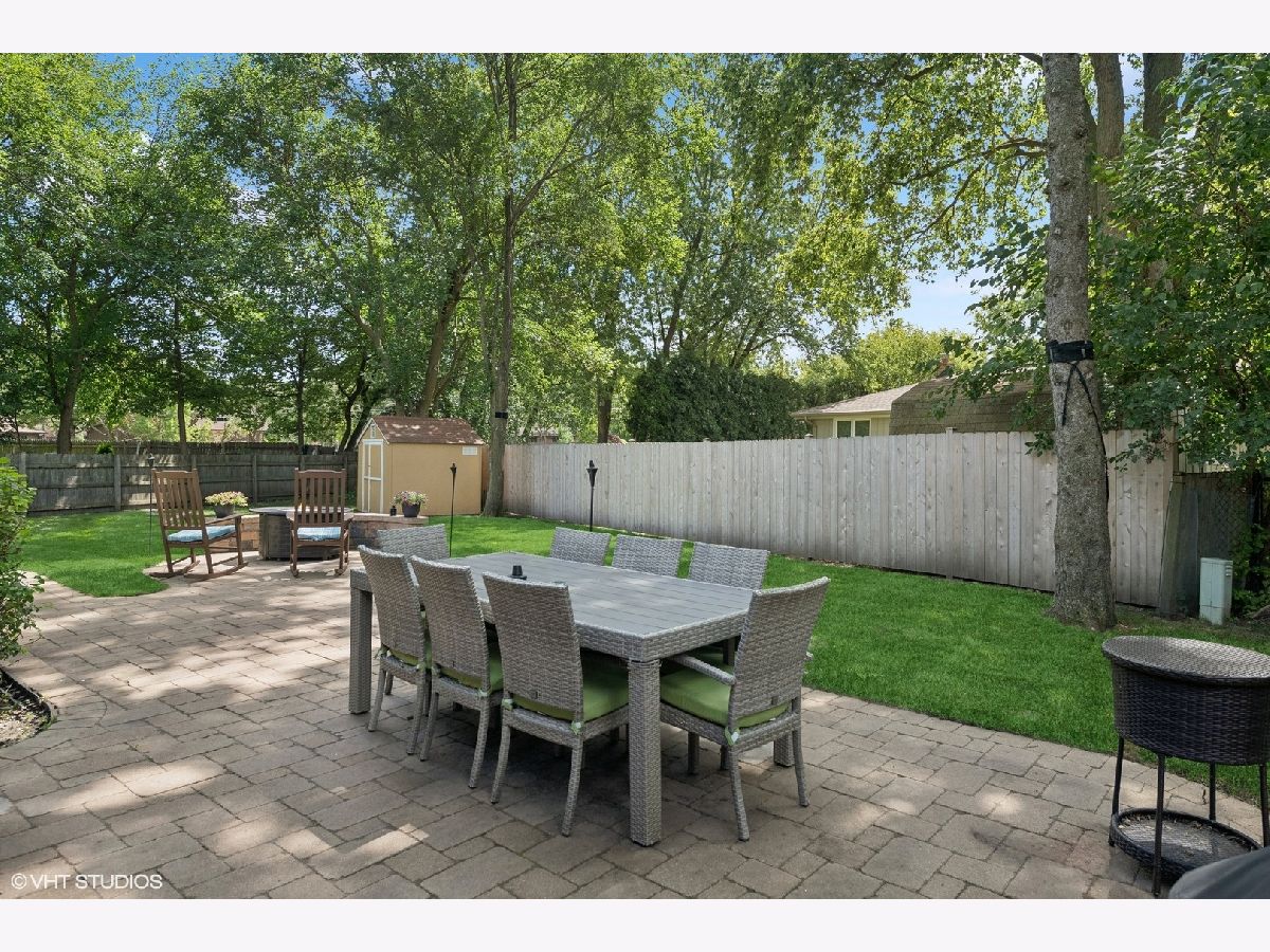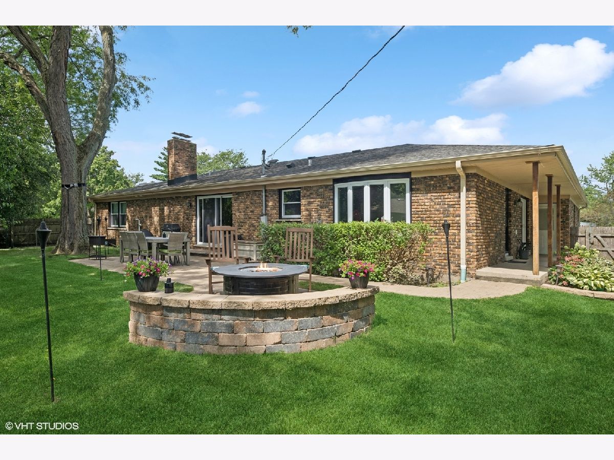 A timeless all-brick ranch with a sun-drenched southern-exposed backyard, this impeccably maintained home blends classic charm with modern updates. Step into the inviting foyer with rich hardwood floors that flow throughout the main living spaces. The living and dining rooms offer effortless entertaining, with the dining room opening to the side yard through sleek sliding glass doors. The kitchen is a chef's dream, featuring granite countertops, a stylish glass subway tile backsplash, and premium stainless steel appliances, including a Samsung 5-burner gas range, LG refrigerator, and Bosch dishwasher. A bright breakfast nook with a bay window and pantry closet adds to the functionality. The family room is a warm and inviting retreat with wood beams, recessed lighting, and a wood-burning fireplace framed by slate and a wood mantle-seamlessly extending to the brick paver patio through sliding glass doors. The primary suite is a serene haven with hardwood floors, dual closets, and a spa-inspired bath with travertine flooring, a granite vanity, and a Kohler shower/tub with tumbled marble surround. Two additional bedrooms offer ample storage and share a well-appointed hall bath with a double vanity and ceramic tile finishes. A powder room and a spacious laundry room with a utility sink and Samsung washer/dryer complete the main level. The finished basement expands the living space with a recreation room featuring wood laminate flooring, recessed lighting, and wood paneling, plus a generous storage and utility area. Outside, a fully fenced yard with a paver patio, direct gas line for grilling, and a shed ensures both privacy and convenience. Thoughtful updates include a new roof and windows (2013), furnace and AC (2014), refinished basement (2020), and updated appliances. Ideally located and move-in ready, this home is a true blend of quality, comfort, and style.