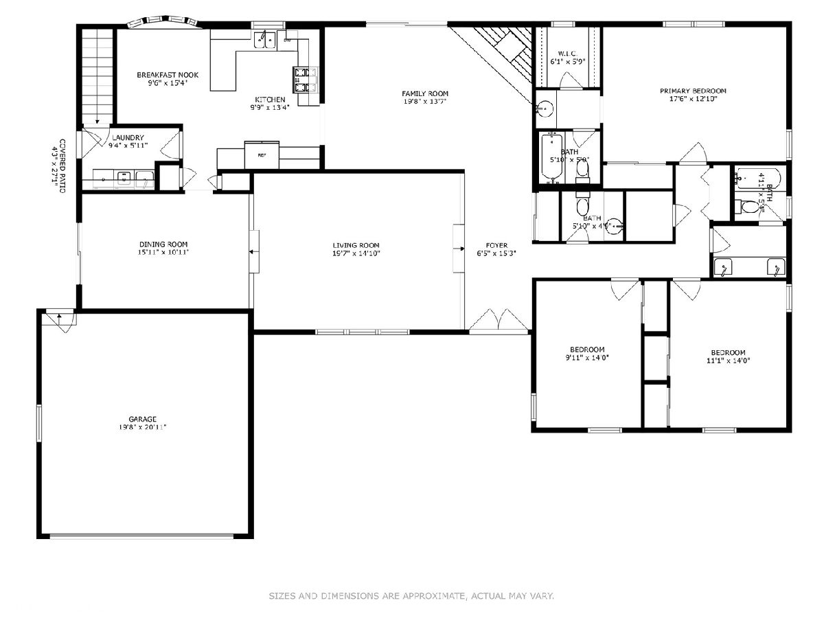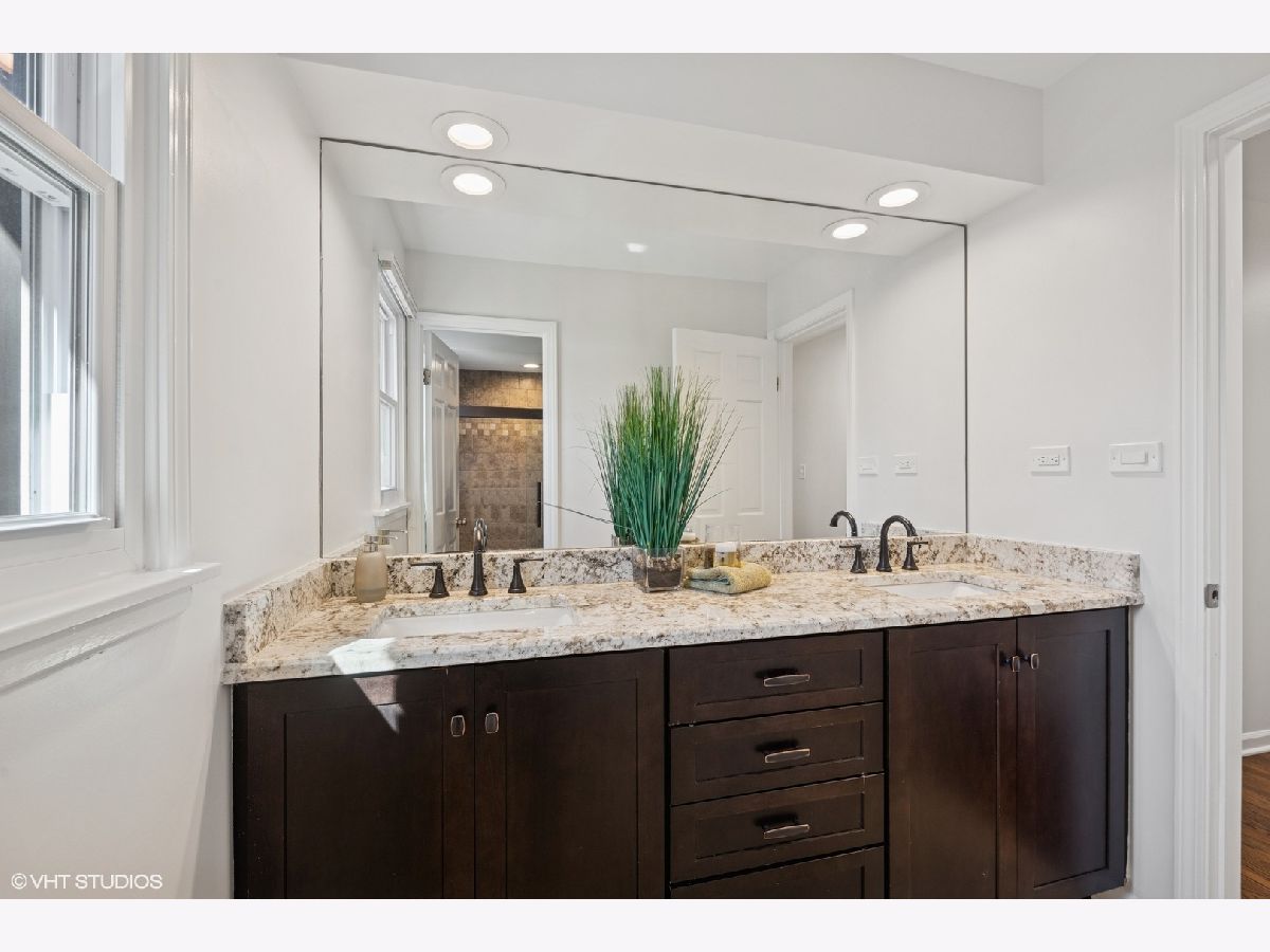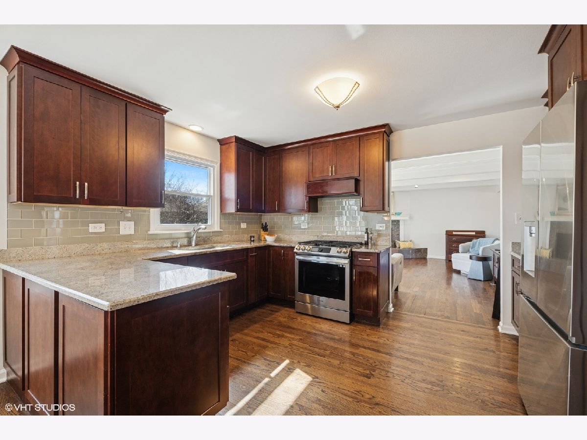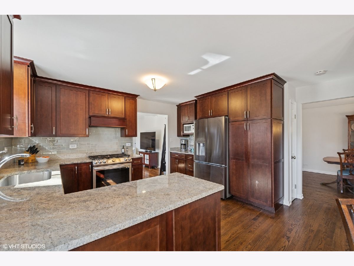 A timeless all-brick ranch with a sun-drenched southern-exposed backyard, this impeccably maintained home blends classic charm with modern updates. Step into the inviting foyer with rich hardwood floors that flow throughout the main living spaces. The living and dining rooms offer effortless entertaining, with the dining room opening to the side yard through sleek sliding glass doors. The kitchen is a chef's dream, featuring granite countertops, a stylish glass subway tile backsplash, and premium stainless steel appliances, including a Samsung 5-burner gas range, LG refrigerator, and Bosch dishwasher. A bright breakfast nook with a bay window and pantry closet adds to the functionality. The family room is a warm and inviting retreat with wood beams, recessed lighting, and a wood-burning fireplace framed by slate and a wood mantle-seamlessly extending to the brick paver patio through sliding glass doors. The primary suite is a serene haven with hardwood floors, dual closets, and a spa-inspired bath with travertine flooring, a granite vanity, and a Kohler shower/tub with tumbled marble surround. Two additional bedrooms offer ample storage and share a well-appointed hall bath with a double vanity and ceramic tile finishes. A powder room and a spacious laundry room with a utility sink and Samsung washer/dryer complete the main level. The finished basement expands the living space with a recreation room featuring wood laminate flooring, recessed lighting, and wood paneling, plus a generous storage and utility area. Outside, a fully fenced yard with a paver patio, direct gas line for grilling, and a shed ensures both privacy and convenience. Thoughtful updates include a new roof and windows (2013), furnace and AC (2014), refinished basement (2020), and updated appliances. Ideally located and move-in ready, this home is a true blend of quality, comfort, and style.