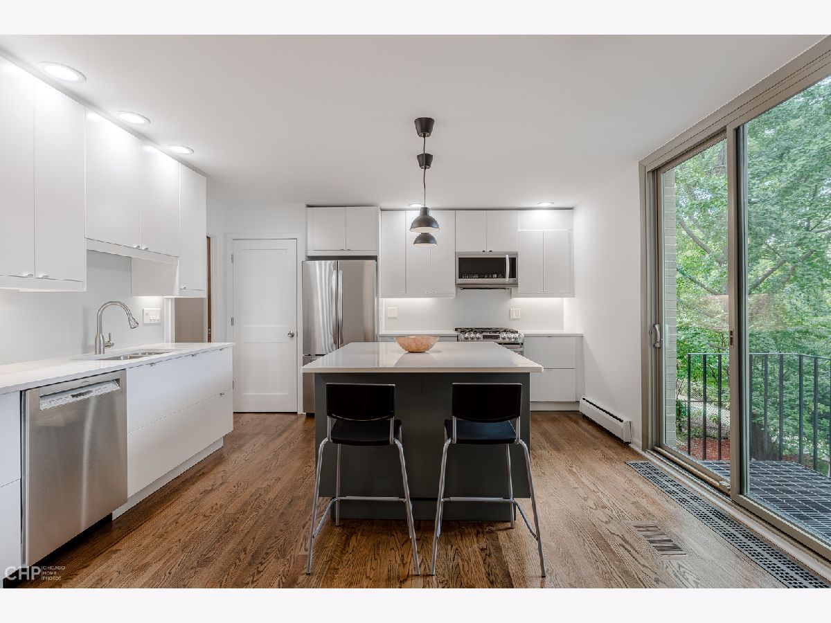 Located near the University of Chicago, the lake and public transportation, this "E1" modernist townhouse originally designed by I.M. Pei in the early 60's has been beautifully updated for current tastes. The systems have been modernized, the kitchen and baths redone in full. You will find four bedrooms, 3 baths, living room and large kitchen/dining combination on the middle level, plus a very large family room off of the back yard on the lower level. Three levels above ground, all with warm refinished wood floors and fresh paint. New high efficiency forced air furnace and AC complement the existing circulating hot water system. Brand new kitchen appliances (LG and Bosch) with manufacturer warranty. 4 year warranty on the roof. All windows less than 3 years old. The association is very well run and a favorite in Hyde Park because of the private central common area with play structure. One parking space per townhouse on the private drive, with another occasional guest spot if available. Seller is a licensed Real Estate Broker in Illinois.