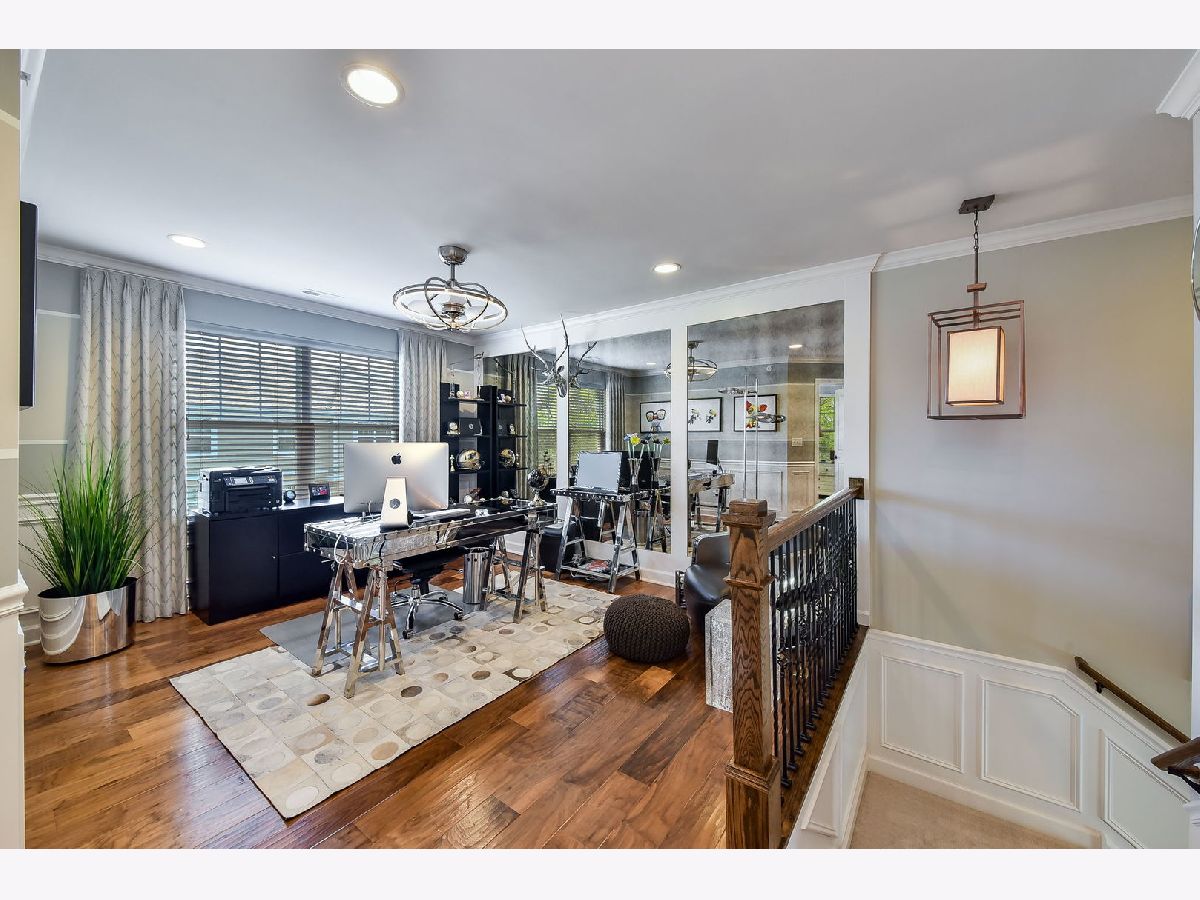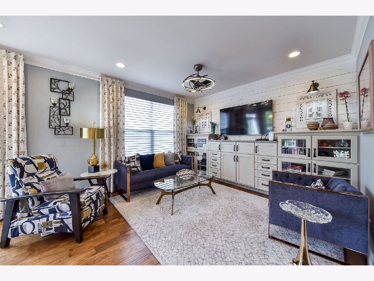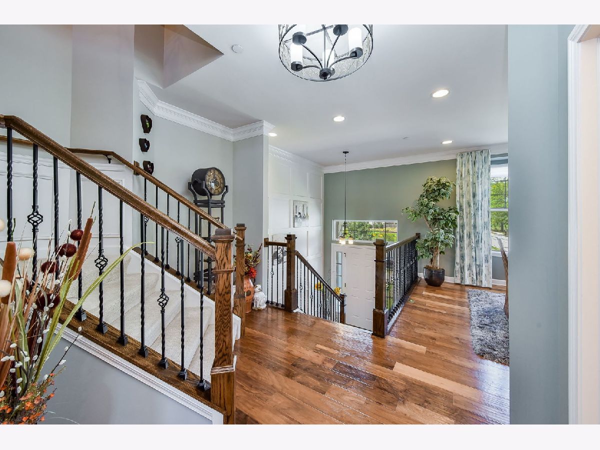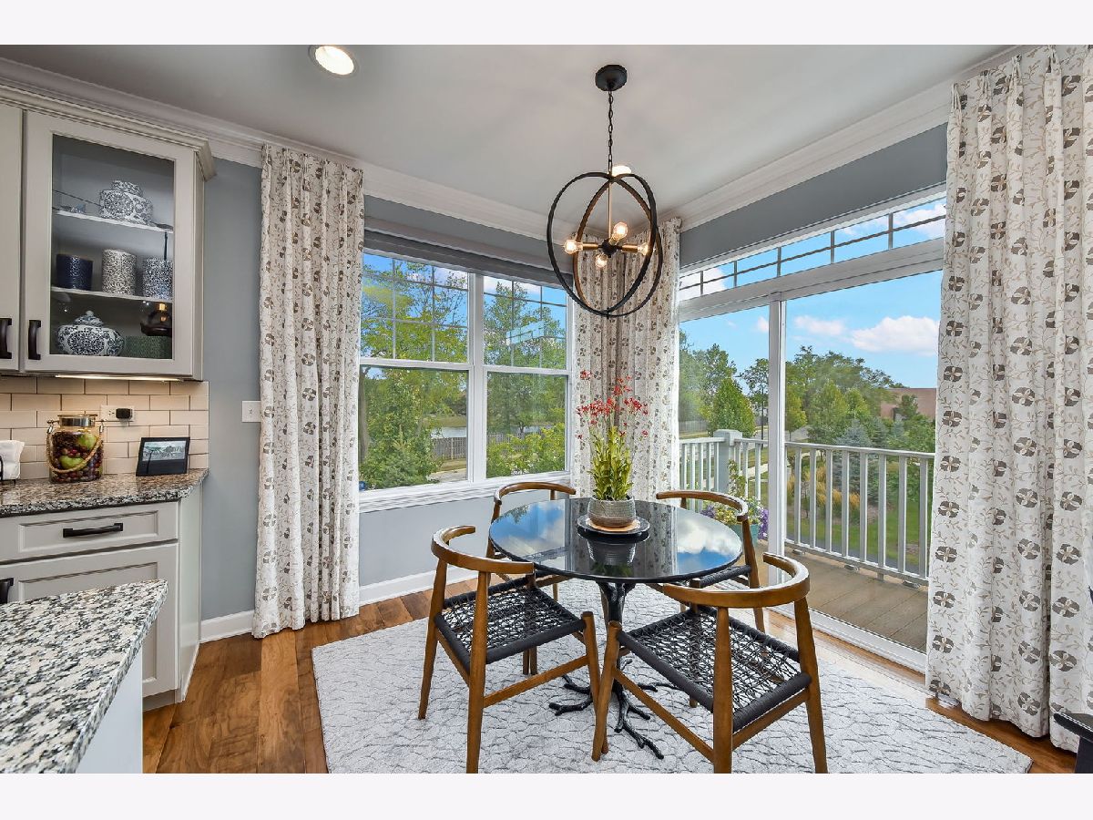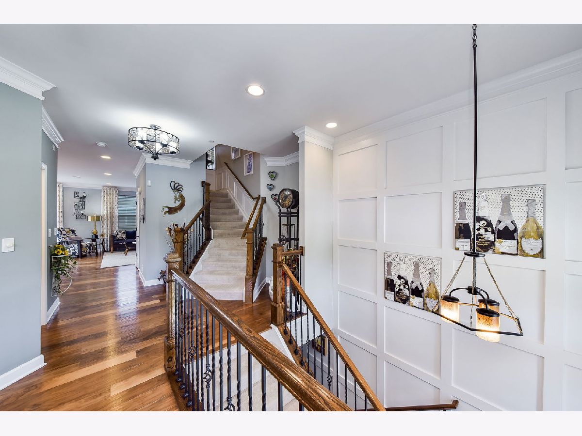 Luxurious builder's model, further enhanced by owner. A designer's masterpiece everywhere your eyes take you! Custom paint designs, wainscoting, shiplap, crown moldings, stylish ceiling fans, lighting, plumbing fixtures and built in sound system on all three levels. Beautiful window treatments blend with designers' color palate. Plentiful closets thoughtfully planned and stylish. Too many built-ins and upgrades to mention, a must see! Entry foyer wainscoted accent wall soars 18'6" from bonus room floor to formal dining room ceiling. First floor 9'ceiling, beautiful hand scraped hardwood floors in Family room, dining room, breakfast area, kitchen and powder room on main level. Kitchen detailed with 42" latte cabinets with under lighting, granite countertops, farmhouse sink, 8' island, spacious walk-in pantry and stainless-steel appliances. Open floor plan with wide staircases and landings add to a feel of a single-family home. Hardwood railings richly stained with stylish wrought iron spindles. Built-ins on all levels create great focal points, maximizing living space, storage and customized T.V. viewing. All the windows have Hunter Douglas Blinds. This end unit overlooks a pond and single family estate. 2 Bedrooms with lofted study has 2 full baths on third level with 2 half baths rounding out each level. Primary bedroom has tray ceilings with en-suite bathroom; honeycomb tiles in oversized walk-in shower, designer walk-in closet with make-up table. Tiled designs in both upstairs bathrooms, plus convenient laundry room with upgraded washer, dryer and cabinetry. Oversized garage has built-in storage closets and work bench. Commuters dream 5 minutes to downtown Naperville shopping, dining, train and route 88. Walkable to numerous popular restaurants and the Renaissance happening along East Ogden Ave in Naperville like the new Costco, Amazon Fresh, H-Mart and many more. This is a great north Naperville location to call home. You will love the convenience of living here.