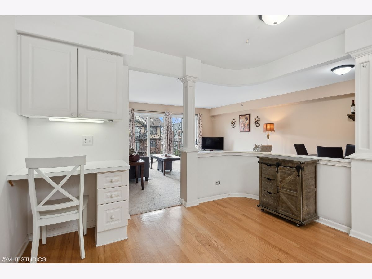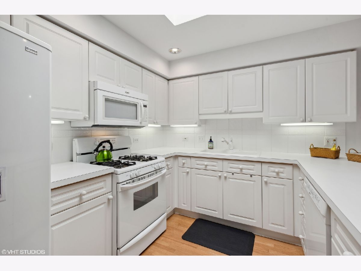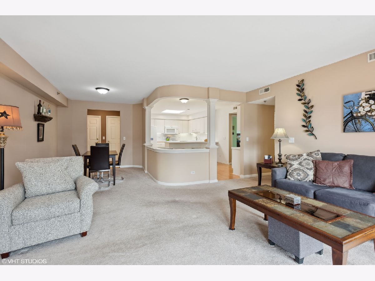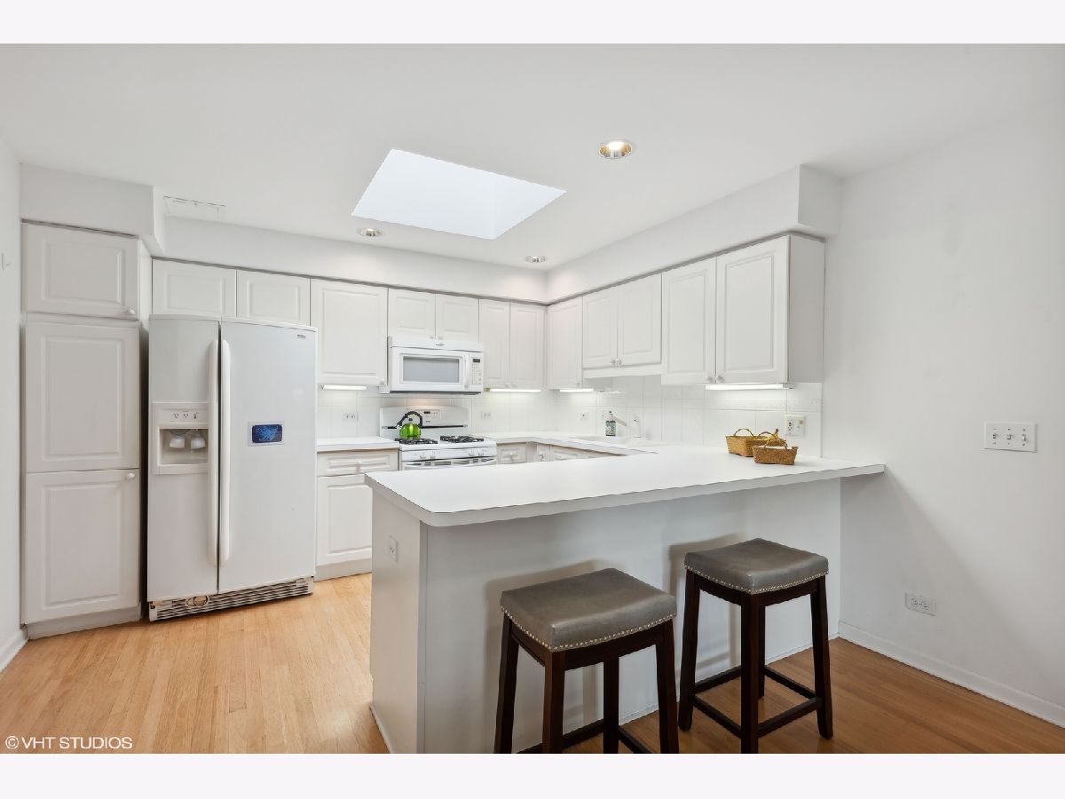 This spacious TOP FLOOR END UNIT has 2 bedrooms and 2 full bathrooms in the heart of downtown Mt Prospect, is just steps from the Metra and in the walking distance to many restaurants and shopping. This end unit condo also boasts one of the largest layouts in the complex. Enjoy a bright open floor plan, featuring a primary bedroom with a walk-in closet and primary bathroom with window for extra natural light. This large eat in kitchen boasts white cabinets, plenty of counter space and a skylight that pours in natural light. The open kitchen flows nicely to the charming dining room and expansive living room. Enjoy the beauty of the courtyard below and the scenic downtown area from your large private balcony. Convenience is key with in-unit full size laundry and garage parking. Make this warm and inviting space your new home!