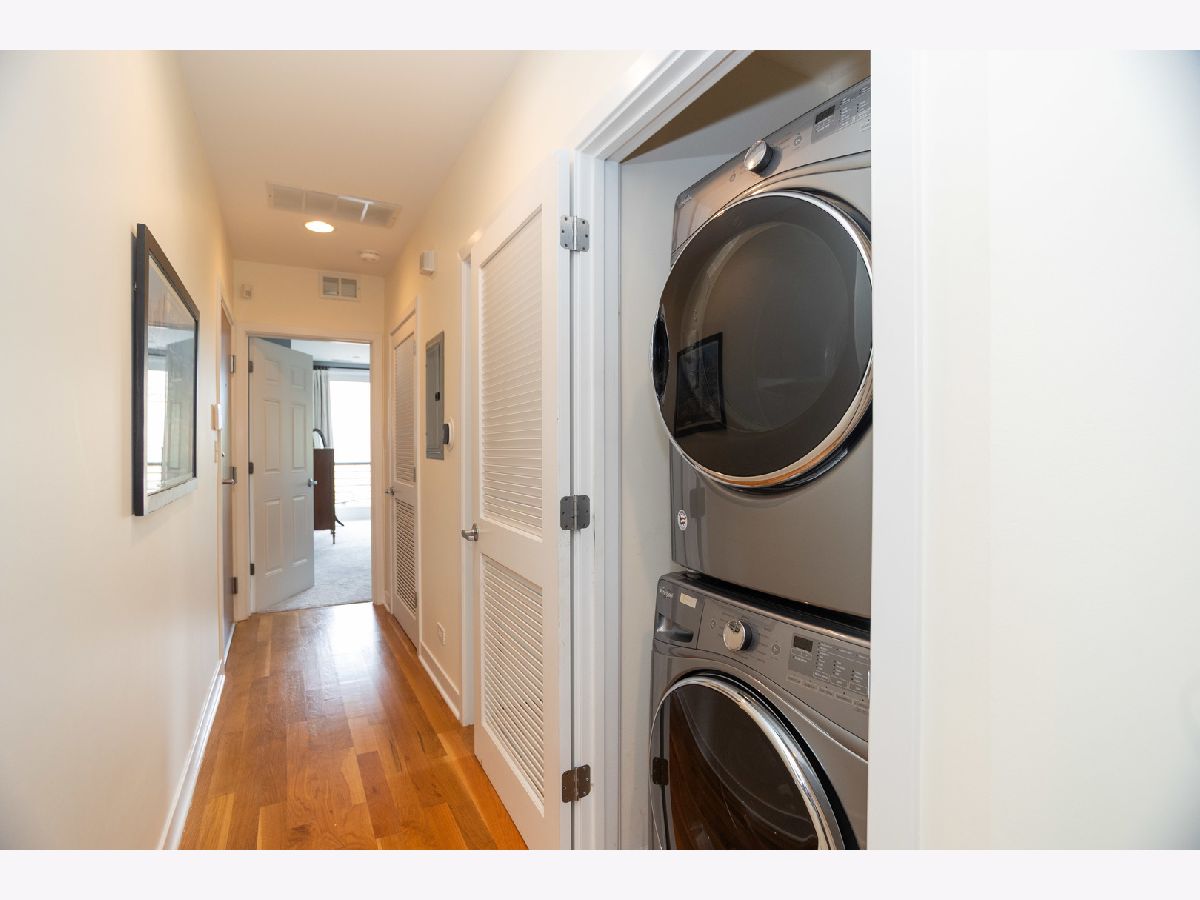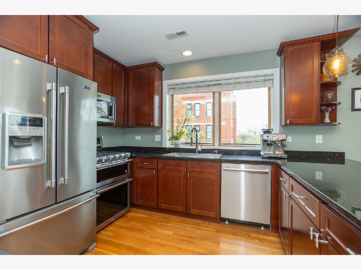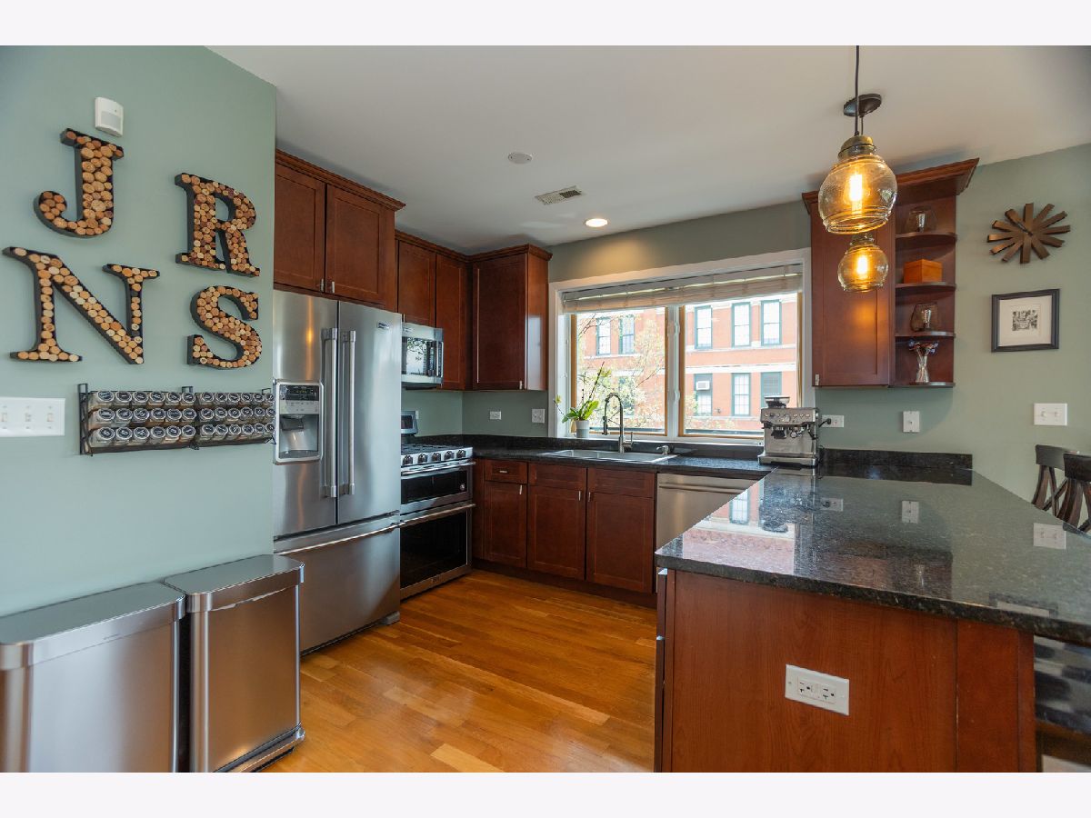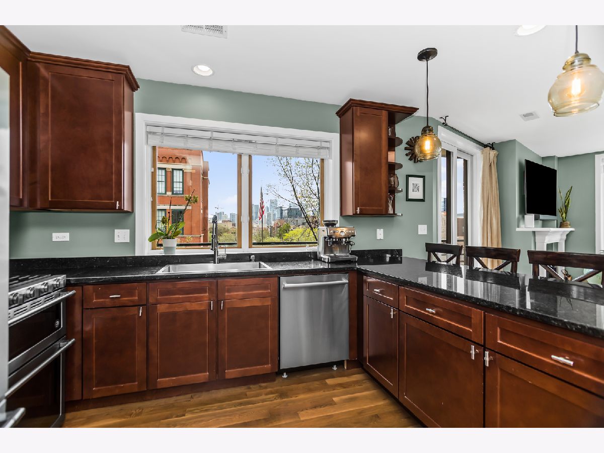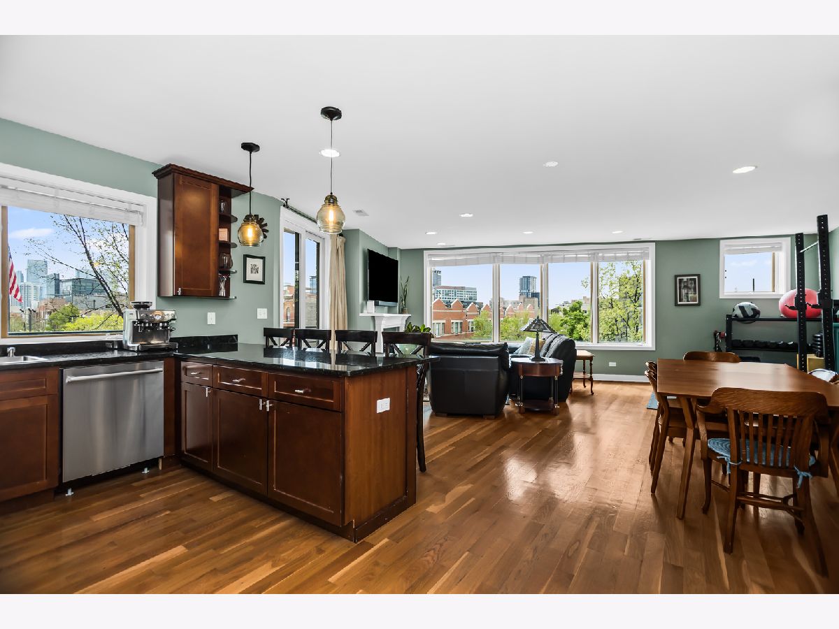 (SEE PROFESSIONAL VIDEO AND MATTERPORT 3D TOUR ATTACHMENTS) Spectacular skyline views greet you the second you step off the direct-access elevator into this gorgeous newer-construction 3rd floor West Town/ Noble Square condo. This is absolutely not the typical cookie cutter 2BR/2Bth layout you've seen a thousand times. Extra-wide great room with gleaming hardwood floors, cozy WBFP and east-facing balcony; beautifully outfitted granite/stainless kitchen with breakfast peninsula; plenty of room for a dining table. Huge windows provide for amazing natural light during the day, and a stellar skyline view at night. Spacious main bedroom with walk-in closet, luxe en-suite bath with whirlpool tub and separate shower, double basin vanity and a private balcony. Great closets in guest bedroom. Large guest bath with linen closet. Numerous home office options in this thoughtfully designed floorplan. Garage parking and additional storage. Super convenient neighborhood full of great dining, shopping and entertainment spots - easy walk to both Fulton Market and Wicker Park hotspots, one block to newly renovated Bickerdike Square Park, easy access to expressways! (EXCLUDE BAR STOOLS, GAS GRILL, HANGING ART GLASS WINDOWS IN MAIN BR)